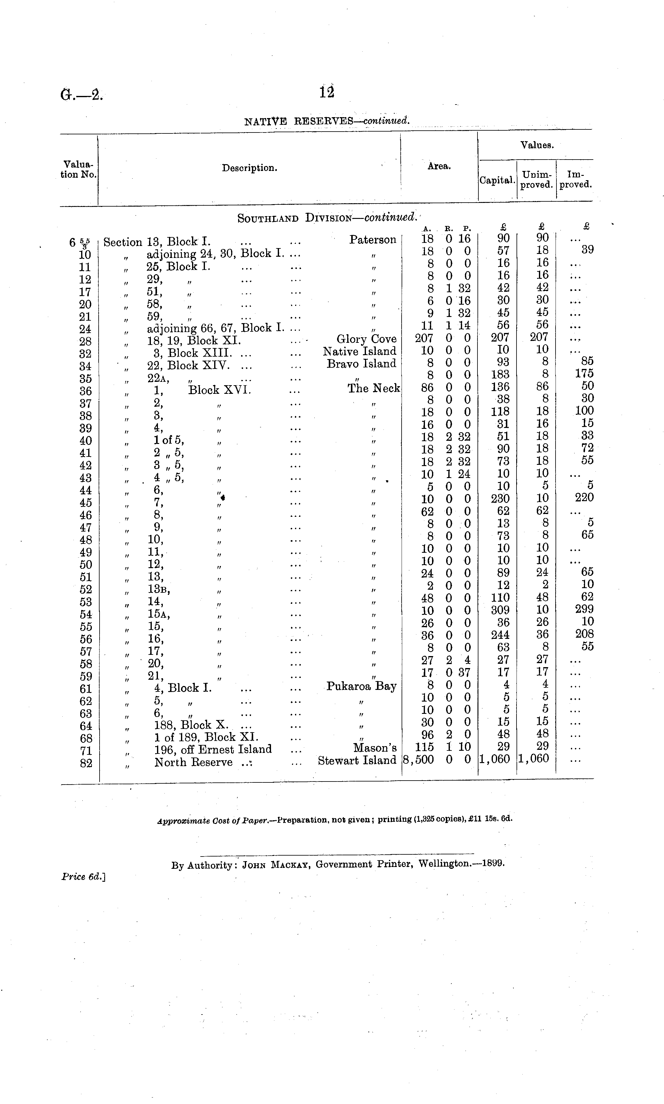 Values. Valuation No. Description. I Area. „ ., , Unim- ImCapital. proved provea . Southland Division — continv. xd. A. 18 18 8 8 8 6 9 11 207 10 8 8 86 8 18 16 18 18 18 10 5 10 62 8 8 10 10 24 2 48 10 26 36 8 27 17 8 10 10 30 96 115 8,500 B. P. 0 16 0 0 0 0 0 0 1 32 0 16 1 32 1 14 0 0 0 0 0 0 0 0 0 0 0 0 0 0 0 0 2 32 2 32 2 32 1 24 0 0 0 0 0 0 0 0 0 0 0 0 0 0 0 0 0 0 0 0 0 0 0 0 0 0 0 0 2 4 0 37 0 0 0 0 0 0 0 0 2 0 1 10 0 0 £ 90 57 16 16 42 30 45 56 207 10 93 183 136 38 118 31 51 90 73 10 10 230 62 13 73 10 10 89 12 110 309 36 244 63 27 17 4 5 5 15 48 29 1,060 £ 90 18 16 16 42 30 45 56 207 10 8 8 86 8 18 16 18 18 18 10 5 10 62 8 8 10 10 24 2 48 10 26 36 8 27 17 4 5 5 15 48 29 1,060 £ 6 V 10 11 12 17 20 21 24 28 32 34 35 36 37 38 39 40 41 42 43 44 45 46 47 48 49 50 51 52 53 54 55 56 57 58 59 61 62 63 64 68 71 82 Section 13, Block I. ... ... Paterson adjoining 24, 30, Block I. ... „ 25, Block I. „ 29, „ „ 51, „ „ 58, „ r, . „ 59, „ adjoining 66, 67, Block I. ... 18, 19, Block XI. ... - Glory Cove 3, Block XIII. ... ... Native Island 22, Block XIV. ... ... Bravo Island „ 22a, „ 1, Block XVI. ... The Neck 2, 3, 4, Iof5, 2 „ 5, 3 „ 5, „ . 4 ,,5, : ?: :• ■ ::: : 8, 9, „ 10, „ ii, » ••• ; „ i2, „ ... ■ „ 13, „ 13b, „ 14, „ 15a, „ 15, „ 16, * 17, „ 20, 21, 4, Block I. ... ... Pukaroa Bay 5, „ 6, „ 188, Block X. ... 1 of 189, Block XI. 196, off Ernest Island ... Mason's „ North Eeserve ..-. ... Stewart Island 39 85 175 50 30 100 15 33 72 55 5 220 K 0 65 65 10 62 299 10 208 55