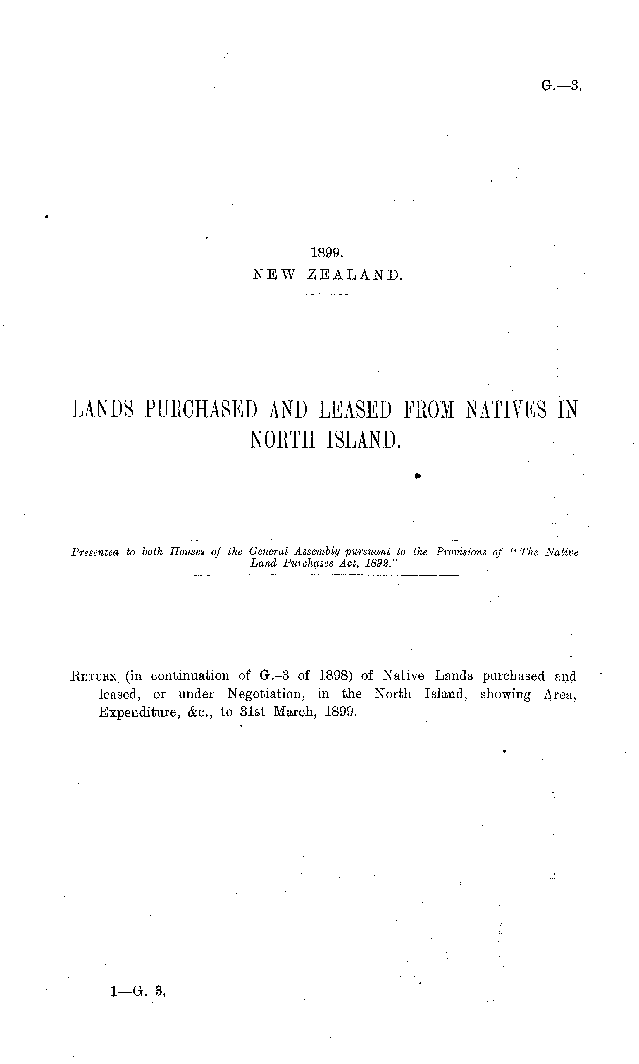 Eetuen (in continuation of G-.-3 of 1898) of Native Lands purchased and leased, or under Negotiation, in the North Island, showing Area, Expenditure, &c, to 31st March, 1899.