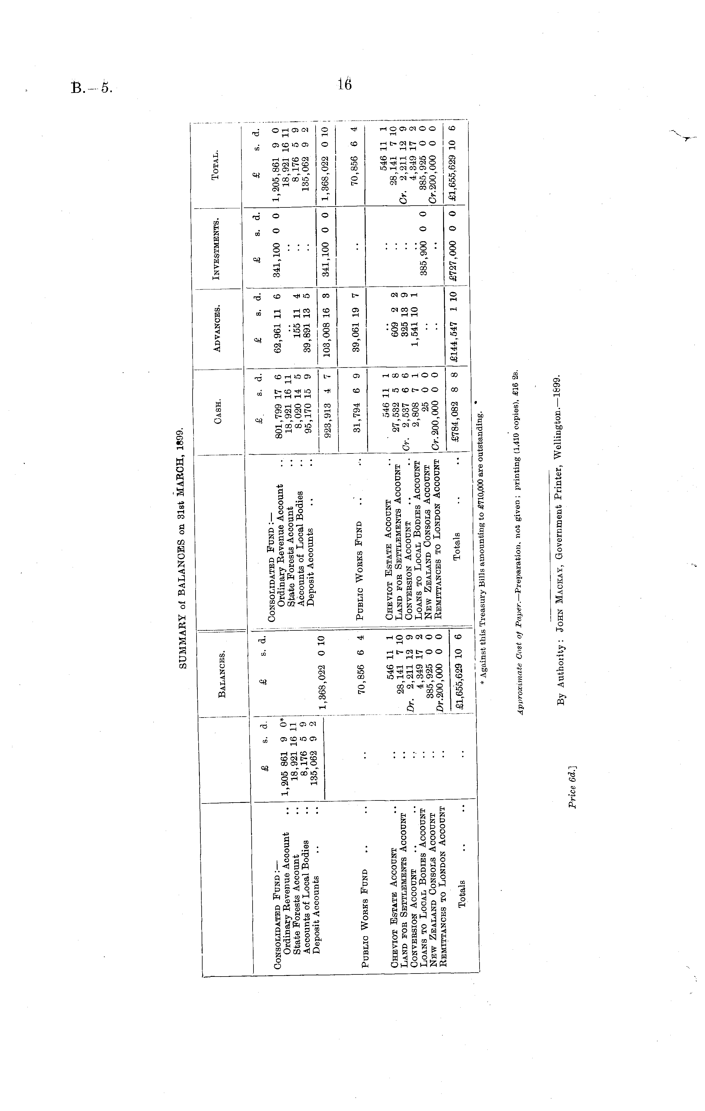 i Cash. Advances. Investments. Total. I Balances. * s. a. I & s. a. £ s. d. & s. d. £ s. d. £ s. d. Consolidated Fund :— Ordinary Revenue Account State Forests Account Accounts of Local Bodies Deposit Accounts 1,205 861 9 0* 18,921 16 11 8,176 5 9 135,062 9 2 Consolidated Fund :— Ordinary Bevenue Account State Forests Account Accounts of Local Bodies Deposit Accounts 801,799 17 6 18,921 16 11 8,020 14 5 95,170 15 9 62,961 11 6 155 11 4 39,891 13 5 341,100 0 0 1,205,861 9 0 18,921 16 11 8,176 5 9 135,062 9 2 i ±,QVO,\JA* v a^ 923,913 4 7 103,008 16 3 341,100 0 0 1,368,022 0 10 Public Works Fund 70,856 6 4 Public Woeks Fund 31,794 6 9 39,061 19 7 70,856 6 4 Cheviot Estate Account Land foe Settlements Account Conversion Account Loans to Local Bodies Account New Zealand Consols Account Remittances to London Account 546 11 1 28,141 7 10 \Dr. 2,211 12 9 4,349 17 2 385,925 0 0 Dr.200,000 0 0 Cheviot Estate Account Land fob Settlements Account Conversion Account Loans to Local Bodies Account New Zealand Consols Account Remittances to London Account Totals 546 11 1 27,532 5 8 Gr. 2,537 6 6 2,808 7 1 25 0 0 Gr. 200, 000 0 0 609 2 2 325 13 9 1,541 10 1 385,900 0 0 546 11 1 28,141 7 10 Gr. 2,211 12 9 4,349 17 2 385,925 0 0 Cr. 200, 000 0 0 £1,655,629 10 6 £784,082 8 8 £144,547 1 10 £727,000 0 0 £1,655,629 10 6 Totals * Against this Treasury Bills amounting to £710,000 are outstanding.