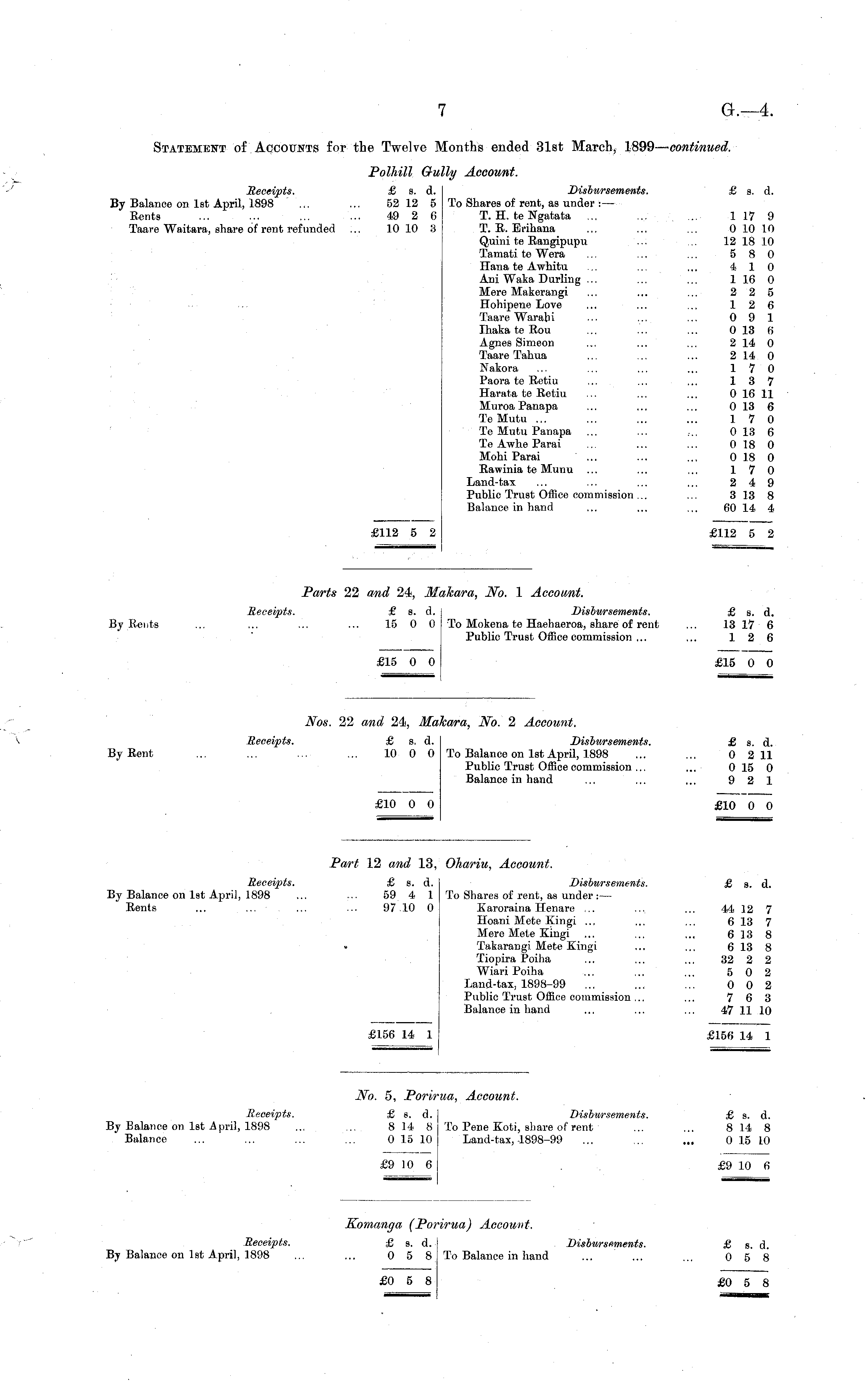 No. 5, Porirua, Account. Receipts. £ s. d. Disbursements. £ s. d. By Balance on Ist April, 1898 ... ... 8 14 8 To Pene Koti, share of rent ... ... 8 14 8 Balance ... ... ... ... 015 10 Land-tax, 1898-99 ... ... ... 015 10 £9 10 6 £9 10 6