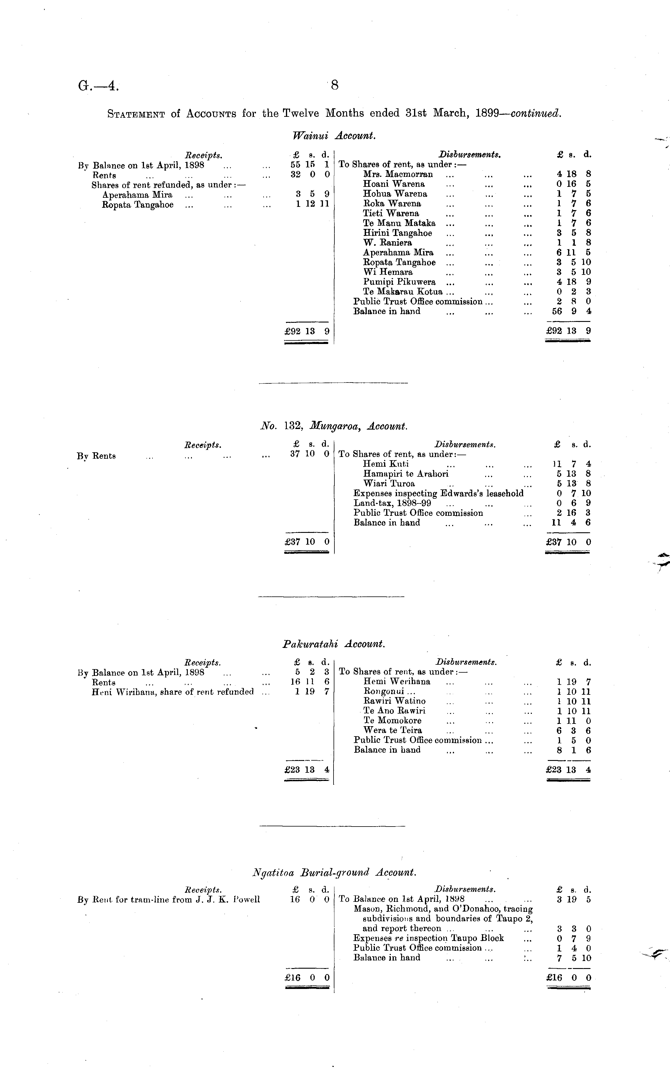 No. 132, Mungaroa, Account. Receipts. £ s. d. Disbursements. £ s. d. By Rents ... ... ... ••• 37 10 0 To Shares of rent, as under:— Hemi Kuti ... ... ... II 7 4 Hamapiri te Arahori ... ... 5 13 8 WiariTuroa ... ... ... 5 13 8 Expenses inspecting Edwards's leasehold 0 7 10 Land-tax, 1898-99 ... ... ... 069 Public Trust Office commission ... 2 16 3 Balance in hand ... ... ... 1146 £37 10 0 £37 10 0