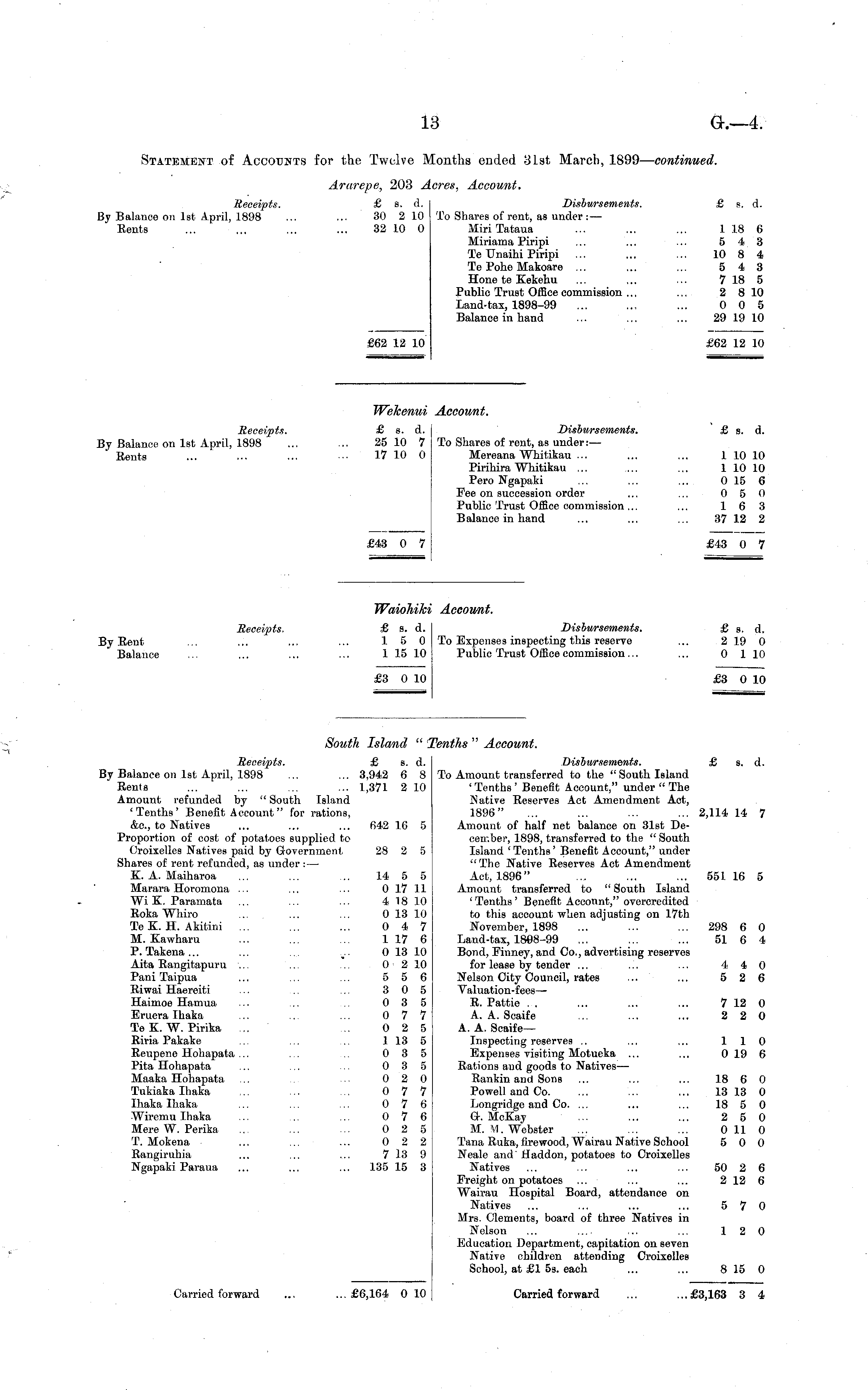South Island " Tenths " Account. Receipts. £ s. d. Disbursements. £ s. d. By Balance on Ist April, 1898 ... ... 3,942 6 8 To Amount transferred to the "South Island Rents ... ... ... ... 1,371 210 ' Tenths' Benefit Account," under " The Amount refunded by "South Island Native Reserves Act Amendment Act, 'Tenths' Benefit Account" for rations, 1896" ... ... ... ... 2,114 14 7 &c, to Natives ... ... ... 642 16 5 Amount of half net balance on 31st DeProportion of cost of potatoes supplied to camber, 1898, transferred to the " South Croixelles Natives paid by Government 28 2 5 Island ' Tenths' Benefit Account," under Shares of rent refunded, as under: — "The Native Reserves Act Amendment K. A. Maiharoa ... ... ... 14 5 5 Act, 1896" ... ... ... 55116 5 Marara Horomona ... ... ... 0 17 11 Amount transferred to "South Island Wi K. Paramata ... ... ... 418 10 'Tenths' Benefit Acconnt," overcredited Roka Whiro ... ... ... 0 13 10 to this account when adjusting on 17th Te K. H. Akitini ... ... ... 0 4 7 November, 1898 ... ' ... ... 298 6 0 M. Kawharu ... ... ... 117 6 Land-tax, 1808-99 ... ... ... 51 6 4 P. Takena... ... ... v . 0 13 10 Bond, Einney, and Co., advertising reserves Aita Rangitapuru ... ... ... 0 2 10 for lease by tender ... ... ... 440 Pani Taipua ... ... ... 556 Nelson City Council, rates ... ... 5 2 6 Riwai Haereiti ... .. ... 305 Valuation-fees—■ Haimoe Hamua ... ... ... 0 3 5 R. Pattie ... ... ... ... 7 12 0 Eruera Ihaka ... ... ... 0 7 7 A. A. Scaife ... ... ... 2 2 0 Te K. W. Pirika ... ... 0 2 5 A. A. Scaife— Riria Pakake ... ... ... 1 13 5 Inspecting reserves .. ... ... 110 Reupene Hohapata... ... ... 0 3 5 Expenses visiting Motueka ... ... 0 19 6 Pita Hohapata ... ... ... 035 Rations and goods to NativeB — Maaka Hohapata ... ... ... 020 Rankin and Sons ... ... ... 18 6 0 Tukiaka Ihaka ... ... ... 0 7 7 Powell and Co. ... ... ... 13 13 0 Ihaka Ihaka ... ... ... 076 Longridge and Co. ... ... ... 18 5 0 Wiremu Ihaka ... ... ... 0 7 6 Gr. McKay ... ... ... 2 5 0 Mere W. Perika ... ... ... 0 2 5 M.M.Webster ... ... ... 0 11 0 T. Mokena ... ... ... 022 Tana Ruka, firewood, Wairau Native School 5 0 0 Rangiruhia ... ... ... 7 13 9 Neale and Haddon, potatoes to Croixelles Ngapaki Paraua ... ... ... 135 15 3 Natives ... ... ... ... 50 2 6 Freight on potatoes ... ... ... 212 6 Wairau Hospital Board, attendance on Natives ... ... ... ... 5 7 0 Mrs. Clements, board of three Natives in Nelson ... .... ... ... 12 0 Education Department, capitation on seven Native children attending Croixelles School, at £1 ss. each ... ... 8 15 0 Carried forward ... ...£6,164 0 10 Carried forward ... ...£3,163 3 4