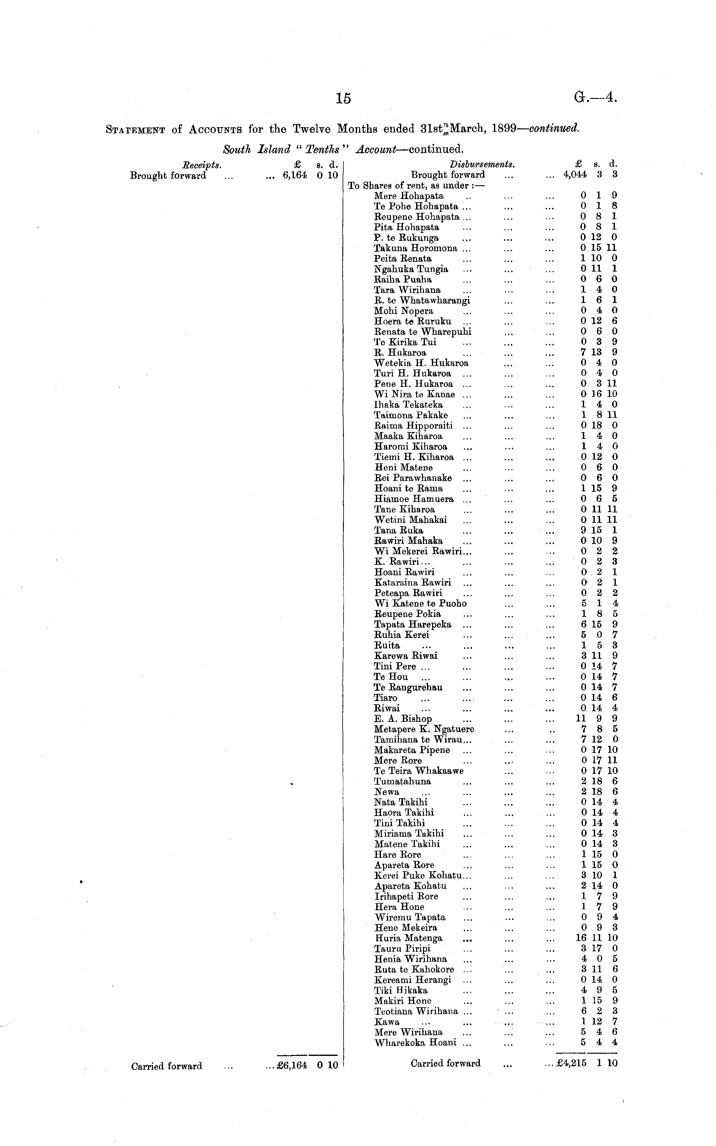 Statement of Accounts for the Twelve Months ended 31st"March, 1899 — continued. South Island " Tenths " Account —continued. Receipts. £ s. d. Disbursements. £ s. d. Brought forward ... ... 6,164 010 Brought forward ... ... 4,044 3 3 To Shares of rent, as under : — Mere Hohapata .. ... ... 0 19 TePohe Hohapata ... ... ... 0 18 Reupene Hohapata... ... ... 0 8 1 Pita Hohapata ... ... ... 081 P. te Rukunga ... ... ... 0 12 0 Takuna Horomona ... ... ... 0 15 11 Peita Renata ... ... ... 1 10 0 Ngahuka Tungia ... ... ... 011 1 Raiha Puaha ... ... ... 060 Tara Wirihana ... ... ... 14 0 R. te Whatawharangi ... ... 16 1 Mohi Nopera ... ... ... 0 4 0 Hoera te Ruruku ... ... ... 012 6 Renata te Wharepuhi ... ... 060 TeKirikaTui ... ... ... 0 3 9 R. Hukaroa ... ... ... 7 13 9 Wetekia H. Hukaroa ... ... 0 4 0 Turi H. Hukaroa ... ... ... 0 4 0 Pene H. Hukaroa ... ... ... 0 3 11 Wi Nira te Kanae ... ... ... 0 16 10 Ihaka Tekateka ... ... ... 14 0 Taimona Pakake ... ... ... 1 811 Raima Hipporaiti ... ... ... 0 18 0 Maaka Kiharoa ... ... ... 140 Haromi Kiharoa ... ... ... 140 Tiemi H. Kiharoa ... ... ... 0 12 0 HeniMatene ... ... ... 0 6 0 Rei Parawhauake ... ... ... 060 Hoani te Rama ... ... ... 1 15 9 Hiamoe Hamuera ... ... ... 065 Tane Kiharoa ... ... ... 0 11 11 Wetmi Mahakai ... ... ... 0 1111 Tanaßuka ... ... ... 9 15 1 Rawiri Mahaka ... ... ... 0 10 9 Wi Mekerei Rawiri... ... ... 0 2 2 K. Rawiri... ... ... ... 0 2 3 Hoani Rawiri ... ... ... 021 Kataraina Rawiri ... ... ... 0 2 1 Peteapa Rawiri ... ... ... 022 Wi Katene te Puoho ... ... 514 Reupene Pokia ... ... ... 185 Tapata Harepeka ... ... ... 6159 Ruhia Kerei ... ... ... 5 0 7 Ruita ... ... ... ... 15 3 Karewa Riwai ... ... ... 3 11 9 TiniPere ... ... ... ... 0 14 7 TeHou ... ... ... ... 014 7 Te Rangurehau ... ... ... 014 7 Tiaro ... ... 0 14 6 Riwai ... ... ... ... 0 14 4 E. A. Bishop ... ... ... 11 9 9 Metapere K. Ngatuere ... .. 7 8 5 Tamihana te Wirau... ... ... 7 12 0 Makareta Pipene ... ... ... 017 10 Mere Bore ... ... ... 0 17 11 Te Teira Whakaawe ... ... 0 17 10 , Tumatahuna ... ... ... 2 18 6 Newa ... ... ... ... 2 18 6 NataTakihi ... ... ... 0 14 4 Haora Takihi ... ... ... 0 14 4 TiniTakihi ... ... ... 0 14 4 Miriama Takihi ... ... ... 0 14 3 Matene Takihi ... ... ... 0 14 3 Hare Rore ... ... ... 1 15 0 Apareta Rore ... ... ... 1150 Kerei Puke Kohatu... ... ... 3 10 1 Apareta Kohatu ... ... ... 214 0 Irihapeti Rore ... ... ... 179 Hera Hone ... ... ... 17 9 Wiremu Tapata ... ... ... 094 Hene Mekeira ... ... ... 0 9 3 Huria Matenga ... ... ... 16 11 10 Tauru Piripi ... ... ... 3 17 0 Henia Wirihana ... ... ... 405 Ruta te Kahokore ... ... ... 3 11 6 Kereami Herangi ... ... ... 014 0 Tiki Hikaka ... ... ... 4 9 5 Makiri Hone ... ... ... 1 15 9 Teotiana Wirihana ... ... ... 623 Kawa ... ... 1 12 7 Mere Wirihana ... ... ... 5 4 6 Wharekoka Hoani ... ... ... 544 Carried forward ... ...£6,164 010 Carried forward ... ...£4,215 110
