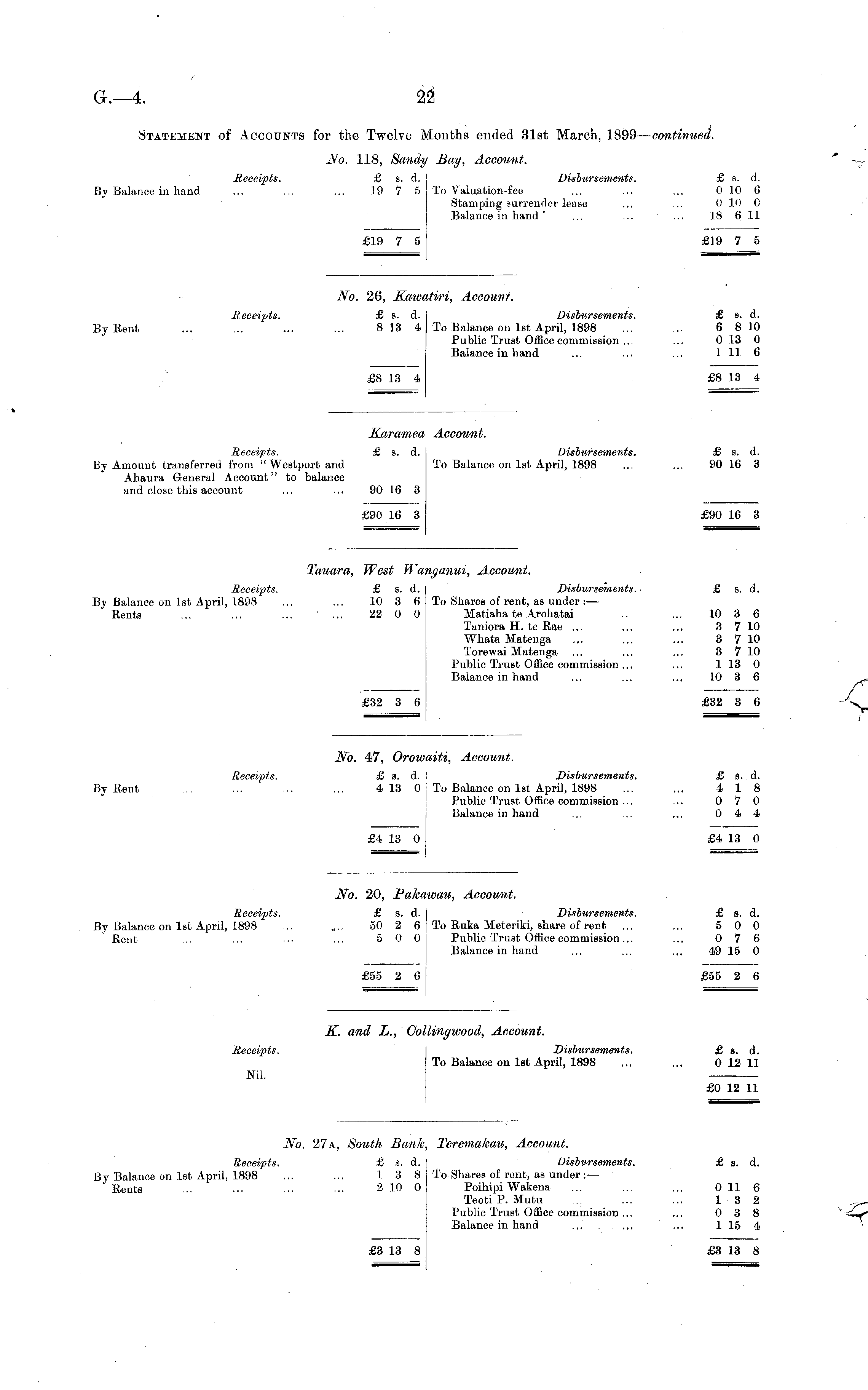 No. 20, Pakawau, Account. Receipts. £ s. d. Disbursements. £ s. d. By Balance on Ist April, 1898 ... ... 50 2 6 To Ruka Meteriki, share of rent ... ... 5 0 0 Rent ... ... ... ... 5 0 0 Public Trust Office commission... ... 0 7 6 Balance in hand ... ... ... 49 15 0 £55 2 6 j £55 2 6