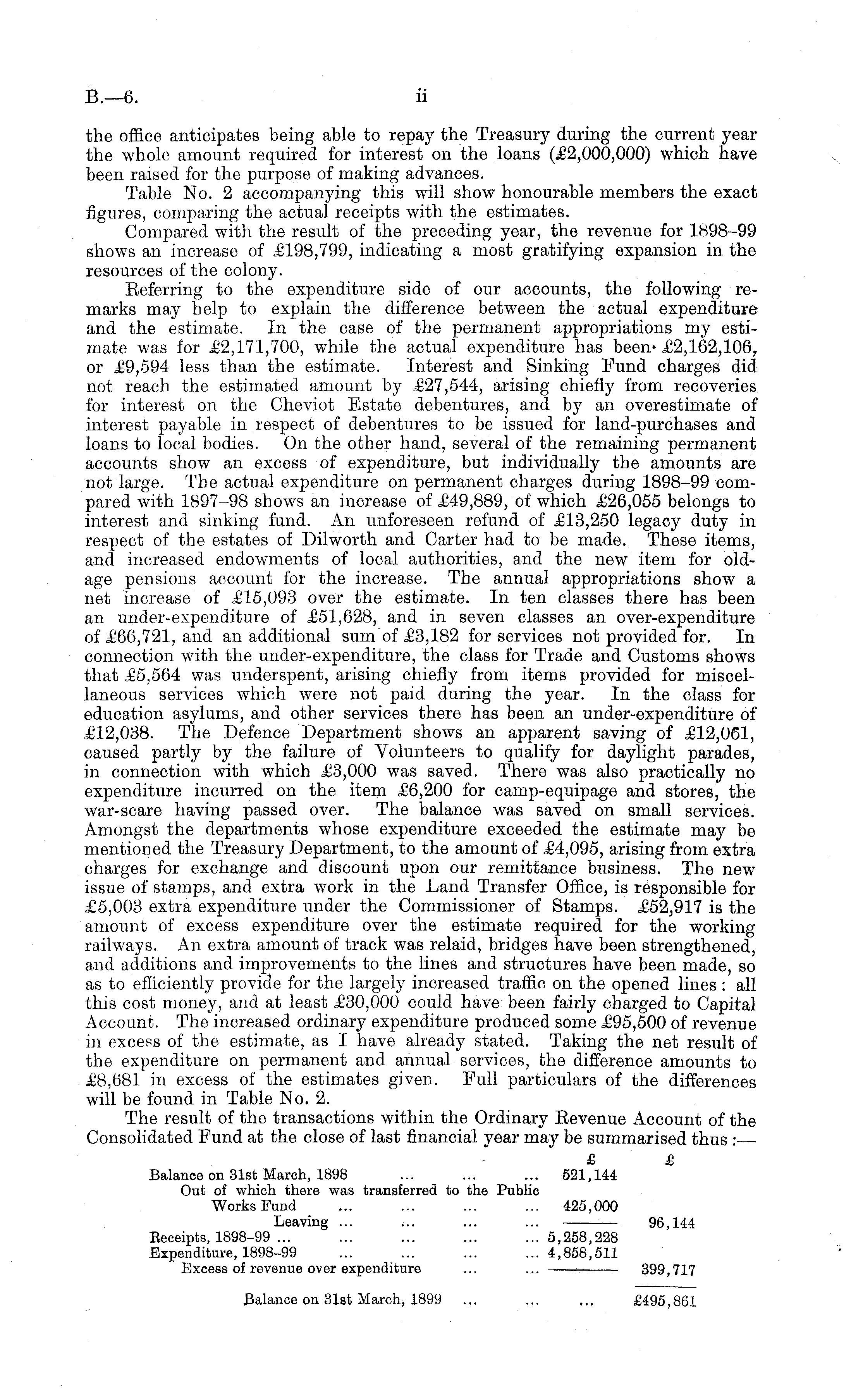 the office anticipates being able to repay the Treasury during the current year the whole amount required for interest on the loans (£2,000,000) which have been raised for the purpose of making advances. Table No. 2 accompanying this will show honourable members the exact figures, comparing the actual receipts with the estimates. Compared with the result of the preceding year, the revenue for 1898-99 shows an increase of .£198,799, indicating a most gratifying expansion in the resources of the colony. Eeferring to the expenditure side of our accounts, the following remarks may help to explain the difference between the actual expenditure and the estimate. In the case of the permanent appropriations my estimate was for £2,171,700, while the actual expenditure has been* £2,162,106, or £9,594 less than the estimate. Interest and Sinking Fund charges did not reach the estimated amount by £27,544, arising chiefly from recoveries for interest on the Cheviot Estate debentures, and by an overestimate of interest payable in respect of debentures to be issued for land-purchases and loans to local bodies. On the other hand, several of the remaining permanent accounts show an excess of expenditure, but individually the amounts are not large. The actual expenditure on permanent charges during 1898-99 compared with 1897-98 shows an increase of £49,889, of which £26,055 belongs to interest and sinking fund. An unforeseen refund of £13,250 legacy duty in respect of the estates of Dilworth and Carter had to be made. These items, and increased endowments of local authorities, and the new item for oldage pensions account for the increase. The annual appropriations show a net increase of £15,093 over the estimate. In ten classes there has been an under-expenditure of £51,628, and in seven classes an over-expenditure of £66,721, and an additional sum of £3,182 for services not provided for. In connection with the under-expenditure, the class for Trade and Customs shows that £5,564 was underspent, arising chiefly from items provided for miscellaneous services which were not paid during the year. In the class for education asylums, and other services there has been an under-expenditure of £12,038. The Defence Department shows an apparent saving of £12,061, caused partly by the failure of Volunteers to qualify for daylight parades, in connection with which £3,000 was saved. There was also practically no expenditure incurred on the item £6,200 for camp-equipage and stores, the war-scare having passed over. The balance was saved on small services. Amongst the departments whose expenditure exceeded the estimate may be mentioned the Treasury Department, to the amount of £4,095, arising from extra charges for exchange and discount upon our remittance business. The new issue of stamps, and extra work in the Land Transfer Office, is responsible for £5,003 extra expenditure under the Commissioner of Stamps. £52,917 is the amount of excess expenditure over the estimate required for the working railways. An extra amount of track was relaid, bridges have been strengthened, and additions and improvements to the lines and structures have been made, so as to efficiently provide for the largely increased traffic on the opened lines : all this cost money, and at least £30,000 could have been fairly charged to Capital Account. The increased ordinary expenditure produced some £95,500 of revenue in excess of the estimate, as I have already stated. Taking the net result of the expenditure on permanent and annual services, the difference amounts to £8,681 in excess of the estimates given. Full particulars of the differences will be found in Table No. 2. The result of the transactions within the Ordinary Eevenue Account of the Consolidated Fund at the close of last financial year may be summarised thus : — £ £ Balance on 31st March, 1898 ... ... ... 521,144 Out of which there was transferred to the Public Works Fund ... ... ... ... 425,000 Leaving ... ... ... ... 96,144 Eeceipts, 1898-99 ... ... ... ... ...5,258,228 Expenditure, 1898-99 ... ... ... ...4,858,511 Excess of revenue over expenditure ... ... ■-. 399,717 Balance on 31st March, 1899 ~, ... ... £495,861
