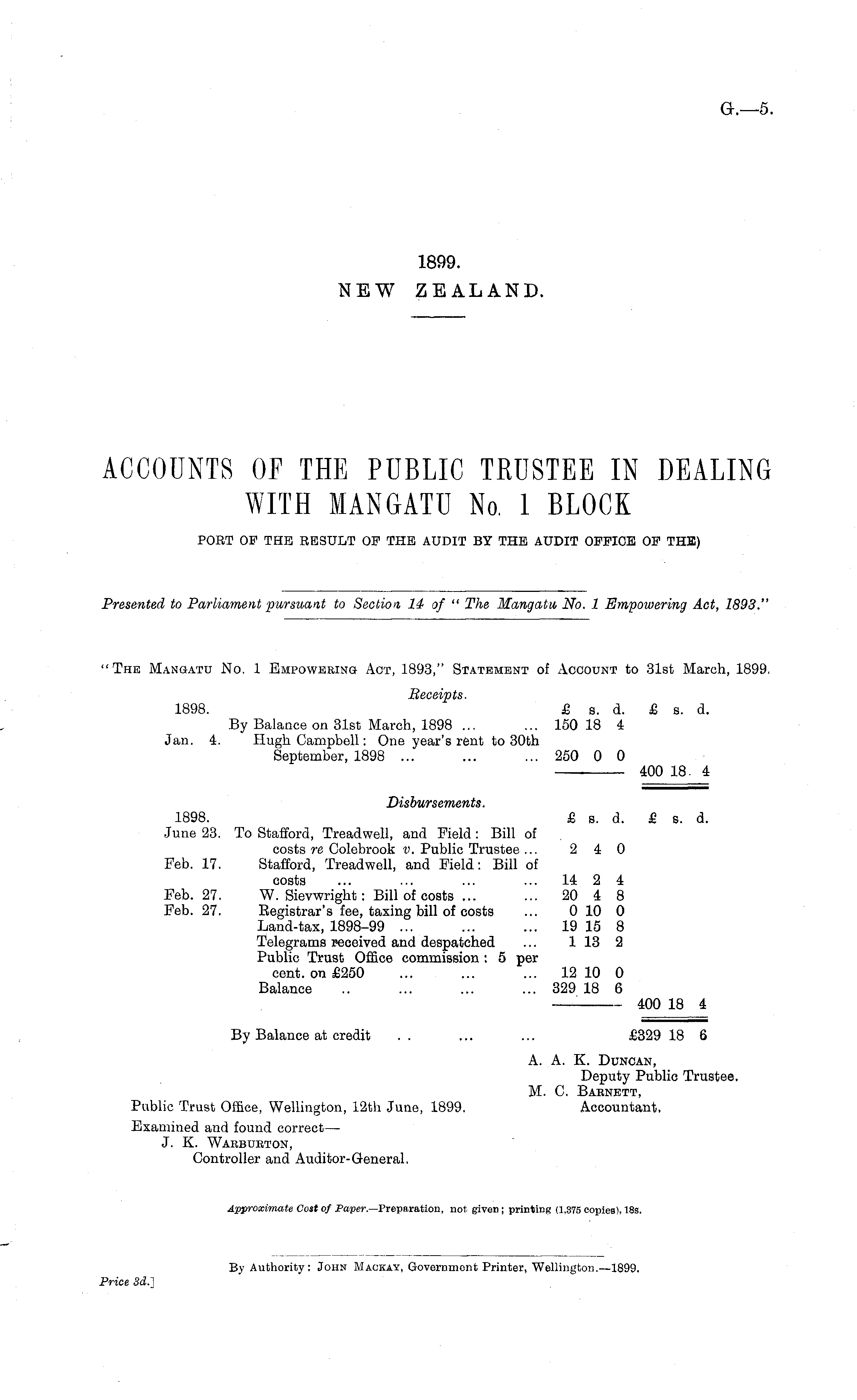" The Mangatu No. 1 Empowering Act, 1893," Statement of Account to 31st March, 1899. Receipts. 1898. £ s. d. £ s. d. By Balance on 31st March, 1898 ... ... 150 18 4 Jan. 4. Hugh Campbell: One year's rent to 30th September, 1898 ... ... ... 250 0 0 400 18. 4 Disbursements. 1898. £ s. d. £ s. d. June 23. To Stafford, Treadwell, and Field: Bill of costs re Colebrook v. Public Trustee ... 2 4 0 Feb. 17. Stafford, Treadwell, and Field: Bill of costs ... ... ... ... 14 2 4 Feb. 27. W. Sievwright: Bill of costs ... ... 20 4 8 Feb. 27. Eegistrar's fee, taxing bill of costs ... 0 10 0 Land-tax, 1898-99 ... ... ... 19 15 8 Telegrams received and despatched ... 113 2 Public Trust Office commission : 5 per cent, on £250 ... ... ... 12 10 0 Balance .. ... ... ... 329 18 6 —: 400 is 4 By Balance at credit .. ... ... £329 18 6 A. A. K. Duncan, Deputy Public Trustee. M. C. Baenett, Public Trust Office, Wellington, 12th June, 1899. Accountant, Examined and found correct — J. K. Wakbueton, Controller and Auditor-General. Approximate Cost of Paper.—Preparation, not given ; printing (1,375 copies), 18s.