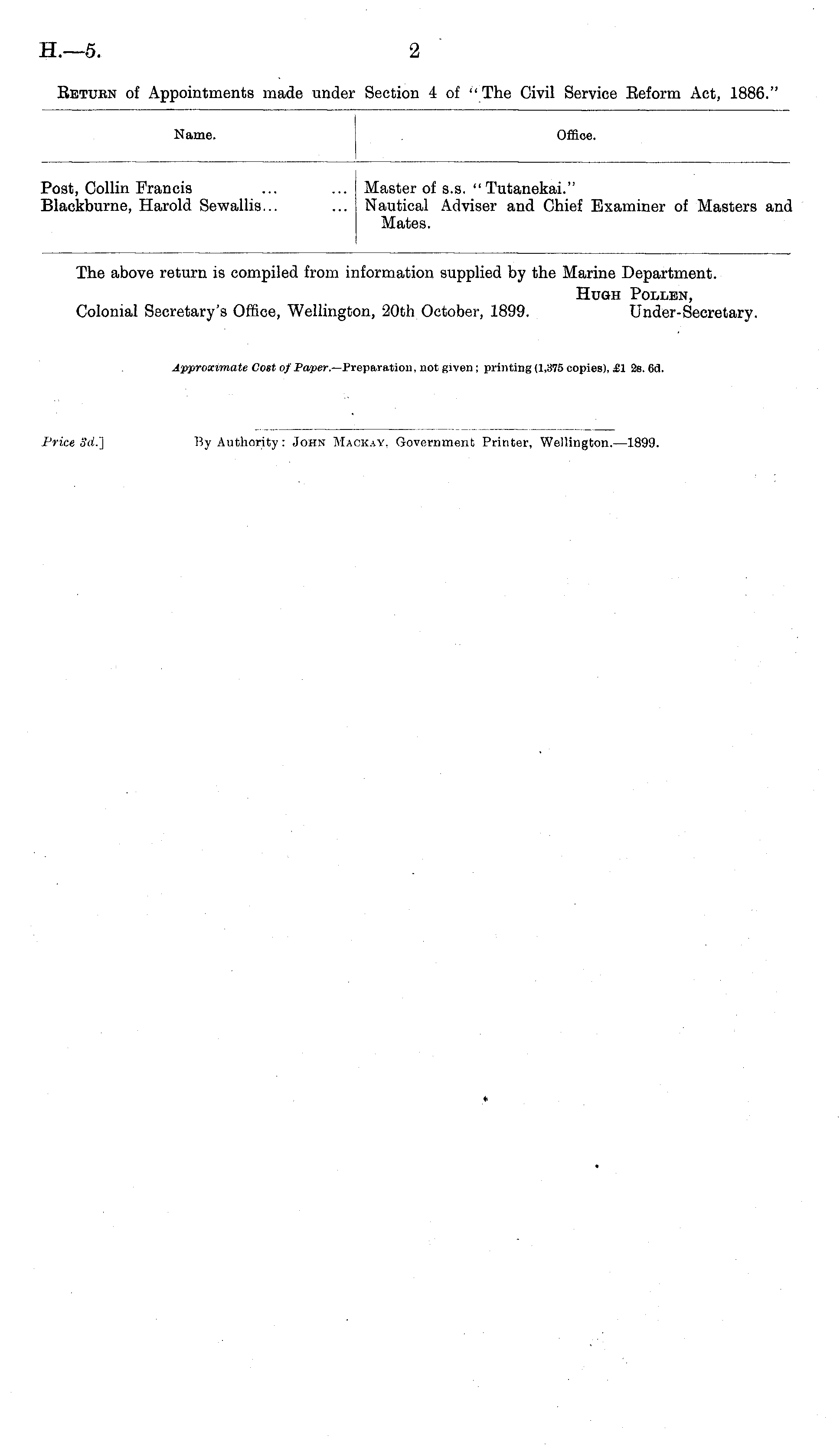 The above return is compiled from information supplied by the Marine Department. Hugh Pollen, Colonial Secretary's Office, Wellington, 20th October, 1899. Under-Secretary. Approximate Cost of Paper.— Preparation, not given ; printing (1,375 copies), £1 2s. 6(3.
