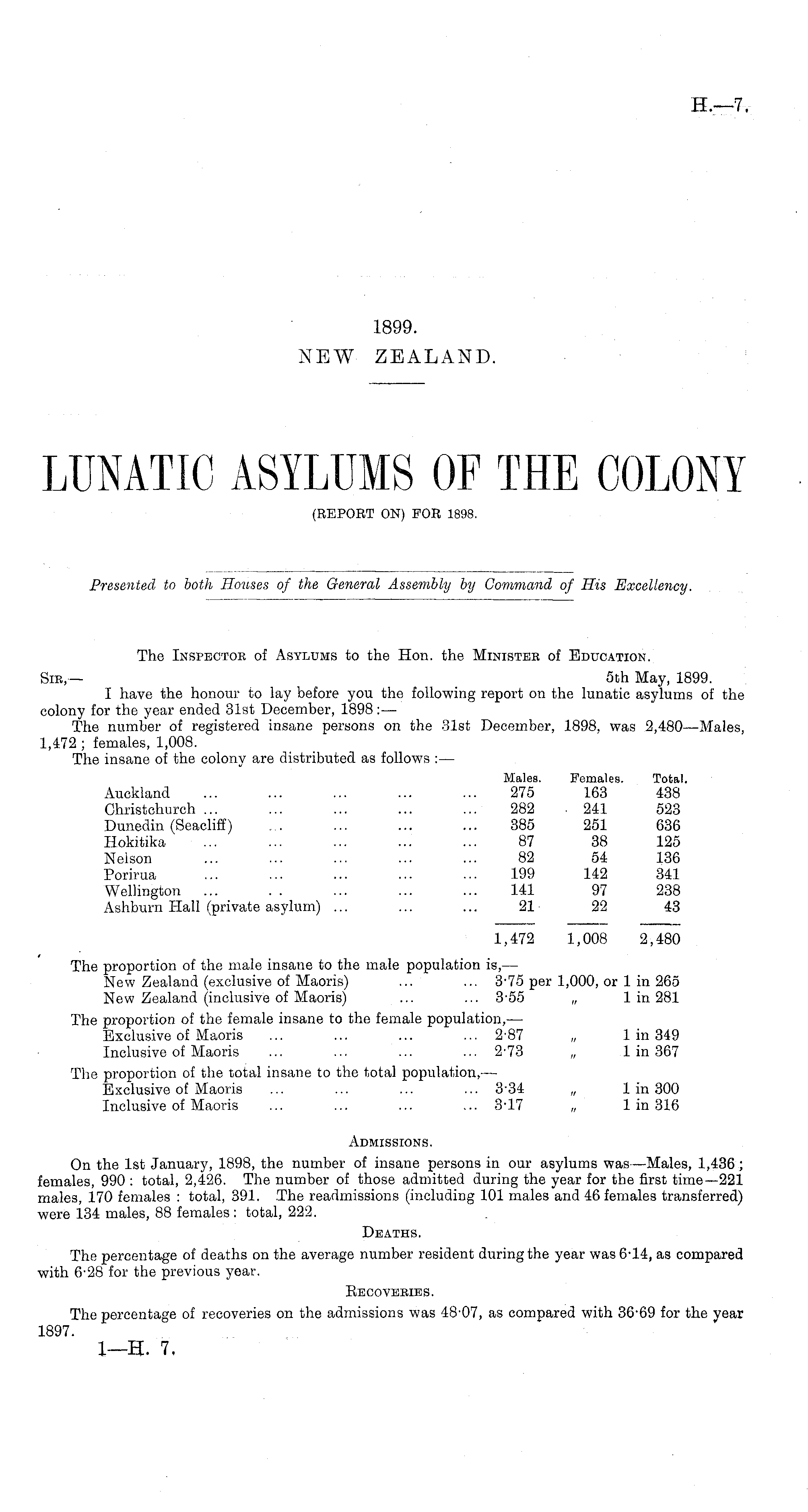 Presented to both Houses of the General Assembly by Command of His Excellency. The Inspector of Asylums to the Hon. the Minister of Education. Sir,— sth May, 1899. I have the honour to lay before you the following report on the lunatic asylums of the colony for the year ended 31st December, 1898: — The number of registered insane persons on the 31st December, 1898, was 2,480 —Males, 1,472 ; females, 1,008. The insane of the colony are distributed as follows : — Males. Females. Total. Auckland ... ... ... ... ... 275 163 438 Christchurch ... ... ... ... ... 282 . 241 523 Dunedin (Seacliff) ... ... ... ... 385 251 636 Hokitika ... ... ... ... ... 87 38 125 Nelson ... ... ... ... ... 82 54 136 Porirua ... ... ... ... ... 199 142 341 Wellington ... . . ... ... ... 141 97 238 Ashburn Hall (private asylum) ... ... ... 21 22 43 1,472 1,008 2,480 The proportion of the male insane to the male population is,— New Zealand (exclusive of Maoris) ... ... 3-75 per 1,000, or lin 265 New Zealand (inclusive of Maoris) ... ... 355 „ lin 281 The proportion of the female insane to the female population,— Exclusive of Maoris ... ... ... ... 2-87 „ lin 349 Inclusive of Maoris ... ... ... ... 2-73 „ lin 367 The proportion of the total insane to the total population,— Exclusive of Maoris ... ... ... ... 3-34 „ lin 300 Inclusive of Maoris ... ... ... ... 3-17 „ lin 316 Admissions. On the Ist January, 1898, the number of insane persons in our asylums was—Males, 1,436; females, 990 : total, 2,426. The number of those admitted during the year for the first time—22l males, 170 females : total, 391. The readmissions (including 101 males and 46 females transferred) were 134 males, 88 females: total, 222. Deaths. The percentage of deaths on the average number resident during the year was 6-14, as compared with 6-28 for the previous year. Recoveries. The percentage of recoveries on the admissions was 48-07, as compared with 3669 for the year 1897. I—H. 7.