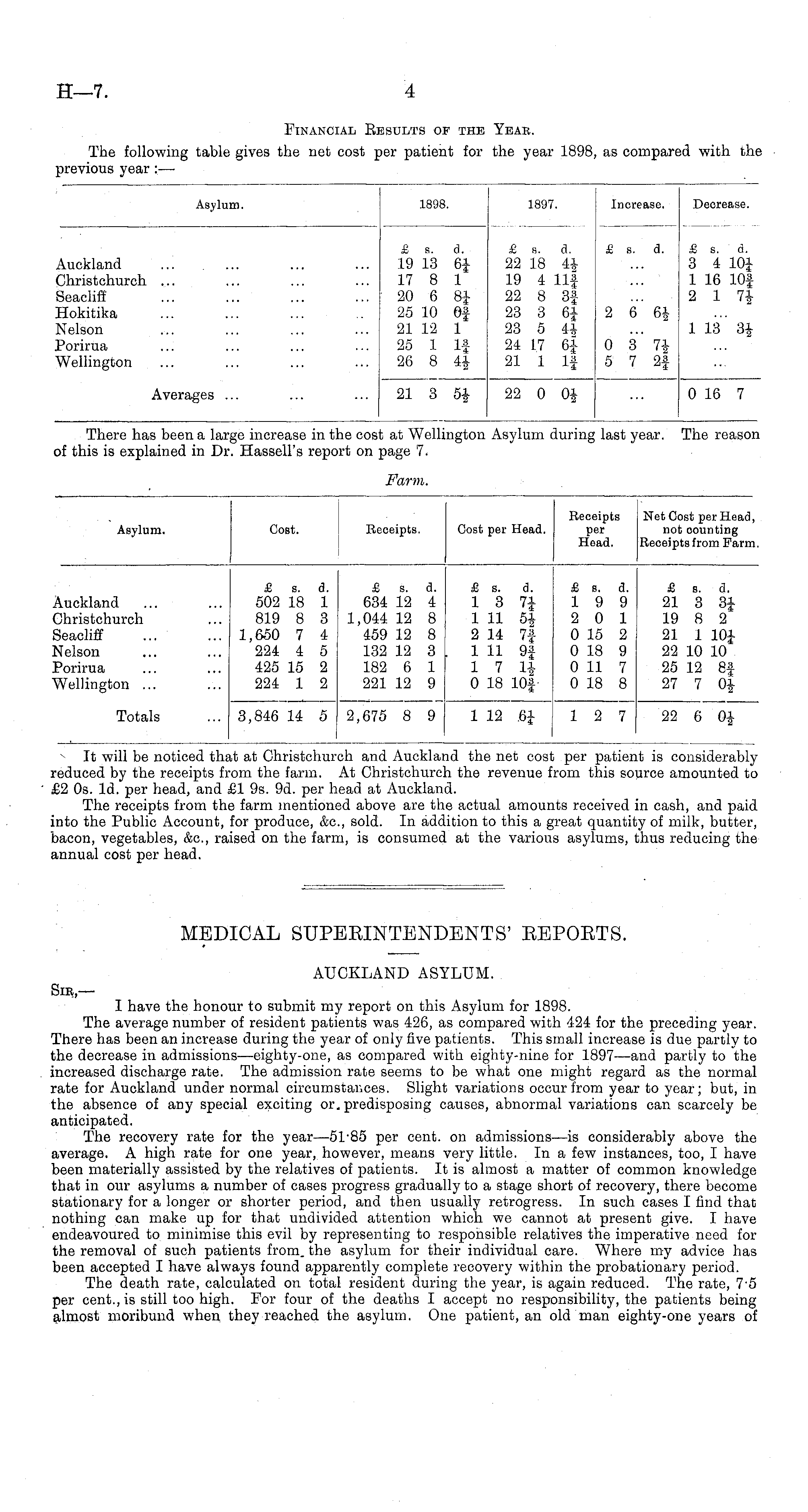 Asylum. 1898. 1897. Increase. Decrease. £ s. 19 13 17 8 20 6 25 10 21 12 25 1 26 8 a. 6i Of 1 If £ s. a. 22 18 4* 19 4 llf 22 8 3| 23 3 61 23 5 4* 24 17 6| 21 1 If £ s. a. £ s. d. 3 4 10J 1 16 10f 2 17* Auckland Christchurch Seacliff Hokitika Nelson Porirua Wellington 2 6" 6| 1 13 3i 0 3 7J 5 7 2f Averages ... 21 3 6* 22 0 0* 0 16 7