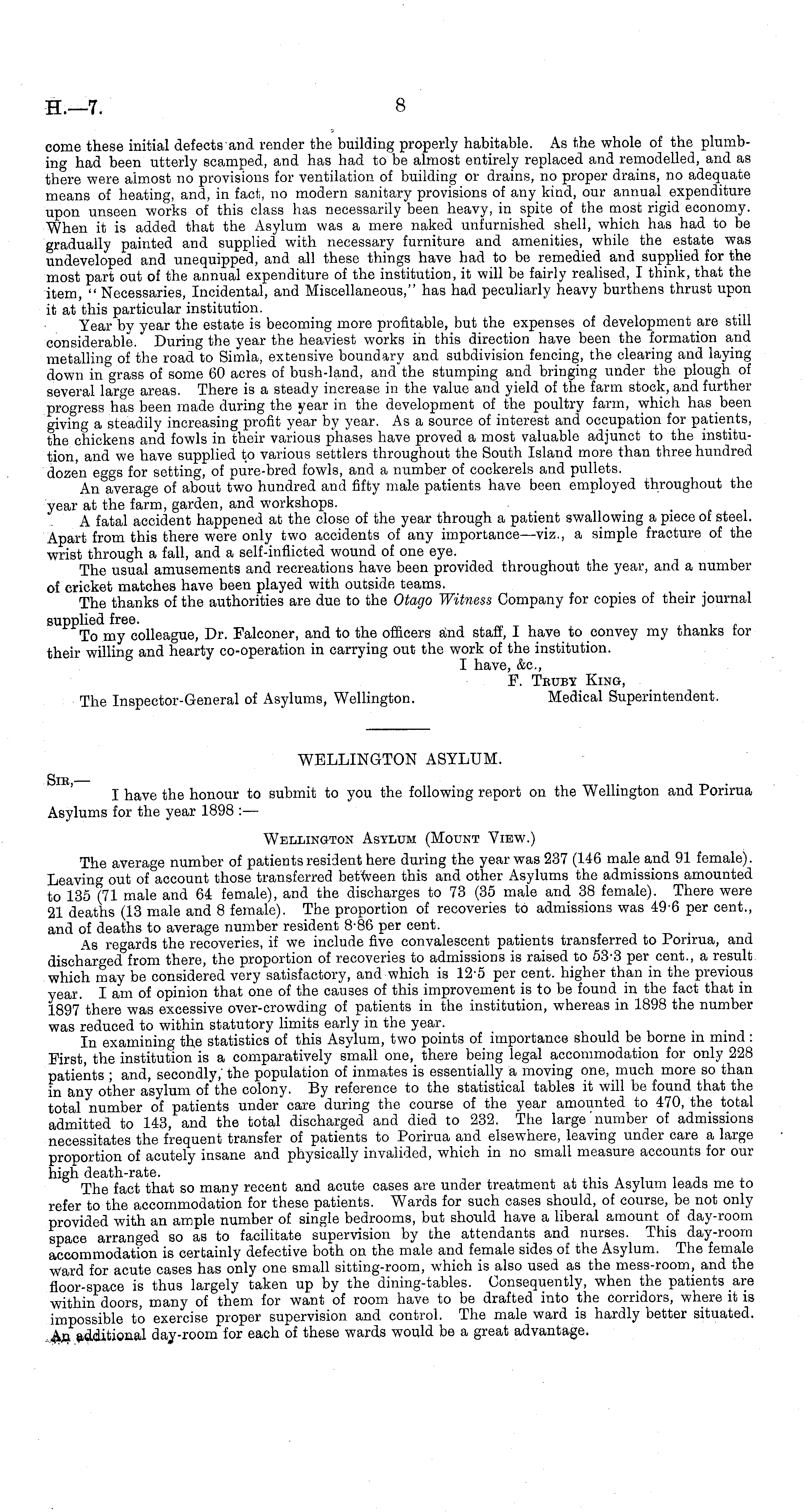 come these initial defectsand render the building properly habitable. As the whole of the plumbing had been utterly scamped, and has had to be almost entirely replaced and remodelled, and as there were almost no provisions for ventilation of building or drains, no proper drains, no adequate means of heating, and, in fact, no modern sanitary provisions of any kind, our annual expenditure upon unseen works of this class has necessarily been heavy, in spite of the most rigid economy. When it is added that the Asylum was a mere naked unfurnished shell, which has had to be gradually painted and supplied with necessary furniture and amenities, while the estate was undeveloped and unequipped, and all these things have had to be remedied and supplied for the most part out of the annual expenditure of the institution, it will be fairly realised, I think, that the item, " Necessaries, Incidental, and Miscellaneous," has had peculiarly heavy burthens thrust upon it at this particular institution. Year by year the estate is becoming more profitable, but the expenses of development are still considerable. During the year the heaviest works in this direction have been the formation and metalling of the road to Simla, extensive boundary and subdivision fencing, the clearing and laying down in grass of some 60 acres of bush-land, and the stumping and bringing under the plough of several large areas. There is a steady increase in the value and yield of the farm stock, and further progress has been made during the year in the development of the poultry farm, which has been giving a steadily increasing profit year by year. As a source of interest and occupation for patients, the chickens and fowls in their various phases have proved a most valuable adjunct to the institution, and we have supplied to various settlers throughout the South Island more than three hundred dozen eggs for setting, of pure-bred fowls, and a number of cockerels and pullets. An average of about two hundred and fifty male patients have been employed throughout the year at the farm, garden, and workshops. A fatal accident happened at the close of the year through a patient swallowing a piece of steel. Apart from this there were only two accidents of any importance —viz., a simple fracture of the wrist through a fall, and a self-inflicted wound of one eye. The usual amusements and recreations have been provided throughout the year, and a number of cricket matches have been played with outside teams. The thanks of the authorities are due to the Otago Witness Company for copies of their journal supplied free. To my colleague, Dr. Falconer, and to the officers and staff, I have_ to convey my thanks tor their willing and hearty co-operation in carrying out the work of the institution. I have, &c, F. Truby King, The Inspector-General of Asylums, Wellington. Medical Superintendent.