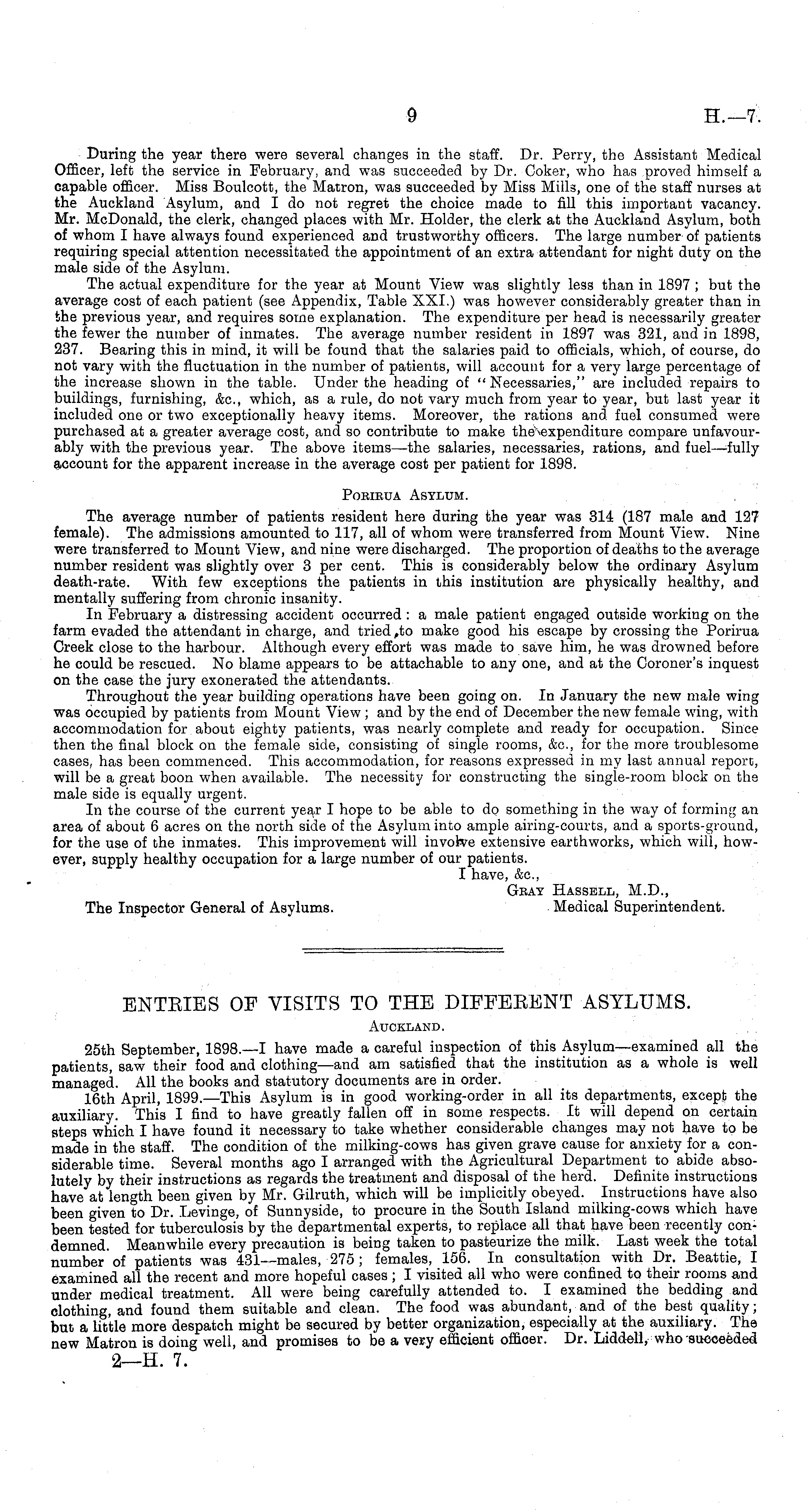 ENTKIES OF VISITS TO THE DIFFEBENT ASYLUMS. Auckland. 25th September, 1898.—1 have made a careful inspection of this Asylum—examined all the patients, saw their food and clothing —and am satisfied that the institution as a whole is well managed. All the books and statutory documents are in order. 16th April, 1899. —This Asylum is in good working-order in all its departments, except the auxiliary. This I find to have greatly fallen off in some respects. It will depend on certain steps which I have found it necessary to take whether considerable changes may not have to be made in the staff. The condition of the milking-cows has given grave cause for anxiety for a considerable time. Several months ago I arranged with the Agricultural Department to abide absolutely by their instructions as regards the treatment and disposal of the herd. Definite instructions have at length been given by Mr. Gilruth, which will be implicitly obeyed. Instructions have also been given to Dr. Levinge, of Sunnyside, to procure in the South Island milking-cows which have been tested for tuberculosis by the departmental experts, to replace all that have been recently condemned. Meanwhile every precaution is being taken to pasteurize the milk. Last week the total number of patients was 431—males, 275; females, 156. In consultation with Dr. Beattie, I examined all the recent and more hopeful cases ; I visited all who were confined to their rooms and under medical treatment. All were being carefully attended to. I examined the bedding and clothing, and found them suitable and clean. The food was abundant, and of the best quality; but a little more despatch might be secured by better organization, especially at the auxiliary. The new Matron is doing well, and promises to be a very efficient officer. Dr. Liddell, who succeeded 2—H. 7.