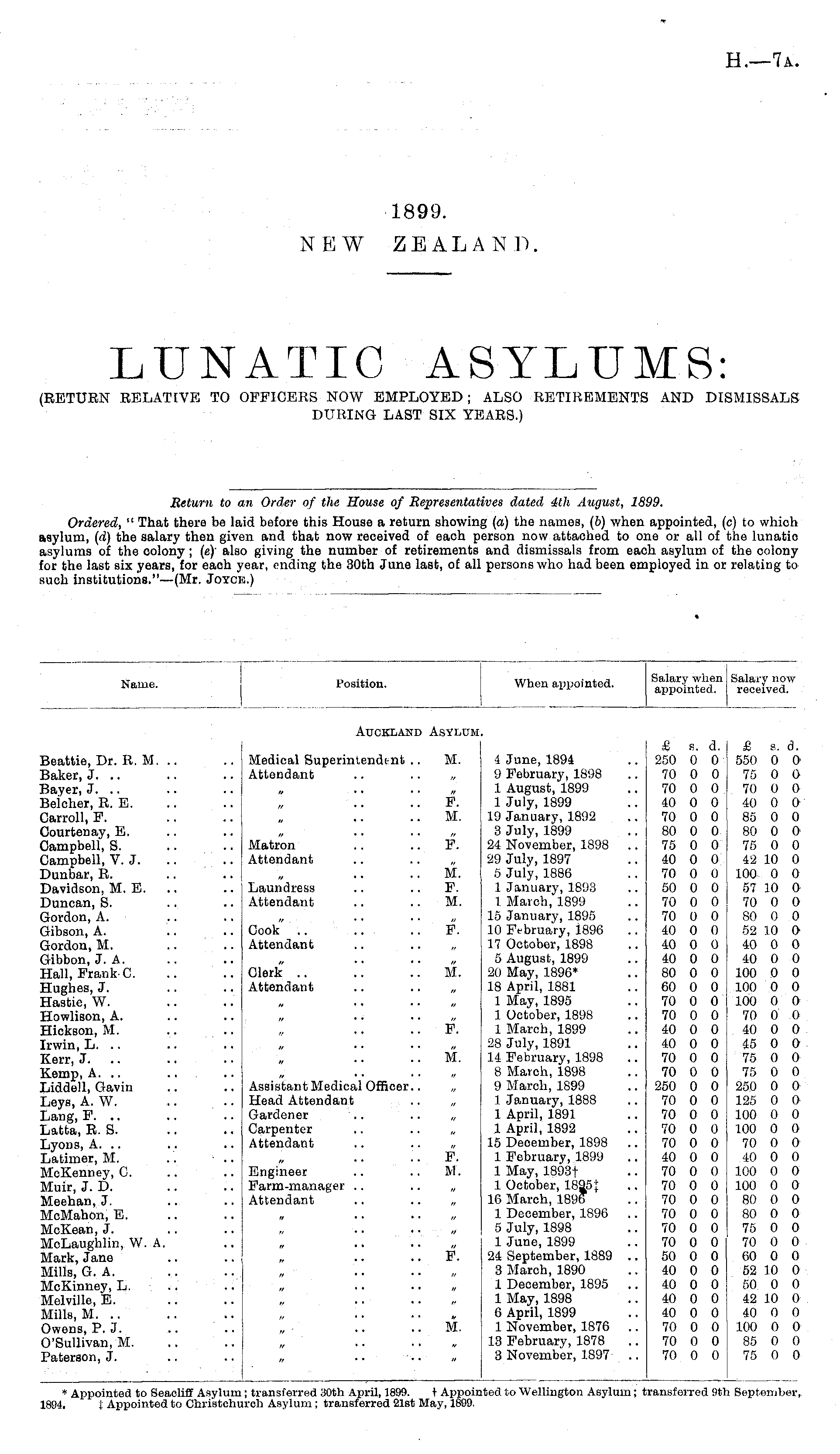 Return to an Order of the House of Representatives dated 4th August, 1899. Ordered, " That there be laid before this House a return showing (a) the names, (b) when appointed, (c) to which asylum, (d) the salary then given and that now received of each person now attached to one or all of the lunatio asylums of the colony; (c) also giving the number of retirements and dismissals from each asylum of the colony for the last six years, for each year, ending the 30th June last, of all persons who had been employed in or relating to such institutions."—(Mr. Joyce.)