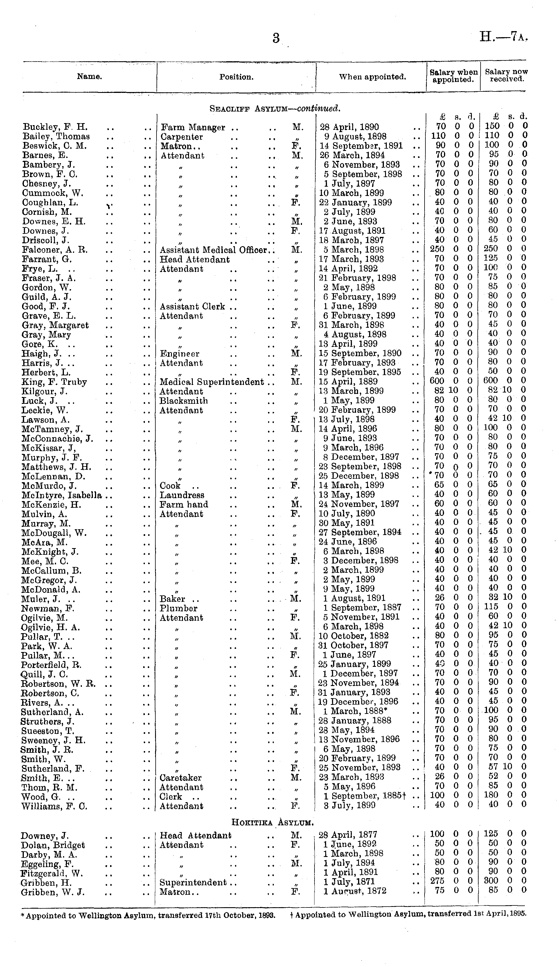 Name. Position. When appointed. Salary when Salary now appointed. received. , __ Seaclifp Asylum— cont: inued. Buckley, F. H. Bailey, Thomas Beswick, CM. Barnes, E. Bambery, J. Brown, F. 0. Chesney, J. Cummock, W. Coughlan, L. v Cornish, M. Downes, E. H. Downes, J. Driscoll, J. Falconer, A. R, Farrant, G. Frye, L. .. Fraser, J. A. Gordon, W. Guild, A. J. Good, F. J. Grave, E. L. Gray, Margaret Gray, Mary Gore, K. .. Haigh, J. .. Harris, J. .. Herbert, L. King, F. Truby Kilgour, J. Luck, J. .. Leckie, W. Lawson, A. McTamney, J. McConnachie, J. McKissar, J, Murphy, J. F. Matthews, J. H. McLennan, D. MeMurdo, J. Molntyre, Isabella .. McKenzie, H. Mulvin, A. Murray, M. McDougall, W. McAra, M. McKnight, J. Mee, M. C. McCallum, B. McGregor, J. McDonald, A. Muier, J. .. Newman, F. Ogilvie, M. Ogilvie, H. A. Pullar, T. .. Park, W. A. Pullar, M... Porterfield, R. Quill, J. C. Robertson, W. R. Robertson, C. Rivers, A. .. Sutherland, A. Struthers, J. Sueeston, T. Sweeney, J. H. Smith, J. R. Smith, W. Sutherland, F. Smith, E. .. Thorn, R. M. Wood, G. .. Williams, F. C. Farm Manager .. .. M. Carpenter .. .. „ Matron.. .. .. F. Attendant .. .. M. "„ '.. '.'.¥. "„ .. .. M. .. F. Assistant Medical Officer.. M. Head Attendant .. „ Attendant .. .. „ ,/ • • . . n Assistant Clerk .. .. „ Attendant .. .. „ .. F. Engineer .. .. M. Attendant .. .. „ .. F. Medical Superintendent .. M. Attendant .. .. „ Blacksmith .. .. „ Attendant .. .. „ .. F. M. 28 April, 1890 9 August, 1898 14 Septembar, 1891 .. 26 March, 1894 6 November, 1893 .. 5 September, 1898 .. 1 July, 1897 10 March, 1899 22 January, 1899 2 July, 1899 2 June, 1893 17 August, 1891 18 March, 1897 5 March, 1898 17 March, 1893 14 April, 1892 21 February, 1898 2 May, 1898 6 February, 1899 1 June, 1899 6 February, 1899 31 March, 1898 4 August, 1898 13 April, 1899 15 September, 1890 .. 17 February, 1893 19 September, 1895 .. 15 April, 1889 13 March, 1899 1 May, 1899 20 February, 1899 13 July, 1898 14 April, 1896 9 June, 1893 9 March, 1896 8 December, 1897 .. 23 September, 1898 .. 25 December, 1898 .. 14 March, 1899 13 May, 1899 24 November, 1897 .. 10 July, 1890 30 May, 1891 27 September, 1894 .. 24 June, 1896 6 March, 1898 3 December, 1898 .. 2 March, 1899 2 May, 1899 9 May, 1899 1 August, 1891 1 September, 1887 .. 5 November, 1891 6 March, 1898 10 October, 1882 31 October, 1897 1 June, 1897 25 January, 1899 1 December, 1897 23 November, 1894 .. 31 January, 1893 19 December, 1896 .. 1 March, 1888* 28 January, 1888 28 May, 1894 13 November, 1896 .. 6 May, 1898 20 February, 1R99 25 November, 1893 .. 23 March, 1893 5 May, 1896 1 September, 1885f .. 3 July, 1899 £ s. a. 70 0 0 110 0 0 90 0 0 70 0 0 70 0 0 70 0 0 70 0 0 80 0 0 40 0 0 40 0 0 70 0 0 40 0 0 40 0 0 250 0 0 70 0 0 70 0 0 70 0 0 80 0 0 80 0 0 80 0 0 70 0 0 40 0 0 40 0 0 40 0 0 70 0 0 70 0 0 40 0 0 600 0 0 82 10 0 80 0 0 70 0 0 40 0 0 80 0 0 70 0 0 70 0 0 70 0 0 70 o 0 '70 0 0 65 0 0 40 0 0 60 0 0 40 0 0 40 0 0 40 0 0 40 0 0 40 0 0 40 0 0 40 0 0 40 0 0 40 0 0 26 0 0 70 0 0 40 0 0 40 0 0 80 0 0 70 0 0 40 0 0 40 0 0 70 0 0 70 0 0 40 0 0 40 0 0 70 0 0 70 0 0 70 0 0 70 0 0 70 0 0 70 0 0 40 0 0 26 0 0 70 0 0 100 0 0 40 0 0 £ s. d. 150 0 0 110 0 0 100 0 0 95 0 0 90 0 0 70 0 0 80 0 0 80 0 0 40 0 0 40 0 0 80 0 0 60 0 0 45 0 0 250 0 0 125 0 0 100 0 0 75 0 0 85 0 0 80 0 0 80 0 0 70 0 0 45 0 0 40 0 0 40 0 0 90 0 0 80 0 0 50 0 0 600 0 0 82 10 0 80 0 0 70 0 0 42 10 0 100 0 0 80 0 0 80 0 0 75 0 0 70 0 0 70 0 0 65 0 0 60 0 0 60 0 0 45 0 0 45 0 0 .15 0 0 45 0 0 42 10 0 40 0 0 40 0 0 40 0 0 40 0 0 32 10 0 115 0 0 60 0 0 42 10 0 95 0 0 75 0 0 45 0 0 40 0 0 70 0 0 90 0 0 45 0 0 45 0 0 100 0 0 95 0 0 90 0 0 80 0 0 75 0 0 70 0 0 57 10 0 52 0 0 85 0 0 180 0 0 40 0 0 Cook" .. '.'. .... F. Laundress .. .. „ Farm hand .. .. M. Attendant .. .. F. " .'.' .'. F. Baker .. .. .. . ■ M. Plumber .. .. „ Attendant .. .. F. " '.'. ... M. "„ '.'. '.'. F. "„ .. .. M. "„ '.'. '.'.¥. "„ '.'. .'. M. "„ '.'. '.'. F. Caretaker .. .. M. Attendant Clerk .. Attendant .. .. F. Downey, J. Dolan, Bridget Darby, M. A. Eggeling, F. Fitzgerald, W. Gribben, H. Gribben, W. J. Hokitika Asylum. 28 April, 1877 1 June, 1892 1 March, 1898 1 July, 1894 1 April, 1891 1 July, 1871 1 Aufust, 1872 100 0 0 50 0 0 50 0 0 80 0 0 80 0 0 275 0 0 75 0 0 125 0 0 50 0 0 50 0 0 90 0 0 90 0 0 300 0 0 85 0 0 Head Attendant .. M. Attendant .. .. F. "„ '.'. '.'. M. Superintendent .. .. „ Matron.. .. .. F. *A] lointed to Wellini (ton As; 'lum, transferred 17th October, 1893. 1 Appointed to Wellington Asylum, transferred li it April, 1895.