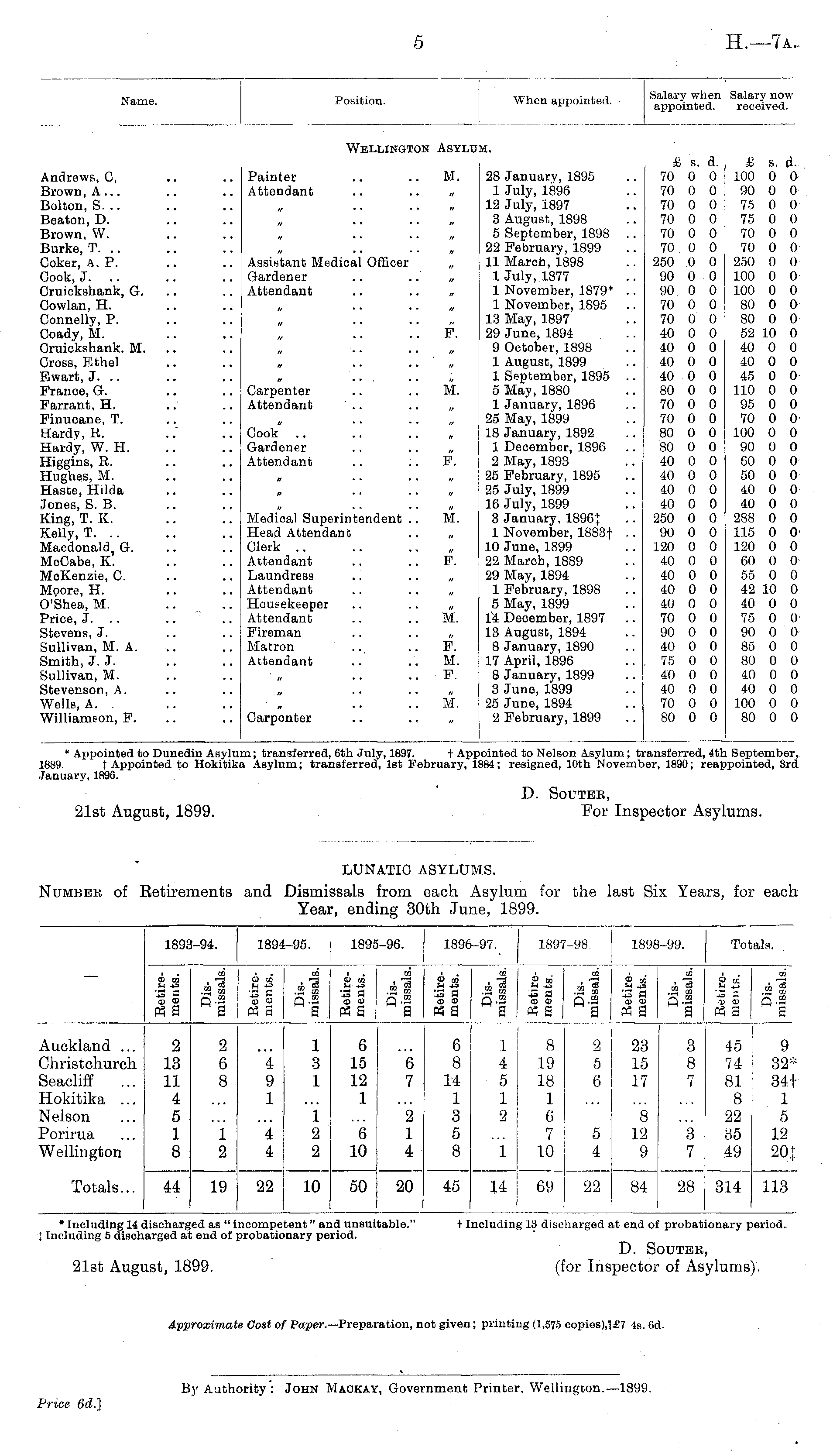 D. SOUTER, 21st August, 1899. (for Inspector of Asylums).