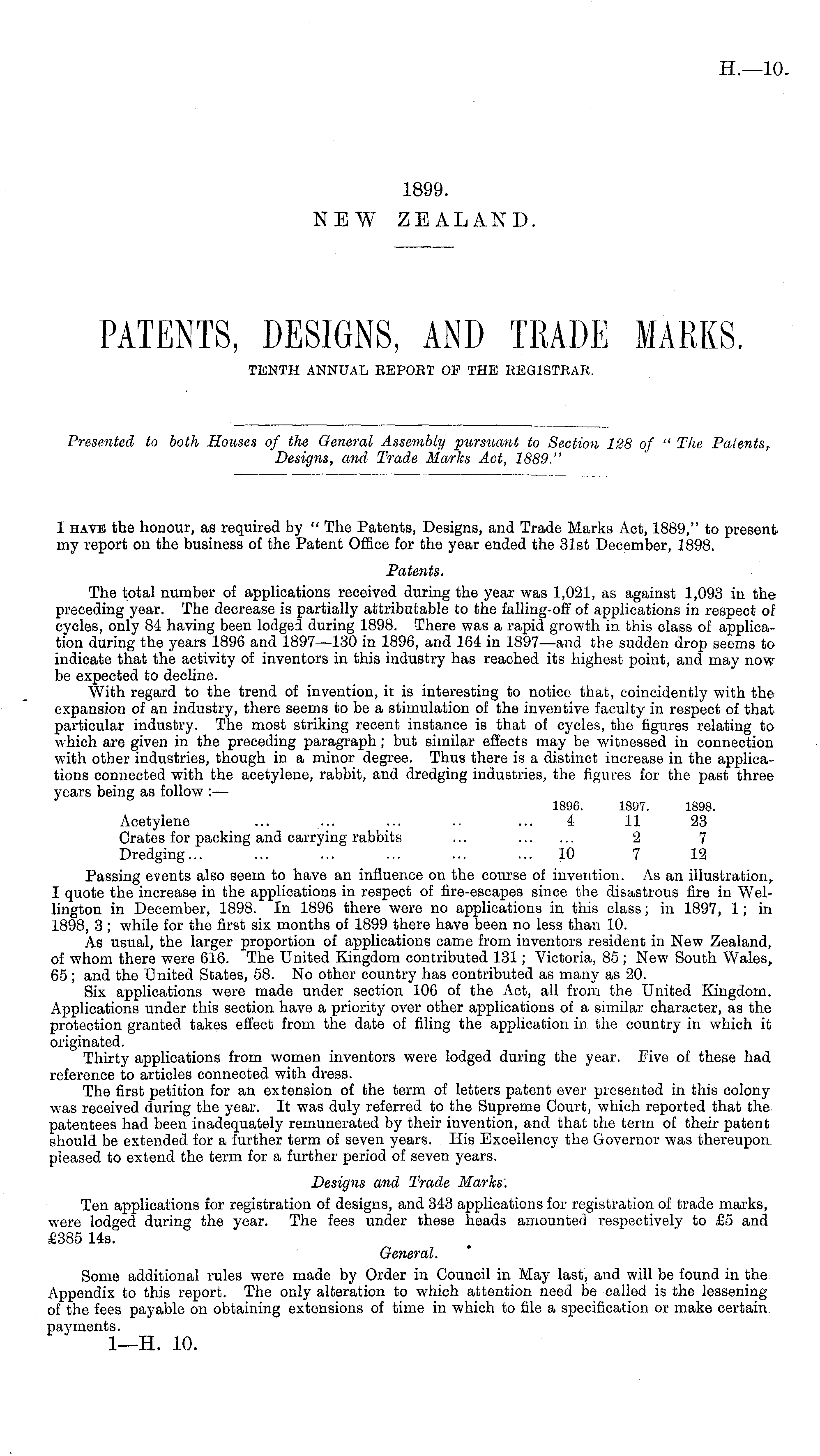 I have the honour, as required by " The Patents, Designs, and Trade Marks Act, 1889," to present my report on the business of the Patent Office for the year ended the 31st December, 1898. Patents. The total number of applications received during the year was 1,021, as against 1,093 in the preceding year. The decrease is partially attributable to the falling-oil of applications in respect of cycles, only 84 having been lodged during 1898. There was a rapid growth in this class of application during the years 1896 and 1897—130 in 1896, and 164 in 1897—and the sudden drop seems to indicate that the activity of inventors in this industry has reached its highest point, and may now be expected to decline. With regard to the trend of invention, it is interesting to notice that, coincidently with the expansion of an industry, there seems to be a stimulation of the inventive faculty in respect of that particular industry. The most striking recent instance is that of cycles, the figures relating to which are given in the preceding paragraph; but similar effects may be witnessed in connection with other industries, though in a minor degree. Thus there is a distinct increase in the applications connected with the acetylene, rabbit, and dredging industries, the figures for the past three years being as follow :— 1896. 1897. 1898. Acetylene ... ... ... .. ... 4 11 23 Crates for packing and carrying rabbits ... 2 7 Dredging... ... ... ... ... ... 10 7 12 Passing events also seem to have an influence on the course of invention. As an illustration, I quote the increase in the applications in respect of fire-escapes since the disastrous fire in Wellington in December, 1898. In 1896 there were no applications in this class; in 1897, 1; in 1898, 3; while for the first six months of 1899 there have been no less than 10. As usual, the larger proportion of applications came from inventors resident in New Zealand, of whom there were 616. The United Kingdom contributed 131; Victoria, 85 ; New South Wales, 65 ; and the United States, 58. No other country has contributed as many as 20. Six applications were made under section 106 of the Act, all from the United Kingdom. Applications under this section have a priority over other applications of a similar character, as the protection granted takes effect from the date of filing the application in the country in which it originated. Thirty applications from women inventors were lodged during the year. Five of these had reference to articles connected with dress. The first petition for an extension of the term of letters patent ever presented in this colony was received during the year. It was duly referred to the Supreme Court, which reported that the patentees had been inadequately remunerated by their invention, and that the term of their patent should be extended for a further term of seven years. His Excellency the Governor was thereupon pleased to extend the term for a further period of seven years. Designs and Trade Marks. Ten applications for registration of designs, and 343 applications for registration of trade marks, were lodged during the year. The fees under these heads amounted respectively to £5 and £385 14s. General. Some additional rules were made by Order in Council in May last, and will be found in the Appendix to this report. The only alteration to which attention need be called is the lessening of the fees payable on obtaining extensions of time in which to file a specification or make certain payments. I—H. 10.