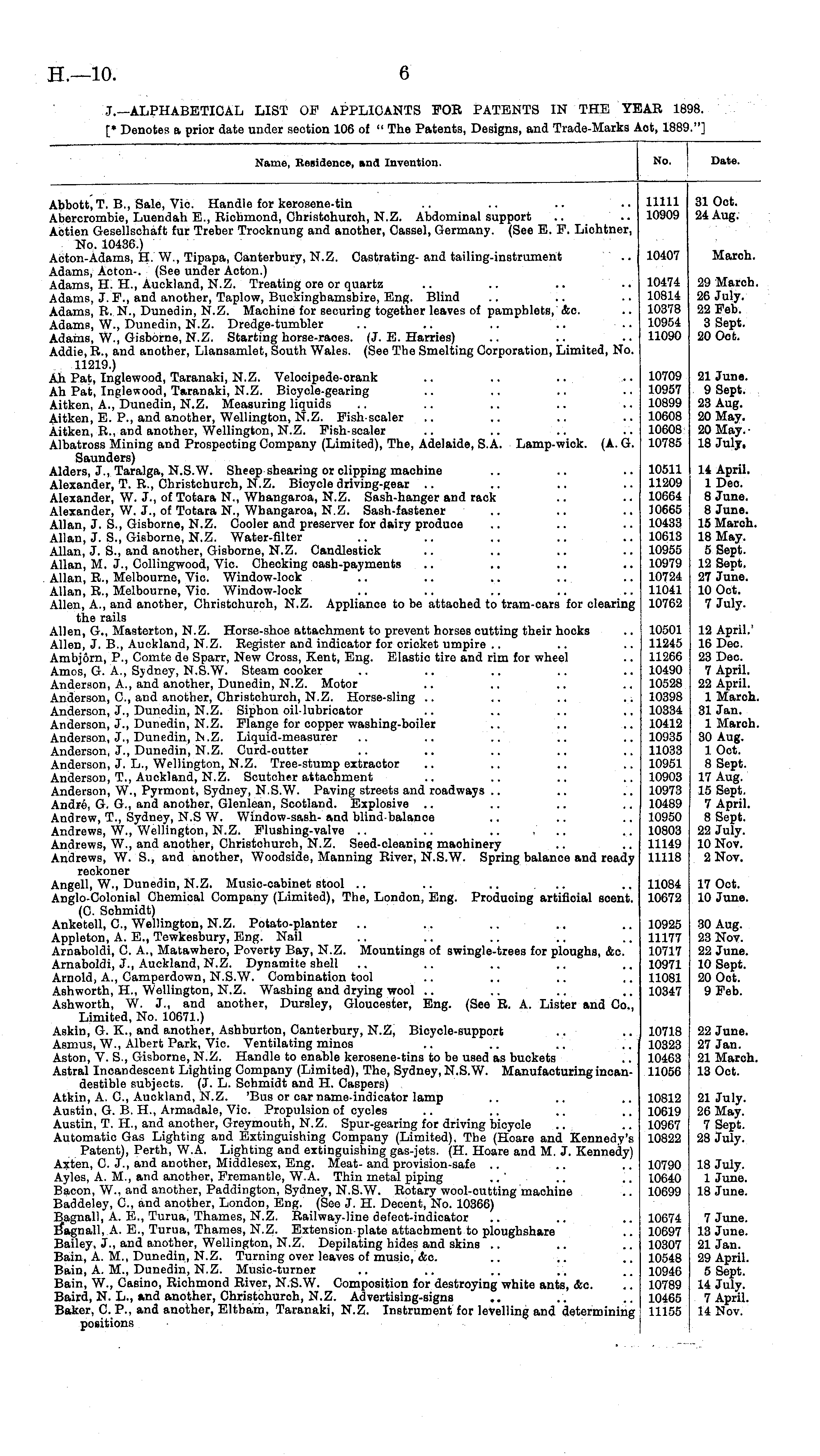 J.—ALPHABETICAL LIST OF APPLICANTS FOR PATENTS IN THE YEAR 1898. [Denotes a prior date under section 106 of "The Patents, Designs, and Trade-Marks Act, 1889."]