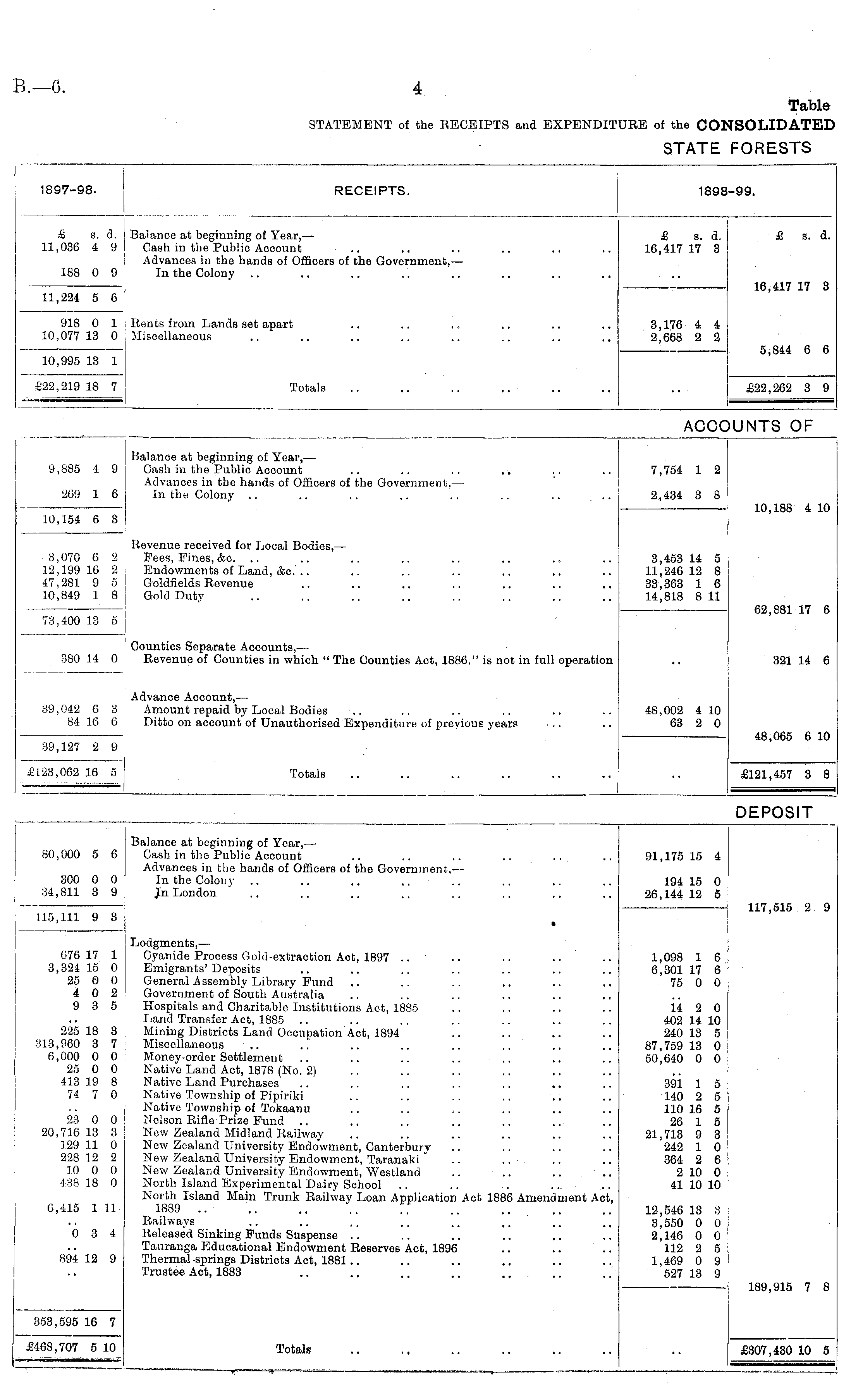 1897-98. RECEIPTS. 1898-99. £ s. d. 11,036 4 9 188 0 9 Balance at beginning of Year, — Cash in the Public Account Advances in the hands of Officers of the Government, — In the Colony £ s. d. 16,417 17 3 £ s. d. 16,417 17 3 11,224 5 6 918 0 1 10,077 13 0 Rents from Lands set apart Miscellaneous 3,176 4 4 2,668 2 2 10,995 13 1 5,844 6 6 £22,219 18 7 Totals £22,262 3 9 ACC UNTS OF 9,885 4 9 269 1 6 Balance at beginning of Year, — Cash in the Public Account .. .. .. ., Advances in the hands of Officers of the Government, — In the Colony .. .. .. .. .. ■ .. .. 7,754 1 2 2,434 3 8 10,154 6 3 Revenue received for Local Bodies, — Fees, Fines, &e. Endowments of Land, &c. Goldnelds Revenue Gold Duty 10,188 4 10 3,070 6 2 12,199 16 2 47,281 9 5 10,849 1 8 3,453 14 5 11,246 12 8 33,363 1 6 14,818 8 11 73,400 13 5 62,881 17 6 380 14 0 Counties Separate Accounts, — Revenue of Counties in which " The Counties Act, 1886," is not in full operation 321 14 6 39,042 6 3 84 16 6 Advance Account, — Amount repaid by Local Bodies Ditto on account of Unauthorised Expenditure of previous years 48,002 4 10 63 2 0 48,065 6 10 39,127 2 9 fc123,062 16 5 Totals £121,457 3 8 DEPOSIT 80,000 5 6 300 0 0 34,811 3 9 Balance at beginning of Year, — Cash in the Public Account Advances in the hands of Officers of the Government, — In the Colony In London 91,175 15 4 194 15 0 26,144 12 5 117,515 2 9 115,111 9 3 • 676 17 1 3,324 15 0 25 0 0 4 0 2 9 3 5 225 18 3 313,960 3 7 6,000 0 0 25 0 0 413 19 8 74 7 0 23 0 0 20,716 13 3 129 11 0 228 12 2 10 0 0 438 18 0 Lodgments,— Cyanide Process Gold-extraction Act, 1897 .. Emigrants' Deposits General Assembly Library Fund Government of South Australia Hospitals and Charitable Institutions Act, 1885 Land Transfer Act, 1885 Mining Districts Land Occupation Act, 1894 Miscellaneous Money-order Settlement Native Land Act, 1878 (No. 2) Native Land Purchases Native Township of Pipiriki Native Township of Tokaanu Nelson Rifle Prize Fund .. New Zealand Midland Railway New Zealand University Endowment, Canterbury New Zealand University Endowment, Taranaki New Zealand University Endowment, Westland North Island Experimental Dairy School North Island Main Trunk Railway Loan Application Act 1886 Amendment Act, 1889 .. .. .. .. f Railways Released Sinking Funds Suspense Tauranga Educational Endowment Reserves Act, 1896 .. .. Thermal -springs Districts Act, 1881 Trustee Act, 1883 .. .. .. .. ... 1,098 1 6 6,301 17 6 75 0 0 14 2 0 402 14 10 240 13 5 87,759 13 0 50,640 0 0 391 1 5 140 2 5 110 16 5 26 1 5 21,713 9 3 242 1 0 364 2 6 2 10 0 41 10 10 6,415 1 11 12,546 13 3 3,550 0 0 2,146 0 0 112 2 5 1,469 0 9 527 13 9 0 3 4 894 12 9 189,915 7 8 353,595 16 7 Totals !468,707 5 10 £307,430 10 5