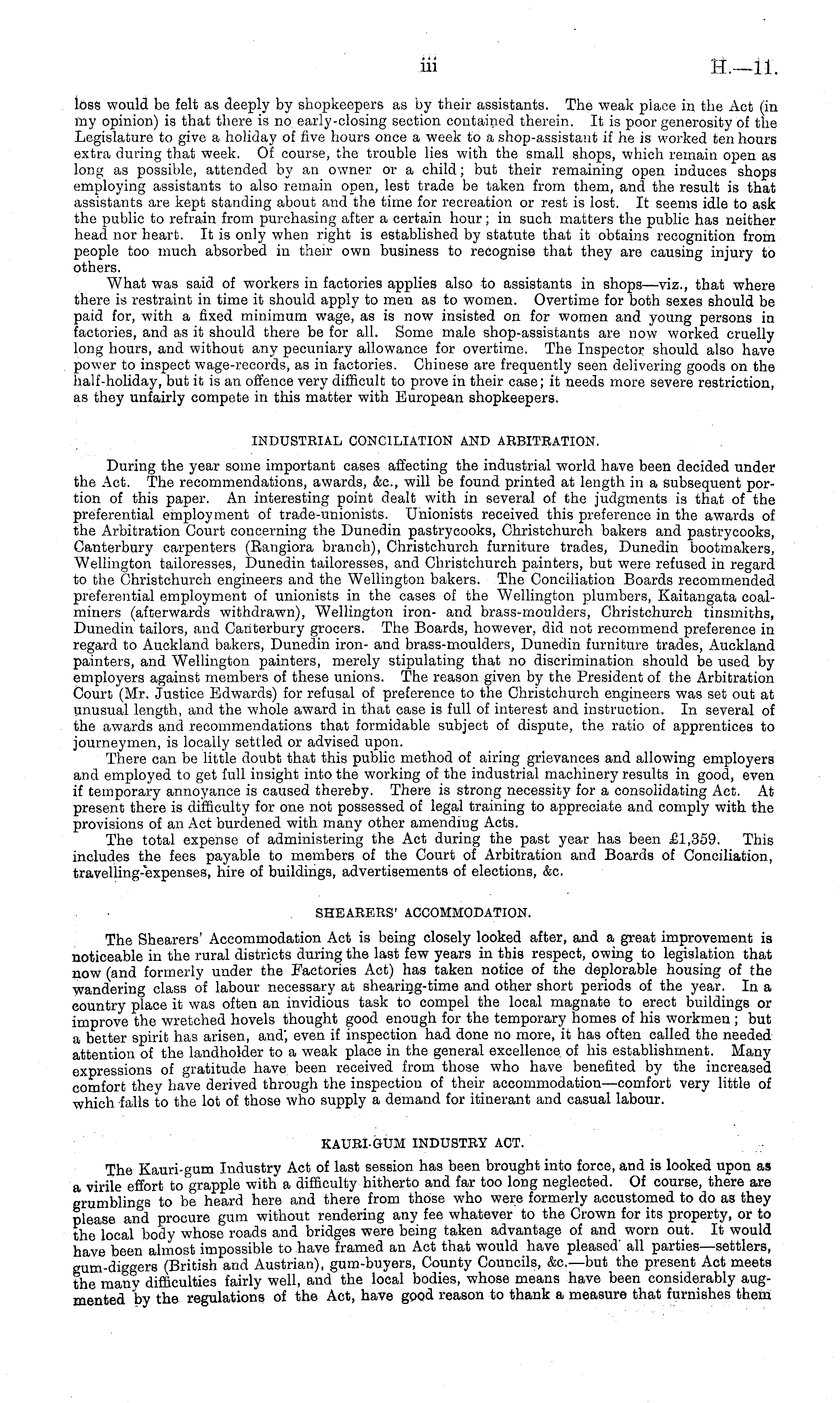 loss would be felt as deeply by shopkeepers as by their assistants. The weak place in the Act (in my opinion) is that there is no early-closing section contained therein. It is poor generosity of the Legislature to give a holiday of five hours once a week to a shop-assistant if he is worked ten hours extra during that week. Of course, the trouble lies with the small shops, which remain open as long as possible, attended by an owner or a child; but their remaining open induces shops employing assistants to also remain open, lest trade be taken from them, and the result is that assistants are kept standing about and the time for recreation or rest is lost. It seems idle to ask the public to refrain from purchasing after a certain hour; in such matters the public has neither head nor heart. It is only when right is established by statute that it obtains recognition from people too much absorbed in their own business to recognise that they are causing injury to others. What was said of workers in factories applies also to assistants in shops—viz., that where there is restraint in time it should apply to men as to women. Overtime for both sexes should be paid for, with a fixed minimum wage, as is now insisted on for women and young persons in factories, and as it should there be for all. Some male shop-assistants are now worked cruelly long hours, and without any pecuniary allowance for overtime. The Inspector should also have power to inspect wage-records, as in factories. Chinese are frequently seen delivering goods on the half-holiday, but it is an offence very difficult to prove in their case; it needs more severe restriction, as they unfairly compete in this matter with European shopkeepers. INDUSTRIAL CONCILIATION AND ARBITRATION. During the year some important cases affecting the industrial world have been decided under the Act. The recommendations, awards, &c, will be found printed at length in a subsequent portion of this paper. An interesting point dealt with in several of the judgments is that of the preferential employment of trade-unionists. Unionists received this preference in the awards of the Arbitration Court concerning the Dunedin pastrycooks, Christchurch bakers and pastrycooks, Canterbury carpenters (Eangiora branch), Christchurch furniture trades, Dunedin bootmakers, Wellington tailoresses, Dunedin tailoresses, and Christchurch painters, but were refused in regard to the Christchurch engineers and the Wellington bakers. The Conciliation Boards recommended preferential employment of unionists in the cases of the Wellington plumbers, Kaitangata coalminers (afterwards withdrawn), Wellington iron- and brass-moulders, Christchurch tinsmiths, Dunedin tailors, and Canterbury grocers. The Boards, however, did not recommend preference in regard to Auckland bakers, Dunedin iron- and brass-moulders, Dunedin furniture trades, Auckland painters, and Wellington painters, merely stipulating that no discrimination should be used by employers against members of these unions. The reason given by the President of the Arbitration Court (Mr. justice Edwards) for refusal of preference to the Christchurch engineers was set out at unusual length, and the whole award in that case is full of interest and instruction. In several of the awards and recommendations that formidable subject of dispute, the ratio of apprentices to journeymen, is locally settled or advised upon. There can be little doubt that this public method of airing grievances and allowing employers and employed to get full insight into the working of the industrial machinery results in good, even if temporary annoyance is caused thereby. There is strong necessity for a consolidating Act. At present there is difficulty for one not possessed of legal training to appreciate and comply with, the provisions of an Act burdened with many other amending Acts. The total expense of administering the Act during the past year has been £1,359. This includes the fees payable to members of the Court of Arbitration and Boards of Conciliation, travelling-expenses, hire of buildings, advertisements of elections, &c. SHEARERS' ACCOMMODATION. The Shearers' Accommodation Act is being closely looked after, and a great improvement is noticeable in the rural districts during the last few years in this respect, owing to legislation that now (and formerly under the Factories Act) has taken notice of the deplorable housing of the wandering class of labour necessary at shearing-time and other short periods of the year. In a country place it was often an invidious task to compel the local magnate to erect buildings or improve the wretched hovels thought good enough for the temporary homes of his workmen ; but a better spirit has arisen, and', even if inspection had done no more, it has often called the needed attention of the landholder to a weak place in the general excellence of his establishment. Many expressions of gratitude have been received from those who have benefited by the increased comfort they have derived through the inspection of their accommodation—comfort very little of which falls to the lot of those who supply a demand for itinerant and casual labour. KAURI-GUM INDUSTRY ACT. The Kauri-gum Industry Act of last session has been brought into force, and is looked upon as a virile effort to°grapple with a difficulty hitherto and far too long neglected. Of course, there are grumblings to be heard here and there from those who were formerly accustomed to do as they please and procure gum without rendering any fee whatever to the Crown for its property, or to the local body whose roads and bridges were being taken advantage of and worn out. It would have been almost impossible to have framed an Act that would have pleased' all parties—settlers, cmm-diffgers (British and Austrian), gum-buyers, County Councils, &c.—but the present Act meets the many difficulties fairly well, and the local bodies, whose means have been considerably augmented 