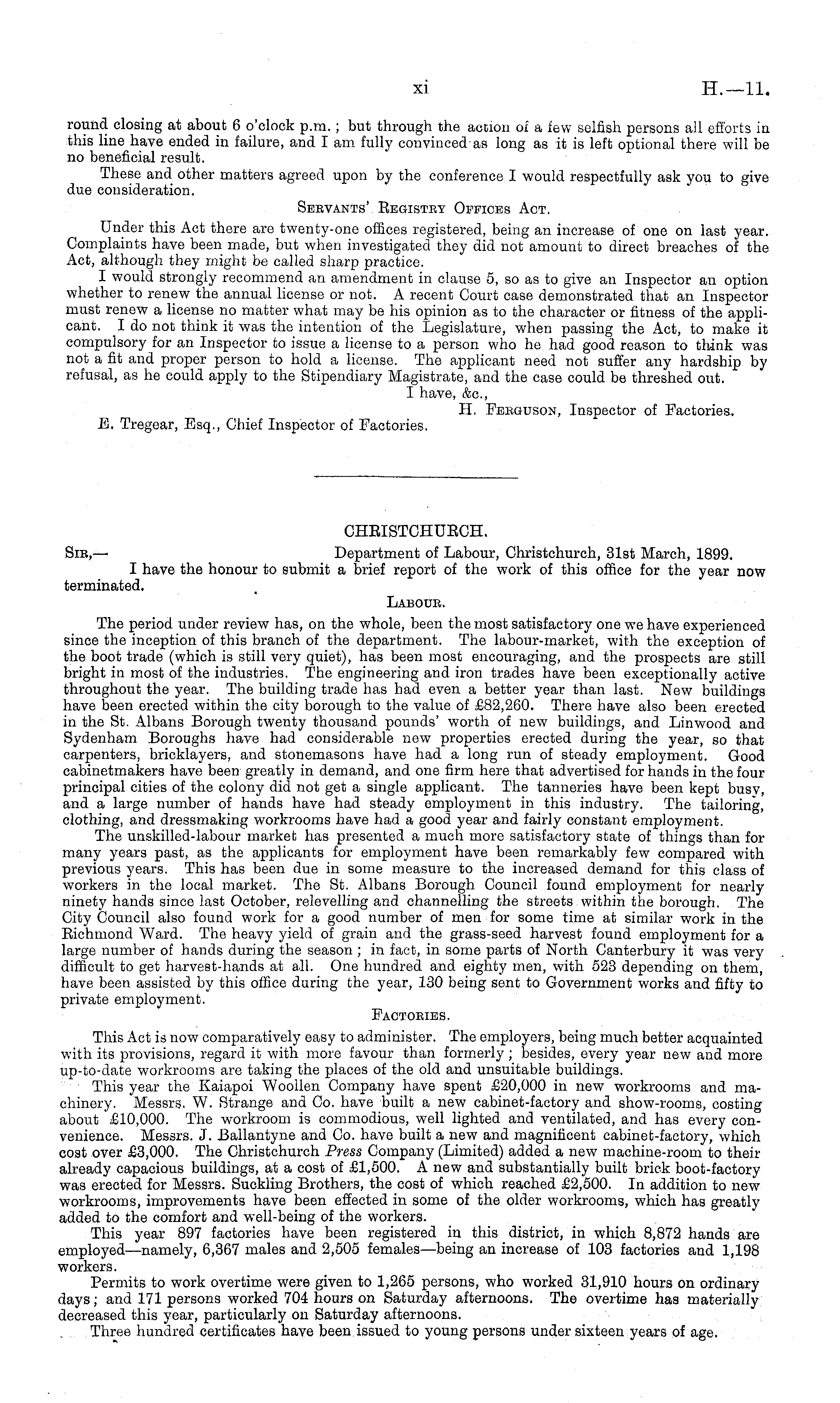 CHEISTGHUEGH. Sib, —■ Department of Labour, Christchurch, 31st March, 1899. I have the honour to submit a brief report of the work of this office for the year now terminated. Labouk. The period under review has, on the whole, been the most satisfactory one we have experienced since the inception of this branch of the department. The labour-market, with the exception of the boot trade (which is still very quiet), has been most encouraging, and the prospects are still bright in most of the industries. The engineering and iron trades have been exceptionally active throughout the year. The building trade has had even a better year than last. New buildings have been erected within the city borough to the value of £82,260. There have also been erected in the St. Albans Borough twenty thousand pounds' worth of new buildings, and Linwood and Sydenham Boroughs have had considerable new properties erected during the year, so that carpenters, bricklayers, and stonemasons have had a long run of steady employment. Good cabinetmakers have been greatly in demand, and one firm here that advertised for hands in the four principal cities of the colony did not get a single applicant. The tanneries have been kept busy, and a large number of hands have had steady employment in this industry. The tailoring, clothing, and dressmaking workrooms have had a good year and fairly constant employment. The unskilled-labour market has presented a much more satisfactory state of things than for many years past, as the applicants for employment have been remarkably few compared with previous years. This has been due in some measure to the increased demand for this class of workers in the local market. The St. Albans Borough Council found employment for nearly ninety hands since last October, relevelling and channelling the streets within the borough. The City Council also found work for a good number of men for some time at similar work in the Richmond Ward. The heavy yield of grain and the grass-seed harvest found employment for a large number of hands during the season ; in fact, in some parts of North Canterbury it was very difficult to get harvest-hands at all. One hundred and eighty men, with 523 depending on them, have been assisted by this office during the year, 130 being sent to Government works and fifty to private employment. Factories. This Act is now comparatively easy to administer. The employers, being much better acquainted with its provisions, regard it with more favour than formerly ; besides, every year new and more up-to-date workrooms are taking the places of the old and unsuitable buildings. This year the Kaiapoi Woollen Company have spent £20,000 in new workrooms and machinery. Messrs. W. Strange and Co. have built a new cabinet-factory and show-rooms, costing about £10,000. The workroom is commodious, well lighted and ventilated, and has every convenience. Messrs. J. Ballantyne and Co. have built a new and magnificent cabinet-factory, which cost over £3,000. The Christchurch Press Company (Limited) added a new machine-room to their already capacious buildings, at a cost of £1,500. A new and substantially built brick boot-factory was erected for Messrs. Suckling Brothers, the cost of which reached £2,500. In addition to new workrooms, improvements have been effected in some of the older workrooms, which has greatly added to the comfort and well-being of the workers. This year 897 factories have been registered in this district, in which 8,872 hands are employed —namely, 6,367 males and 2,505 females—being an increase of 103 factories and 1,198 workers. Permits to work overtime were given to 1,265 persons, who worked 31,910 hours on ordinary days; and 171 persons worked 704 hours on Saturday afternoons. The overtime has materially decreased this year, particularly on Saturday afternoons. Three hundred certificates have been issued to young persons under sixteen years of age.