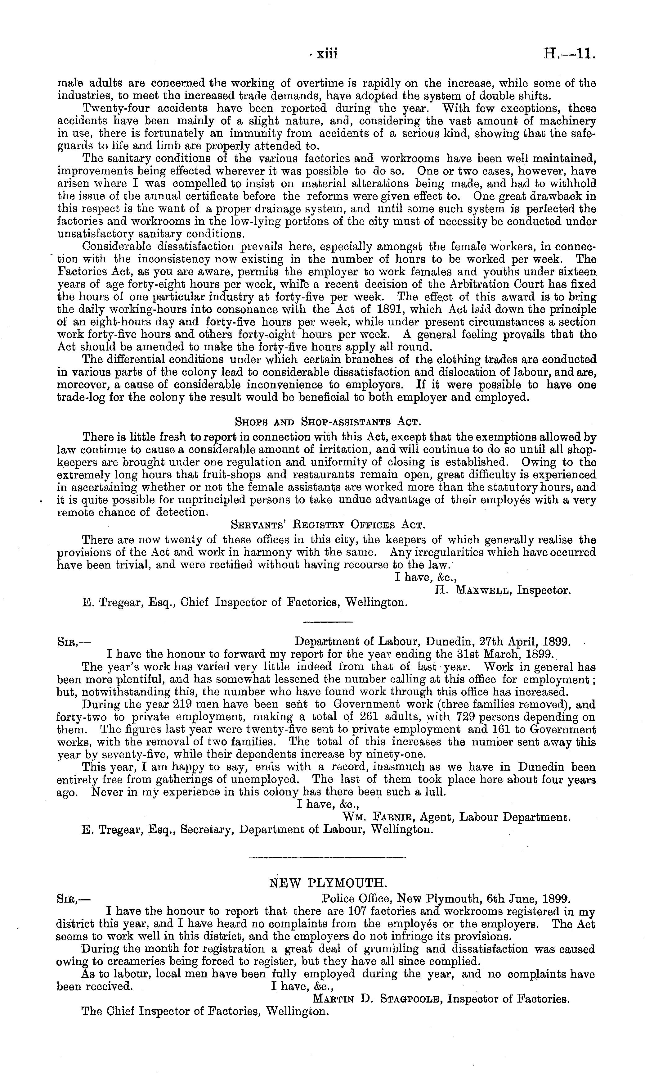 NEW PLYMOUTH. Sic,— Police Office, New Plymouth, 6th June, 1899. I have the honour to report that there are 107 factories and workrooms registered in my district this year, and I have heard no complaints from the employes or the employers. The Act seems to work well in this district, and the employers do not infringe its provisions. During the month for registration a great deal of grumbling and dissatisfaction was caused owing to creameries being forced to register, but they have all since complied. As to labour, local men have been fully employed during the year, and no complaints have been received. I have, &c, Maetin D. Stagpoole, Inspector of Factories. The Chief Inspector of Factories, Wellington.