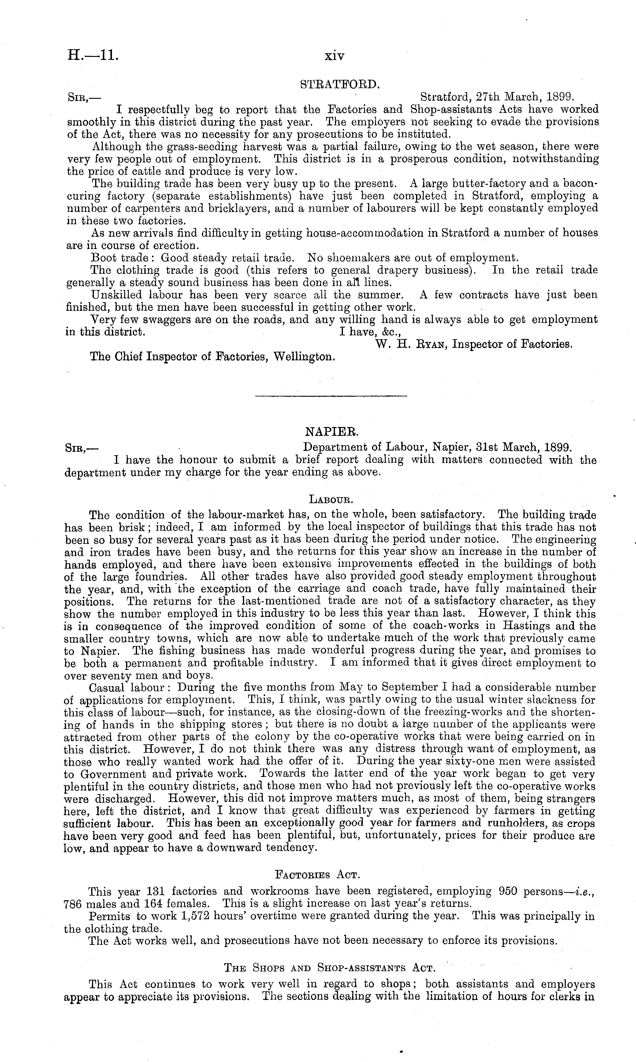 NAPIEE. Sib, — Department of Labour, Napier, 31st March, 1899. I have the honour to submit a brief report dealing with matters connected with the department under my charge for the year ending as above. Laboub. The condition of the labour-market has, on the whole, been satisfactory. The building trade has been brisk ; indeed, I am informed by the local inspector of buildings that this trade has not been so busy for several years past as it has been during the period under notice. The engineering and iron trades have been busy, and the returns for this year show an increase in the number of hands employed, and there have been extensive improvements effected in the buildings of both of the large foundries. All other trades have also provided good steady employment throughout the year, and, with the exception of the carriage and coach trade, have fully maintained their positions. The returns for the last-mentioned trade are not of a satisfactory character, as they show the number employed in this industry to be less this year than last. However, I think this is in consequence of the improved condition of some of the coach-works in Hastings and the smaller country towns, which are now able to undertake much of the work that previously came to Napier. The fishing business has made wonderful progress during the year, and promises to be both a permanent and profitable industry. I am informed that it gives direct employment to over seventy men and boys. Casual labour : During the five months from May to September I had a considerable number of applications for employment. This, I think, was partly owing to the usual winter slackness for this class of labour —such, for instance, as the closing-down of the freezing-works and the shortening of hands in the shipping stores ; but there is no doubt a large number of the applicants were attracted from other parts of the colony by the co-operative works that were being carried on in this district. However, I do not think there was any distress through want of employment, as those who really wanted work had the offer of it. During the year sixty-one men were assisted to Government and private work. Towards the latter end of the year work began to get very plentiful in the country districts, and those men who had not previously left the co-operative works were discharged. However, this did not improve matters much, as most of them, being strangers here, left the district, and I know that great difficulty was experienced by farmers in getting sufficient labour. This has been an exceptionally good year for farmers and runholders, as crops have been very good and feed has been plentiful, but, unfortunately, prices for their produce are low, and appear to have a downward tendency. Factobies Act. This year 131 factories and workrooms have been registered, employing 950 persons— i.e., 786 males and 164 females. This is a slight increase on last year's returns. Permits to work 1,572 hours' overtime were granted during the year. This was principally in the clothing trade. The Act works well, and prosecutions have not been necessary to enforce its provisions. The Shops and Shop-assistants Act. This Act continues to work very well in regard to shops; both assistants and employers appear to appreciate its provisions. The sections dealing with the limitation of hours for clerks in