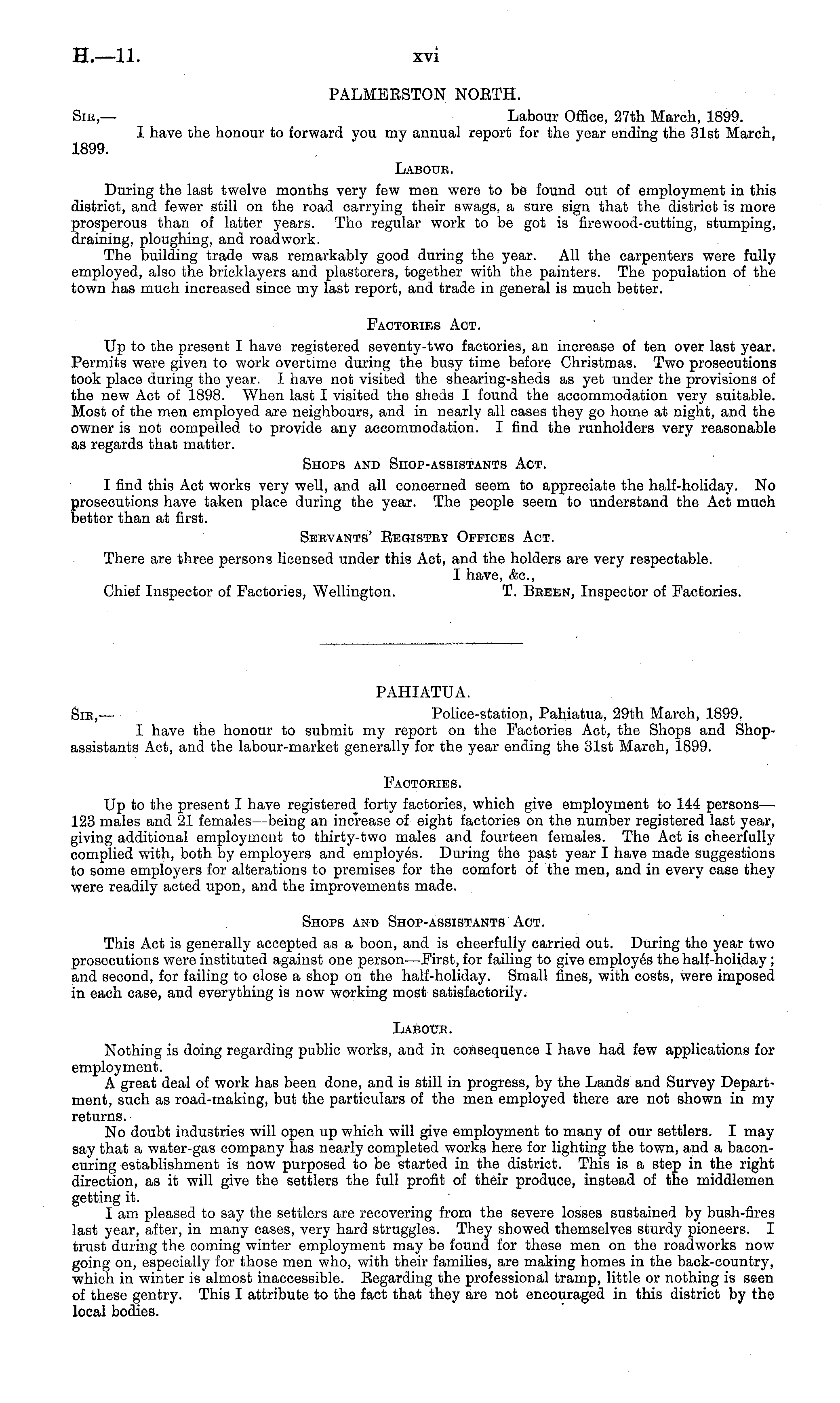 PALMERSTON NOETH. Sib,— Labour Office, 27th March, 1899. I have the honour to forward you my annual report for the year ending the 31st March, 1899. Labour. During the last twelve months very few men were to be found out of employment in this district, and fewer still on the road carrying their swags, a sure sign that the district is more prosperous than of latter years. The regular work to be got is firewood-cutting, stumping, draining, ploughing, and road work. The building trade was remarkably good during the year. All the carpenters were fully employed, also the bricklayers and plasterers, together with the painters. The population of the town has much increased since my last report, and trade in general is much better. Factories Act. Up to the present I have registered seventy-two factories, an increase of ten over last year. Permits were given to work overtime during the busy time before Christmas. Two prosecutions took place during the year. I have not visited the shearing-sheds as yet under the provisions of the new Act of 1898. When last I visited the sheds I found the accommodation very suitable. Most of the men employed are neighbours, and in nearly all cases they go home at night, and the owner is not compelled to provide any accommodation. I find the runholders very reasonable as regards that matter. Shops and Shop-assistants Act. I find this Act works very well, and all concerned seem to appreciate the half-holiday. No prosecutions have taken place during the year. The people seem to understand the Act much better than at first. Servants' Registry Offices Act. There are three persons licensed under this Act, and the holders are very respectable. I have, &c., Chief Inspector of Factories, Wellington. T. Breen, Inspector of Factories.