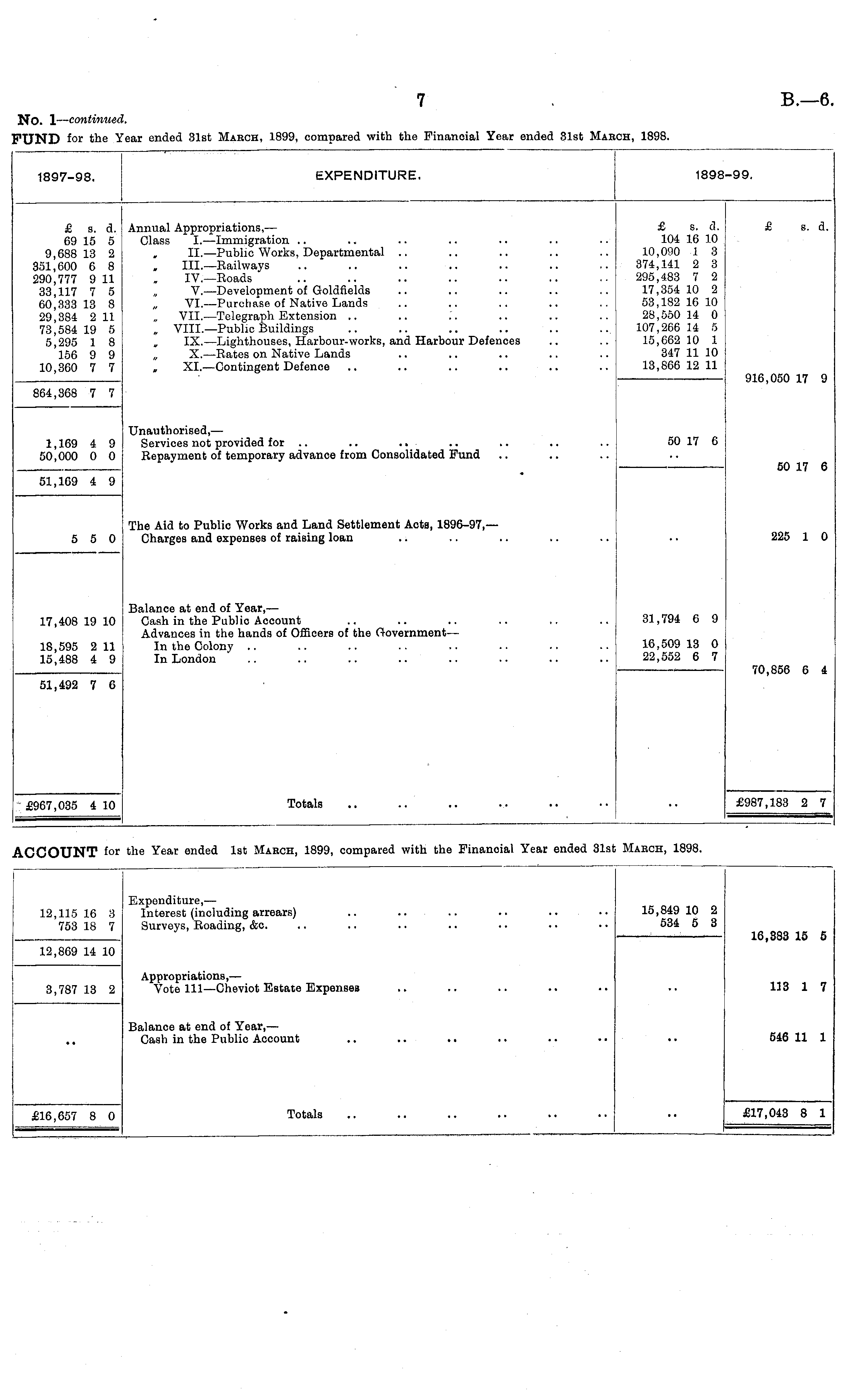 1897-98. EXPENDITURE. 1898-99. £ s. a. 69 15 5 9,688 13 2 351,600 6 8 290,777 9 11 33,117 7 5 60,333 13 8 29,384 2 11 73,584 19 5 5,295 1 8 156 9 9 10,360 7 7 Annual Appropriations, — Class I.—Immigration .. , II. —Public Works, Departmental .. „ III.—Railways IV.—Roads V. —Development of Goldfields „ VI.—Purchase of Native Lands VII.—Telegraph Extension .. , VIII.—Public Buildings IX.—Lighthouses, Harbour-works, and Harbour Defences X.—Rates on Native Lands , XI. —Contingent Defence £ s. d. 104 16 10 10,090 1 8 374,141 2 3 295,483 7 2 17,354 10 2 53,182 16 10 28,550 14 0 107,266 14 5 15,662 10 1 347 11 10 13,866 12 11 £ s. a. 864,368 7 7 916,050 17 9 Unauthorised, — Services not provided for .. .. Repayment of temporary advance from Consolidated Fund 50 17 6 1,169 4 9 50,000 0 0 50 17 6 51,169 4 9 5 5 0 The Aid to Public Works and Land Settlement Acts, 1896-97,— Charges and expenses of raising loan 225 1 0 17,408 19 10 Balance at ena of Year, — Cash in the Public Account Aavances in the hanas of Officers of the Government — In the Colony In Lonaon 31,794 6 9 18,595 2 11 15,488 4 9 16,509 13 0 22,552 6 7 70,856 6 4 51,492 7 6 Totals £967,035 4 10 £987,183 2 7