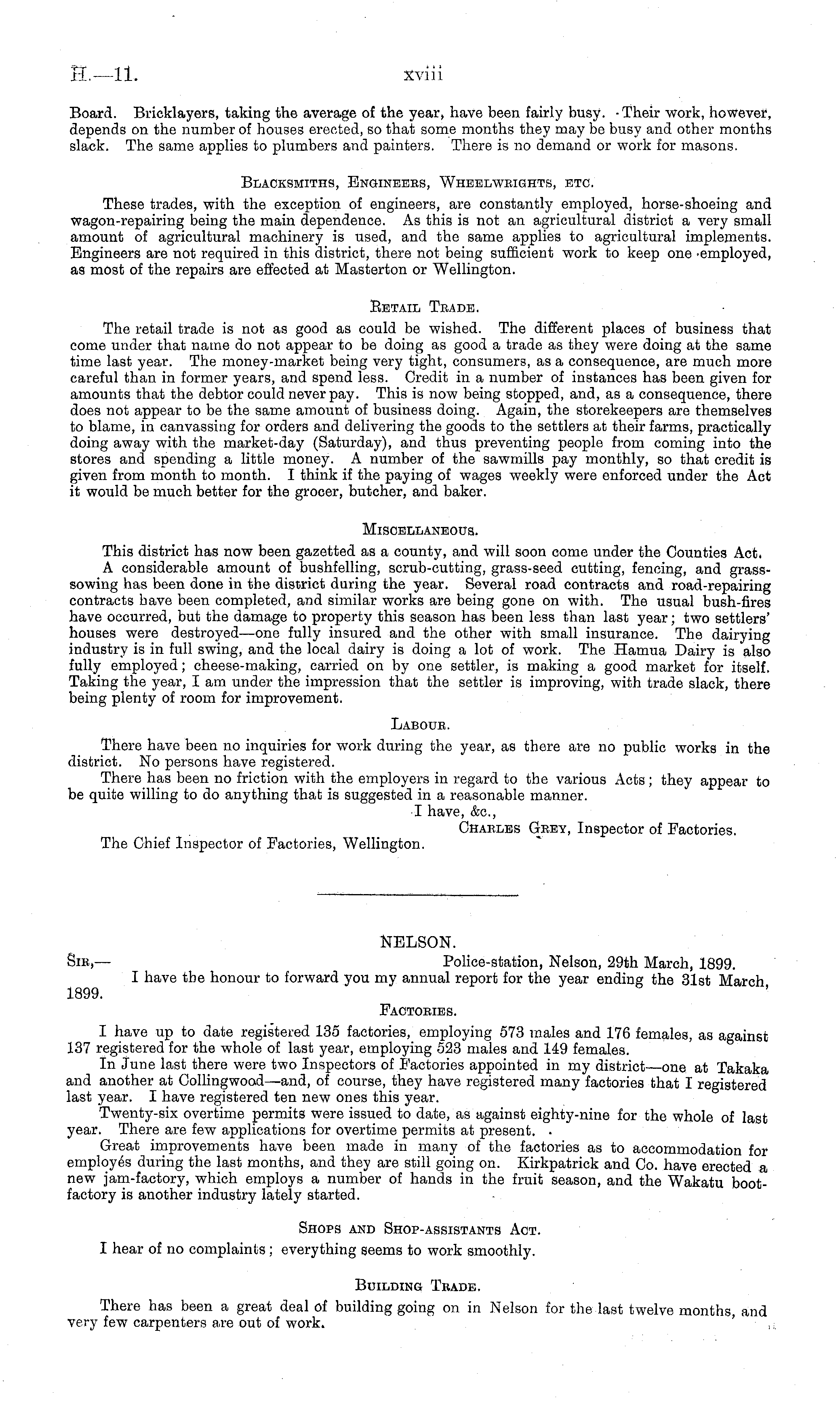 NELSON. Sib, — Police-station, Nelson, 29th March, 1899. I have the honour to forward you my annual report for the year ending the 31st March 1899. Factobies. I have up to date registered 135 factories, employing 573 males and 176 females, as against 137 registered for the whole of last year, employing 523 males and 149 females. In June last there were two Inspectors of Factories appointed in my district—one at Takaka and another at Collingwood—and, of course, they have registered many factories that I registered last year. I have registered ten new ones this year. Twenty-six overtime permits were issued to date, as against eighty-nine for the whole of last year. There are few applications for overtime permits at present. . Great improvements have been made in many of the factories as to accommodation for employes during the last months, and they are still going on. Kirkpatrick and Co. have erected a new jam-factory, which employs a number of hands in the fruit season, and the Wakatu bootfactory is another industry lately started. Shops and Shop-assistants Act. I hear of no complaints; everything seems to work smoothly. Building Tbade. There has been a great deal of building going on in Nelson for the last twelve months, and very few carpenters are out of work.