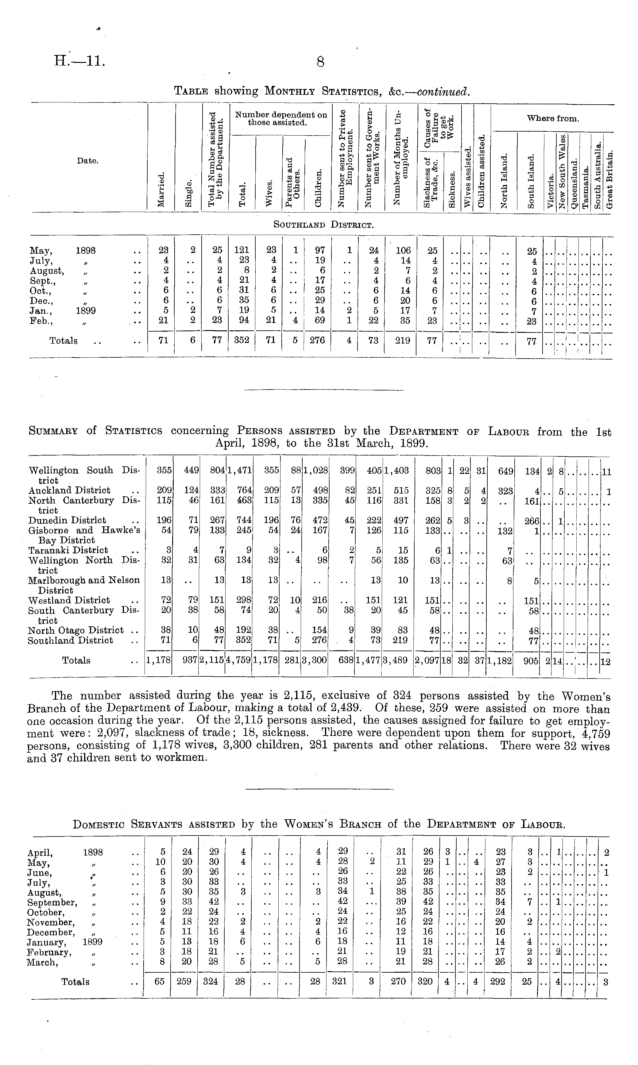 Summary of Statistics concerning Persons assisted by the Department of Labour from the 1st April, 1898, to the 31st March, 1899.