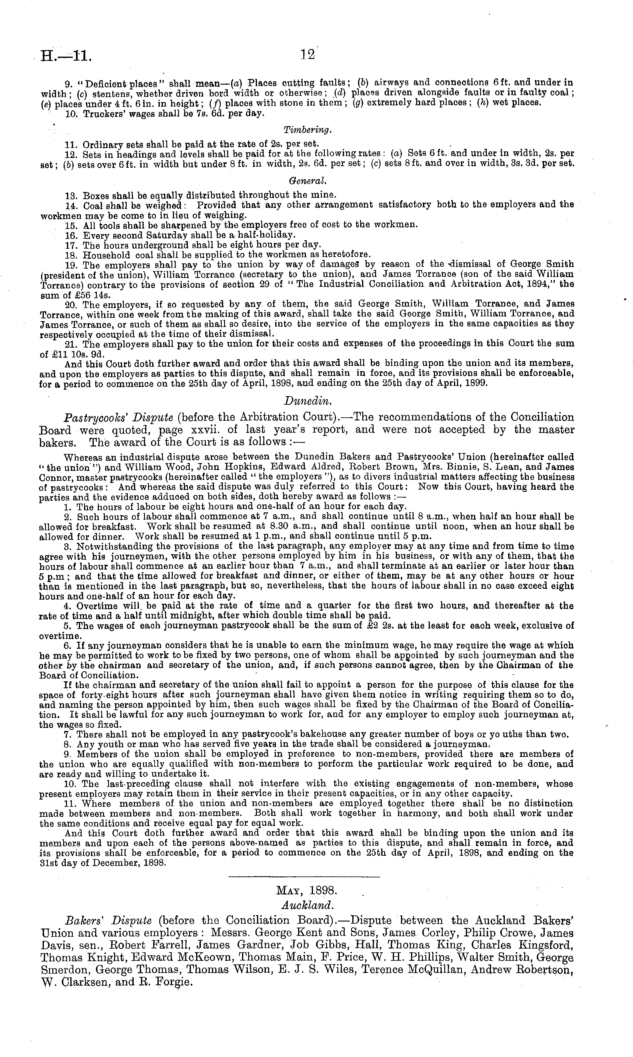 9. "Defioient places" shall mean— (a) Places cutting faults; (b) airways and connections 6ft. and under in width; (c) stentens, whether driven bord width or otherwise; (d) places driven alongside faults or in faulty coal; (c) places under 4 ft. 6 in. in height; (/) places with stone in them ; {g) extremely hard places; (h) wet places. 10. Truckers' wages shall be 7s. 6d. per day. Timbering. 11. Ordinary sets shall be paid at the rate of 2s. per set. 12. Sets in headings and levels shall be paid for at the following rates : (a) Seta 6 ft. and under in width, 2s. per set; (b) sets over 6 ft. in width but under 8 ft. in width, 2s. 6d. per set; (c) sets 8 ft. and over in width, 3s. 3d. per set. General. 13. Boxes shall be equally distributed throughout the mine. 14. Coal shall be weighed: Provided that any other arrangement satisfactory both to the employers and the workmen may be come to in lieu of weighing. 15. All tools shall be sharpened by the employers free of cost to the workmen. 16. Every second Saturday shall be a half-holiday. 17. The hours underground shall be eight hours per day. 18. Household coal shall be supplied to the workmen as heretofore. 19. The employers shall pay to the union by way of damages by reason of the -dismissal of George Smith (president of the union), William Torrance (secretary to the union), and James Torrance (eon of the said William Torrance) contrary to the provisions of section 29 of " The Industrial Conciliation and Arbitration Act, 1894," the sum of £56 14s. 20. The employers, if so requested by any of them, the said George Smith, William Torrance, and James Torrance, within one week from the making of this award, shall take the said George Smith, William Torrance, and James Torranoe, or such of them as shall so desire, into the service of the employers in the same capacities as they respectively occupied at the time of their dismissal. 21. The employers shall pay to the union for their costs and expenses of the proceedings in this Court the sum of £11 10s. 9d. And this Court doth further award and order that this award shall be binding upon the union and its members, and upon the employers as parties to this dispute, and shall remain in force, and its provisions shall be enforceable, for a period to commence on the 25th day of April, 1898, and ending on the 25th day of April, 1899. Dunedin. Pastrycooks' Dispute (before the Arbitration Court). —The recommendations of the Conciliation Board were quoted, page xxvii. of last year's report, and were not accepted by the master bakers. The award of the Court is as follows :— Whereas an industrial dispute arose between the Dunedin Bakers and Pastryoooks' Union (hereinafter called " the union ") and William Wood, John Hopkins, Edward Aldred, Robert Brown, Mrs. Binnie, S. Lean, and James Connor, master pastrycooks (hereinafter called " the employers "), as to divers industrial matters affecting the business of pastrycooks : And whereas the said dispute was duly referred to this Court: Now this Court, having heard the parties and the evidence adduoed on both sides, doth hereby award as follows : — 1. The hours of labour be eight hours and one-half of an hour for each day. 2. Suoh hours of labour shall commence at 7 a.m., and shall continue until 8 a.m., when half an hour shall be allowed for breakfast. Work shall be resumed at 8.30 a.m., and shall continue until noon, when an hour shall be allowed for dinner. Work shall be resumed at 1 p.m., and shall oontinue until 5 p.m. 3. Notwithstanding the provisions of the last paragraph, any employer may at any time and from time to time agree with his journeymen, with the other persons employed by him in his business, or with any of them, that the hours of labour shall commence at an earlier hour than 7 a.m., and shall terminate at an earlier or later hour than 5 p.m; and that the time allowed for breakfast and dinner, or either of them, may be at any other hours or hour than is mentioned in the last paragraph, but so, nevertheless, that the hours of labour shall in no oase exceed eight hours and one-half of an hour for each day. 4. Overtime will be paid at the rate of time and a quarter for the first two hours, and thereafter at the rate of time and a half until midnight, after which double time shall be paid. 5. The wages of eaoh journeyman pastryoook shall be the sum of £2 2s. at the least for each week, exolusive of overtime. 6. If any journeyman considers that he is unable to earn the minimum wage, he may require the wage at whioh he may be permitted to work to be fixed by two persons, one of whom shall be appointed by such journeyman and the other by the chairman and seoretary of the union, and, if such persons cannot agree, then by the Chairman of the Board of Conciliation. If the chairman and seoretary of the union shall fail to appoint a person for the purpose of this clause for the space of forty-eight hours after such journeyman shall have given them notice in writing requiring them so to do, and naming the person appointed by him, then such wages shall be fixed by the Chairman of the Board of Conoiliation. It shall be lawful for any such journeyman to work for, and for any employer to employ such journeyman at, the wages so fixed. 7. There shall not be employed in any pastrycook's bakehouse any greater number of boys or youths than two. 8. Any youth or man who has served five years in the trade shall be considered a journeyman. 9. Members of the union shall be employed in preference to non-members, provided there are members of the union who are equally qualified with non-members to perform the particular work required to be done, and are ready and willing to undertake it. 10. The last-preceding clause shall not interfere with the existing engagements of non-members, whose present employers may retain them in their service in their present capacities, or in any other capacity. 11. Where members of the union and non-members are employed together t