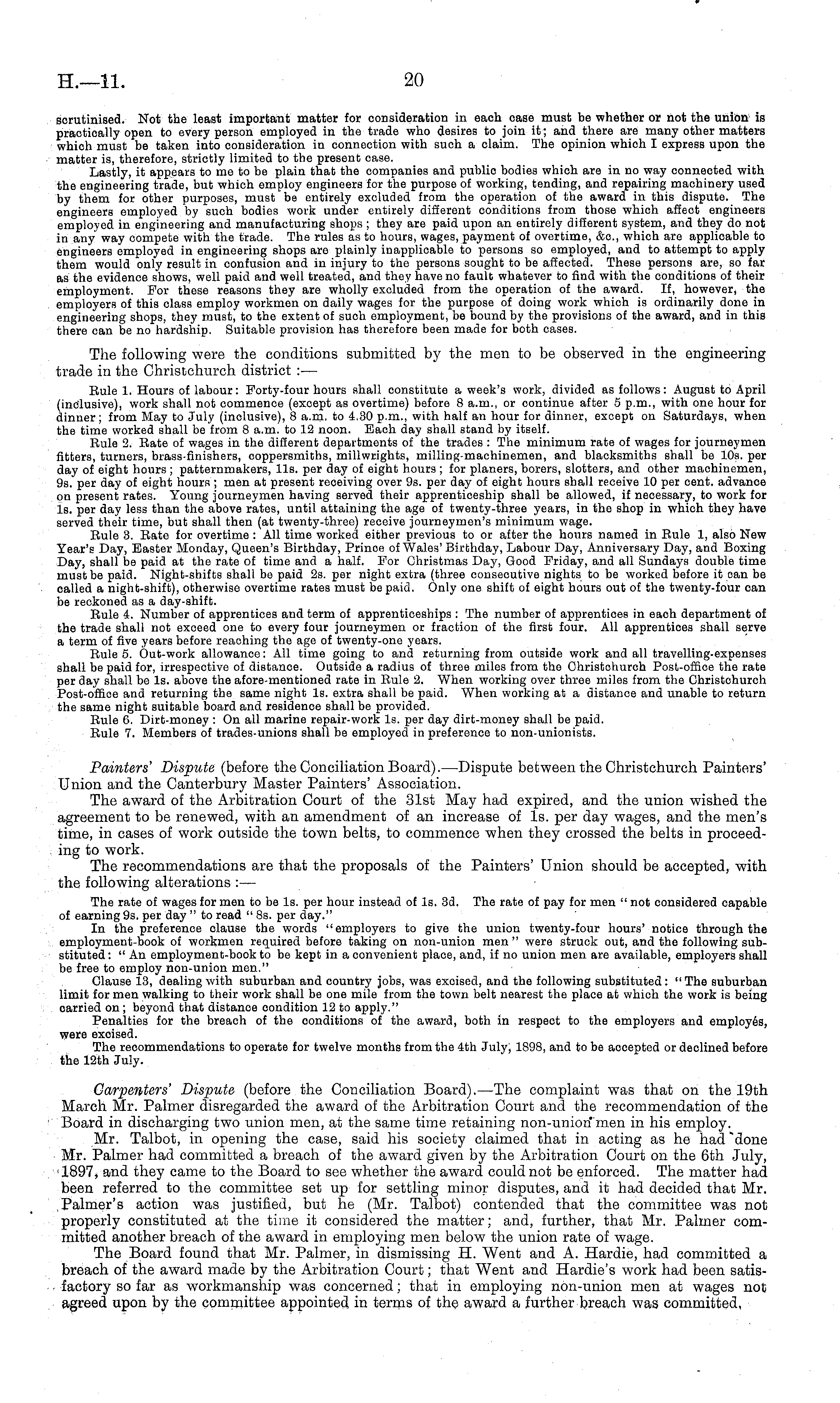 scrutinised. Not the least important matter for consideration in each case must be whether or not the union is practically open to every person employed in the trade who desires to join it; and there are many other matters which must be taken into consideration in connection with such a claim. The opinion which I express upon the matter is, therefore, strictly limited to the present case. Lastly, it appears to me to be plain that the companies and public bodies which are in no way connected with the engineering trade, but which employ engineers for the purpose of working, tending, and repairing machinery used by them for other purposes, must be entirely excluded from the operation of the award in this dispute. The engineers employed by such bodies work under entirely different conditions from those which affect engineers employed in engineering and manufacturing shops ; they are paid upon an entirely different system, and they do not in any" way compete with the trade. The rules as to hours, wages, payment of overtime, &c, which are applicable to engineers employed in engineering shops are plainly inapplicable to persons so employed, and to attempt to apply them would only result in confusion and in injury to the persons sought to be affected. These persons are, so far as the evidence shows, well paid and well treated, and they have no fault whatever to find with the conditions of their employment. For these reasons they are wholly excluded from the operation of the award. If, however, the employers of this class employ workmen on daily wages for the purpose of doing work which is ordinarily done in engineering shops, they must, to the extent of such employment, be bound by the provisions of the award, and in this there can be no hardship. Suitable provision has therefore been made for both cases. The following were the conditions submitted by the men to be observed in the engineering trade in the Christchurch district :— Eule 1. Hours of labour: Forty-four hours shall constitute a week's work, divided as follows: August to April (inclusive), work shall not commence (except as overtime) before 8 a.m., or continue after 5 p.m., with one hour for dinner; from May to July (inclusive), 8 a.m. to 4.30 p.m., with half an hour for dinner, except on Saturdays, when the time worked shall be from 8 a.m. to 12 noon. Each day shall stand by itself. Rule 2. Rate of wages in the different departments of the trades : The minimum rate of wages for journeymen fitters, turners, brass-finishers, coppersmiths, millwrights, milling-machinemen, and blacksmiths shall be 10s. per day of eight hours ; patternmakers, 11s. per day of eight hours ; for planers, borers, slotters, and other machinemen, 9s. per day of eight hours ; men at present receiving over 9s. per day of eight hours shall receive 10 per cent, advance on present rates. Young journeymen having served their apprenticeship shall be allowed, if necessary, to work for Is. per day less than the above rates, until attaining the age of twenty-three years, in the shop in which they have served their time, but shall then (at twenty-three) receive journeymen's minimum wage. Rule 3. Rate for overtime : All time worked either previous to or after the hours named in Rule 1, also New Year's Day, Easter Monday, Queen's Birthday, Prince of Wales' Birthday, Labour Day, Anniversary Day, and Boxing Day, shall be paid at the rate of time and a half. For Christmas Day, Good Friday, and all Sundays double time must be paid. Night-shifts shall be paid 2s. per night extra (three consecutive nights to be worked before it can be called a night-shift), otherwise overtime rates must be paid. Only one shift of eight hours out of the twenty-four can be reckoned as a day-shift. Rule 4. Number of apprentices and term of apprenticeships : The number of apprentices in each department of the trade shall not exceed one to every four journeymen or fraction of the first four. All apprentices shall serve a term of five years before reaching the age of twenty-one years. Rule 5. Out-work allowance: All time going to and returning from outside work and all travelling-expenses shall be paid for, irrespective of distance. Outside a radius of three miles from the Christchurch Post-office the rate per day shall be Is. above the afore-mentioned rate in Rule 2. When working over three miles from the Christchurch Post-office and returning the same night Is. extra shall be paid. When working at a distance and unable to return the same night suitable board and residence shall be provided. Rule 6. Dirt-money : On all marine repair-work Is. per day dirt-money shall be paid. Rule 7. Members of trades-unions shall be employed in preference to non-unionists. Painters' Dispute (before the Conciliation Board). —Dispute between the Christchurch Painters' Union and the Canterbury Master Painters' Association. The award of the Arbitration Court of the 31st May had expired, and the union wished the agreement to be renewed, with an amendment of an increase of Is. per day wages, and the men's time, in cases of work outside the town belts, to commence when they crossed the belts in proceeding to work. The recommendations are that the proposals of the Painters' Union should be accepted, with the following alterations :— The rate of wages for men to be Is. per hour instead of Is. 3d. The rate of pay for men " not considered capable of earning 9s. per day " to read " Bs. per day." In the preference clause the words "employers to give the union twenty-four hours' notice through the employment-book of workmen required before taking on non-union men " were struck out, and the following substituted : " An employment-book to be kept in a convenient place, and, if no union men are available, employers shall be free to employ non-union men." Clause 13, dealing with suburban and country jobs, was excised, and the following substituted: "The suburban limit for men walking to their work shall be one mile from the town 