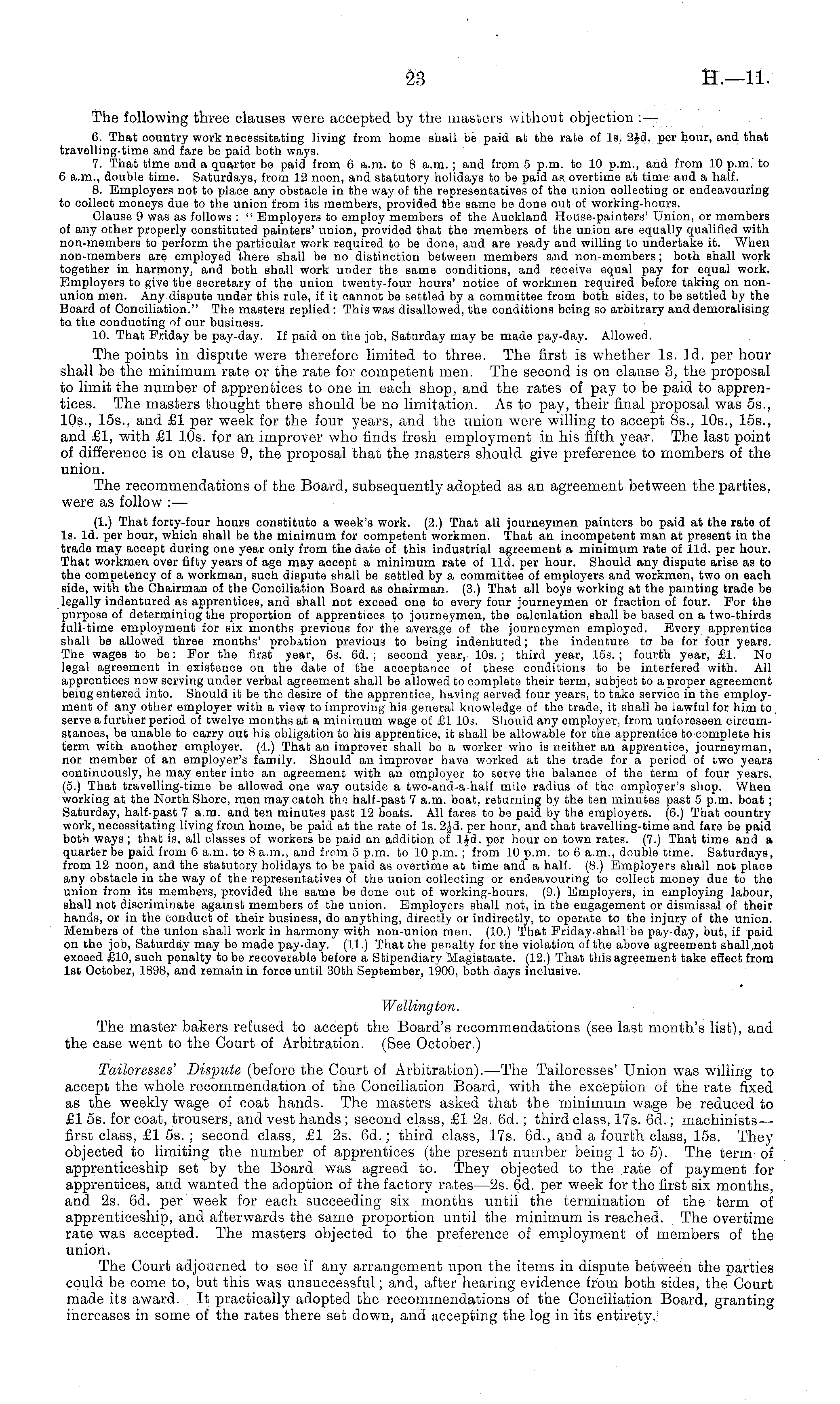 The following three clauses were accepted by the masters without objection : — 6. That country work necessitating living from home shall be paid at the rate of Iβ. 2Jd. per hour, and that travelling-time and fare be paid both ways. 7. That time and a quarter be paid from 6 a.m. to 8 a.m. ; and from 5 p.m. to 10 p.m., and from 10 p.m. to 6 a.m., double time. Saturdays, from 12 noon, and statutory holidays to be paid as overtime at time and a half. 8. Employers not to place any obstacle in the way of the representatives of the union collecting or endeavouring to collect moneys due to the union from its members, provided the same be done out of working-hours. Clause 9 was as follows : " Employers to employ members of the Auckland House-painters' Union, or members of any other properly constituted painters' union, provided that the members of the union are equally qualified with non-members to perform the particular work required to be done, and are ready and willing to undertake it. When non-members are employed there shall be no distinction between members and non-members; both shall work together in harmony, and both shall work under the same conditions, and receive equal pay for equal work. Employers to give the secretary of the union twenty-four hours' notice of workmen required before taking on nonunion men. Any dispute under this rule, if it cannot be settled by a committee from both sides, to be settled by the Board of Conciliation." The masters replied : This was disallowed, the conditions being so arbitrary and demoralising to the conducting of our business. 10. That Friday be pay-day. If paid on the job, Saturday may be made pay-day. Allowed. The points in dispute were therefore limited to three. The first is whether Is. Id. per hour shall be the minimum rate or the rate for competent men. The second is on clause 3, the proposal to limit the number of apprentices to one in each shop, and the rates of pay to be paid to apprentices. The masters thought there should be no limitation. As to pay, their final proposal was 55., 10s., 155., and £1 per week for the four years, and the union were willing to accept Bs., 10s., 155., and £1, with £1 10s. for an improver who finds fresh employment in his fifth year. The last point of difference is on clause 9, the proposal that the masters should give preference to members of the union. The recommendations of the Board, subsequently adopted as an agreement between the parties, were as follow :— (1.) That forty-four hours constitute a week's work. (2.) That all journeymen painters be paid at the rate of Is. Id. per hour, which shall be the minimum for competent workmen. That an incompetent man at present in the trade may accept during one year only from the date of this industrial agreement a minimum rate of lid. per hour. That workmen over fifty years of age may accept a minimum rate of lid. per hour. Should any dispute arise as to the competency of a workman, such dispute shall be settled by a committee of employers and workmen, two on each side, with the Chairman of the Conciliation Board as chairman. (3.) That all boys working at the painting trade be legally indentured as apprentices, and shall not exceed one to every four journeymen or fraction of four. For the purpose of determining the proportion of apprentices to journeymen, the calculation shall be based on a two-thirds full-time employment for six months previous for the average of the journeymen employed. Every apprentice shall be allowed three months' probation previous to being indentured; the indenture to be for four years. The wages to be: For the first year, 6s. 6d. ; second year, 10s. ; third year, 15s. ; fourth year, £1. No legal agreement in existence on the date of the acceptance of these conditions to be interfered with. All apprentices now serving under verbal agreement shall be allowed to complete their term, subject to a proper agreement being entered into. Should it be the desire of the apprentice, having served four years, to take service in the employment of any other employer with a view to improving his general knowledge of the trade, it shall be lawful for him to serve a further period of twelve months at a minimum wage of £1 10s. Should any employer, from unforeseen circumstances, be unable to carry out his obligation to his apprentice, it shall be allowable for the apprentice to complete his term with another employer. (4.) That an improver shall be a worker who is neither an apprentice, journeyman, nor member of an employer's family. Should an improver have worked at the trade for a period of two years continuously, he may enter into an agreement with an employer to serve the balance of the term of four years. (5.) That travelling-time be allowed one way outside a two-and-a-half mile radius of the employer's shop. When working at the North Shore, men may catch the half-past 7 a.m. boat, returning by the ten minutes past 5 p.m. boat ; Saturday, half-past 7 a.m. and ten minutes past 12 boats. All fares to be paid by the employers. (6.) That country work, necessitating living from home, be paid at the rate of Is. 2Jd. per hour, and that travelling-time and fare be paid both ways ; that is, all classes of workers be paid an addition of per hour on town rates. (7.) That time and a quarter be paid from 6 a.m. to 8 a.m., and from 5 p.m. to 10 p.m. ; from 10 p.m. to 6 a.m., double time. Saturdays, from 12 noon, and the statutory holidays to be paid as overtime at time and a half. (8.) Employers shall not place any obstacle in the way of the representatives of the union collecting or endeavouring to collect money due to the union from its members, provided the same be done out of working-hours. (9.) Employers, in employing labour, shall not discriminate against members of the union. Employers shall not, in the engagement or dismissal of their hands, or in the conduct of their business, do anything, directly or indirectly, to operate to the injury of the union. 
