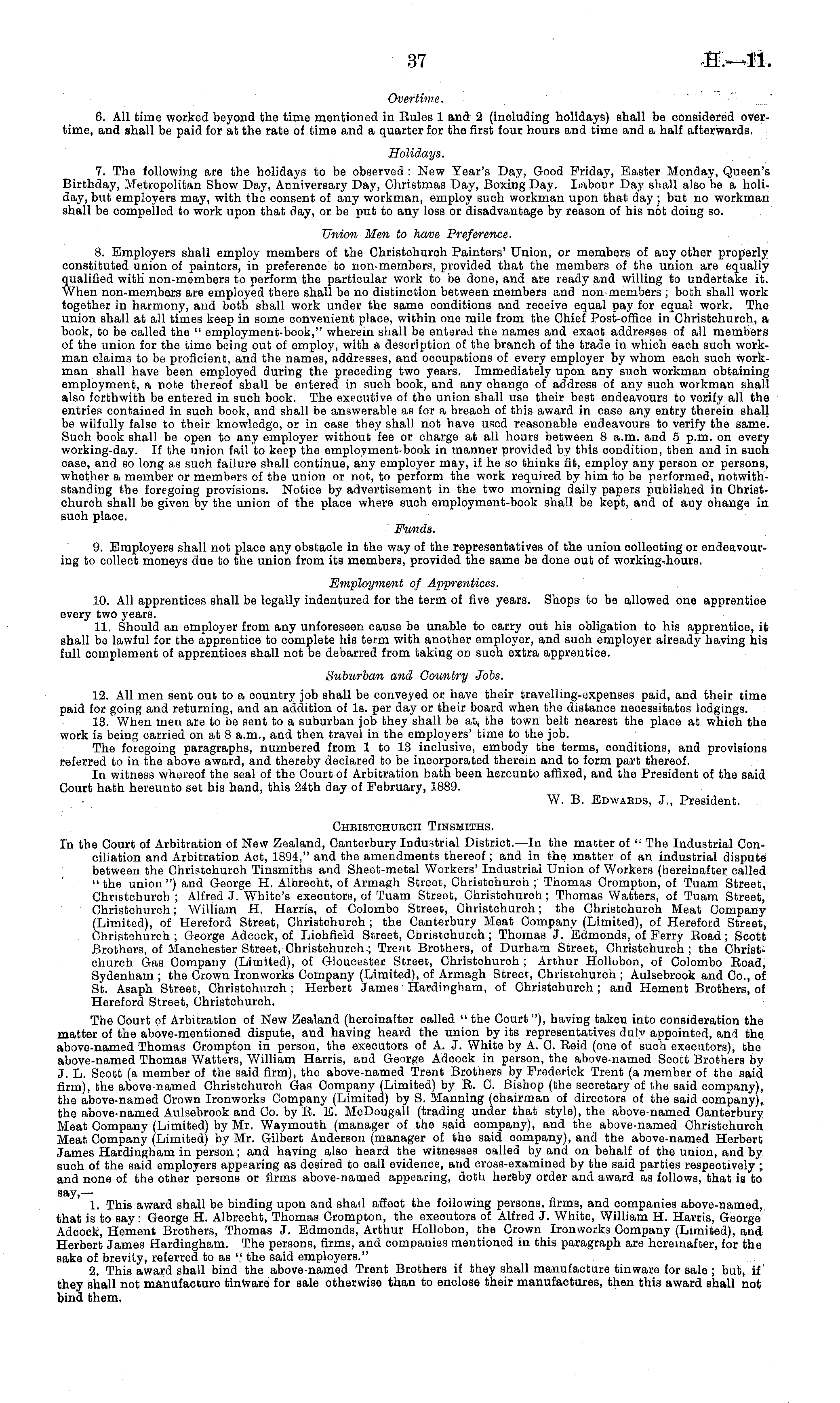 Overtime. 6. All time worked beyond the time mentioned in Rules 1 and' 2 (including holidays) shall be considered overtime, and shall be paid for at the rate of time and a quarter for the first four hours and time and a half afterwards. Holidays. 7. The following are the holidays to be observed : New Year's Day, Good Friday, Ea,ster Monday, Queen's Birthday, Metropolitan Show Day, Anniversary Day, Christmas Day, Boxing Day. Labour Day shall also be a holiday, but employers may, with the consent of any workman, employ such workman upon that day ; but no workman shall be compelled to work upon that day, or be put to any loss or disadvantage by reason of his not doing so. Union Men to have Preference. 8. Employers shall employ members of the Ohristchurch Painters' Union, or members of any other properly constituted union of painters, in preference to non-members, provided that the members of the union are equally qualified with non-members to perform the particular work to be done, and are ready and willing to undertake it. When non-members are employed there shall be no distinction between members and non-members ; both shall work together in harmony, and both shall work under the same conditions and receive equal pay for equal work. The union shall at all times keep in some convenient place, within one mile from the Chief Post-office in Christchurch, a book, to be called the " employment-book," wherein shall be entered the names and exact addresses of all members of the union for the time being out of employ, with a description of the branch of the trade in which each such workman claims to bo proficient, and the names, addresses, and occupations of every employer by whom each such workman shall have been employed during the preceding two years. Immediately upon any such workman obtaining employment, a note thereof shall be entered in such book, and any change of address of any such workman shall also forthwith be entered in such book. The executive of the union shall use their best endeavours to verify all the entries contained in such book, and shall be answerable as for a breach of this award in case any entry therein shall be wilfully false to their knowledge, or in case they shall not have used reasonable endeavours to verify the same. Such book shall be open to any employer without fee or charge at all hours between 8 a.m. and 5 p.m. on every working-day. If the union fail to keep the employment-book in manner provided by this condition, then and in such case, and so long as such failure shall continue, any employer may, if he so thinks fit, employ any person or persons, whether a member or members of the union or not, to perform the work required by him to be performed, notwithstanding the foregoing provisions. Notice by advertisement in the two morning daily papers published in Christchurch shall be given by the union of the place where such employment-book shall be kept, and of any change in such place. Funds. 9. Employers shall not place any obstacle in the way of the representatives of the union collecting or endeavouring to collect moneys due to the union from its members, provided the same be done out of working-hours. Employment of Apprentices. 10. All apprentices shall be legally indentured for the term of five years. Shops to be allowed one apprentice every two years. 11. Should an employer from any unforeseen cause be unable to carry out his obligation to his apprentice, it shall be lawful for the apprentice to complete his term with another employer, and such employer already having his full complement of apprentices shall not be debarred from taking on such extra apprentice. Suburban and Country Jobs. 12. All men sent out to a country job shall be conveyed or have their travelling-expenses paid, and their time paid for going and returning, and an addition of Is. per day or their board when the distance necessitates lodgings. 13. When men are to be sent to a suburban job they shall be at. the town belt nearest the place at which the work is being carried on at 8 a.m., and then travel in the employers' time to the job. The foregoing paragraphs, numbered from 1 to 13 inclusive, embody the terms, conditions, and provisions referred to in the aboTe award, and thereby declared to be incorporated therein and to form part thereof. In witness whereof the seal of the Court of Arbitration bath been hereunto affixed, and the President of the said Court hath hereunto set his hand, this 24th day of February, 1889. W. B. Edwabds, J., President. Chbistchuboh Tinsmiths. In the Court of Arbitration of New Zealand, Canterbury Industrial District.—ln the matter of " The Industrial Conciliation and Arbitration Act, 1894," and the amendments thereof; and in the matter of an industrial dispute between the Christchurch Tinsmiths and Sheet-metal Workers' Industrial Union of Workers (hereinafter called "the union") and George H. Albreoht, of Armagh Street-, Chriatchurch ; Thomas Crompton, of Tuam Street, Christehurch ; Alfred J. White's executors, of Tuam Street, Christchurch ; Thomas Watters, of Tuam Street, Christcburoh; William H. Harris, of Colombo Street, Christchuroh; the Christchurch Meat Company (Limited), of Hereford Street, Christchurch ; the Canterbury Meat Company (Limited), of Hereford Street, Christohurch ; George Adcock, of Lichfield Street, Christchurch ; Thomas J. Edmonds, of Ferry Road; Soott Brothers, of Manchester Street, Christchurch.; Trent Brothers, of Durham Street, Christchurch ; the Christchurch Gas Company (Limited), of Gloucester Street, Christohurch ; Arthur Hollobon, of Colombo Road, Sydenham ; the Grown Ironworks Company (Limited), of Armagh Street, Ohristchuroh ; Aulsebrook and Co., of St. Asaph Street, Christchurch; Herbert James ■ Hardingham, of Christchurch ; and Hement Brothers, of Hereford Street, Christchurch. The Court of Arbitration of New Zealand (hereinafter called " the Court"), having taken into consideration the matter of the above-mentioned dispu