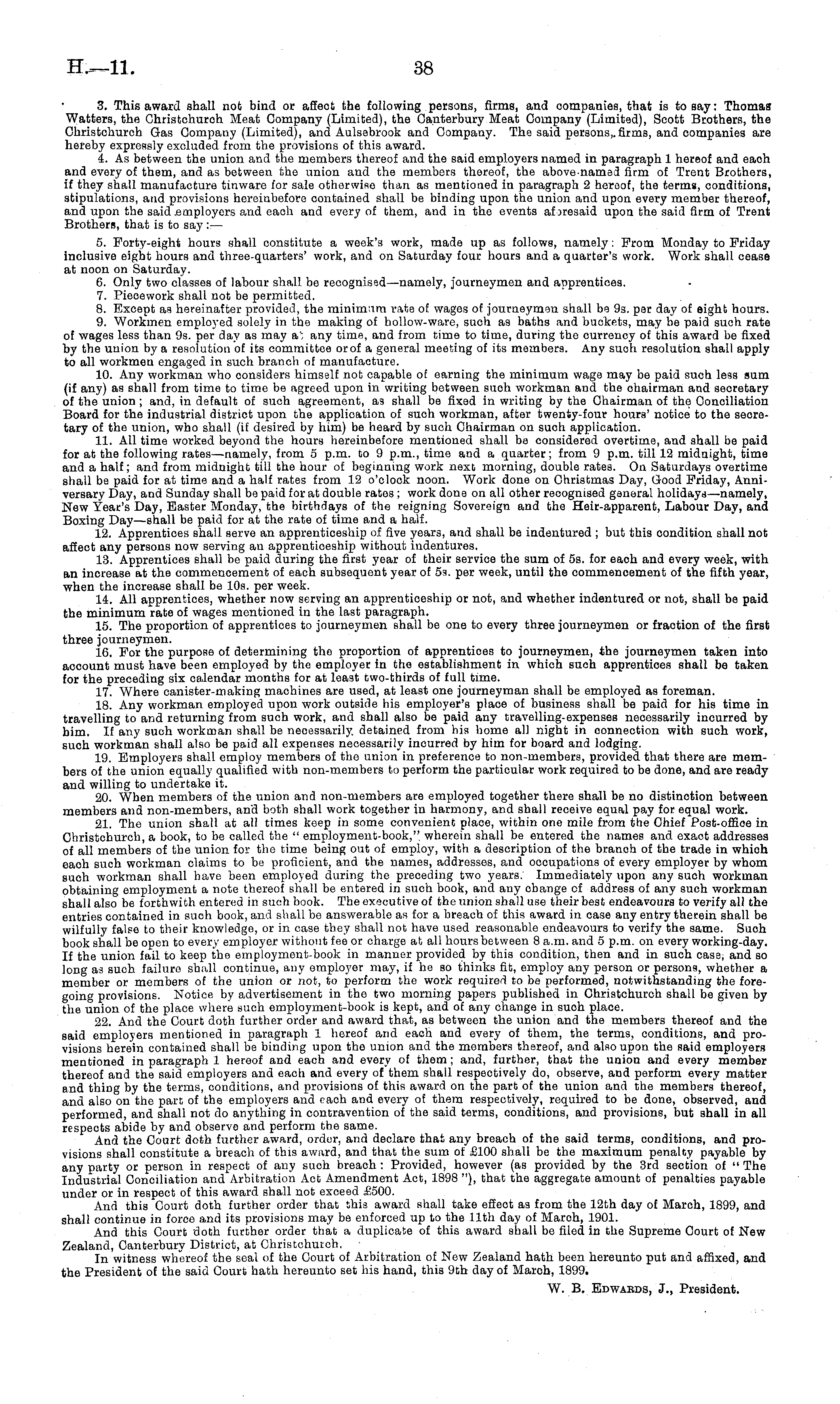 3. This award shall not bind or affect the following persons, firms, and companies, that is to say: Thomas Watters, the Christchurch Meat Company (Limited), the Canterbury Meat Company (Limited), Scott Brothers, the Christchurch Gas Company (Limited), and Aulsabrook and Company. The said persons,.firms, and companies are hereby expressly excluded from the provisions of this award. 4. As between the union and the members thereof and the said employers named in paragraph 1 hereof and each and every of them, and as between the union and the members thereof, the above-named firm of Trent Brothers, if they shall manufacture tinware for sale otherwise than as mentioned in paragraph 2 hereof, the terms, conditions, stipulations, and provisions hereinbefore contained shall be binding upon the union and upon every member thereof, and upon the said employers and eaoh and every of them, and in the events aforesaid upon the said firm of Trent Brothers, that is to say : — 5. Forty-eight hours shall constitute a week's work, made up as follows, namely: Prom Monday to Friday inclusive eight hours and three-quarters' work, and on Saturday four hours and a quarter's work. Work shall cease at noon on Saturday. 6. Only two classes of labour shall be recognised—namely, journeymen and apprentices. 7. Piecework shajl not be permitted. 8. Except as hereinafter provided, the minimum rate o£ wages of journeymen shall be 9s. par day of eight hours. 9. Workmen employed solely in the making of hollow-ware, such as baths and buckets, may be paid such rate of wages less than 9s. per day as may a , ; any time, and from time to time, during the currency of this award be fixed by the union by a resolution of its committee orof a general meeting of its members. Any such resolution shall apply to all workmen engaged in such branch of manufacture. 10. Any workman who considers himself not capable of earning the minimum wage may be paid such less sum (if any) as shall from time to time be agreed upon in writing between such workman and the chairman and secretary of the union ; and, in default of such agreement, as shall be fixed in writing by the Chairman of the Conciliation Board for the industrial district upon the application of such workman, after twenty-four hours' notice to the secretary of the union, who shall (if desired by him) be heard by such Chairman on such application. 11. All time worked beyond the hours hereinbefore mentioned shall be considered overtime, and shall be paid for at the following rates —namely, from 5 p.m. to 9 p.m., time and a quarter; from 9 p.m. till 12 midnight, time and a half; and from midnight till the hour of beginning work next morning, double rates. On Saturdays overtime shall be paid for at time and a half rates from 12 o'clock noon. Work done on Christmas Day, G-ood Friday, Anniversary Day, and Sunday shall be paid for at double rates ; work done on all other recognised general holidays—namely, New Year's Day, Easter Monday, the birthdays of the reigning Sovereign and the Heir-apparent, Labour Day, and Boxing Day—shall be paid for at the rate of time and a half. 12. Apprentices shall serve an apprenticeship of five years, and shall be indentured ; but this condition shall not affect any persons now serving an apprenticeship without indentures. 13. Apprentices shall be paid during the first year of their service the sum of ss. for each and every week, with an increase at the commencement of each subsequent year of ss. per week, until the commencement of the fifth year, when the increase shall be 10s. per week. 14. All apprentices, whether now serving an apprenticeship or not, and whether indentured or not, shall be paid the minimum rate of wages mentioned in the last paragraph. 15. The proportion of apprentices to journeymen shall be one to every three journeymen or fraction of the first three journeymen. 16. For the purpose of determining the proportion of apprentices to journeymen, the journeymen taken into account must have been employed by the employer in the establishment in which such apprentices shall be taken for the preceding six calendar months for at least two-thirds of full time. 17. Where canister-making machines are used, at least one journeyman shall be employed as foreman. 18. Any workman employed upon work outside his employer's place of business shall be paid for his time in travelling to and returning from such work, and shall also be paid any travelling-expenses necessarily incurred by him. If any such workman shall be necessarily detained from his home all night in connection with such work, such workman shall also be pa,id all expenses necessarily incurred by him for board and lodging. 19. Employers shall employ members of the union in preference to non-members, provided that there are members of the union equally qualified with non-members to perform the particular work required to be done, and are ready and willing to undertake it. 20. When members of the union and non-members are employed together there shall be no distinction between members and non-members, and both shall work together in harmony, and shall receive equal pay for equal work. 21. The union shall at all times keep in some convenient place, within one mile from the Chief Post-office in Ohristchurch, a book, to be called the " employment-book," wherein shall be entered the names and exact addresses of all members of the union for the time being out of employ, with a description of the branch of the trade in whioh eaoh such workman claims to be proficient, and the names, addresses, and occupations of every employer by whom such workman shall have been employed during the preceding two years. Immediately upon any such workman obtaining employment a note thereof shall be entered in such book, and any change of address of any such workman shall also be forthwith entered in such book. The executive of the union shall use their best endeavours to verify all the entries contained in such boo