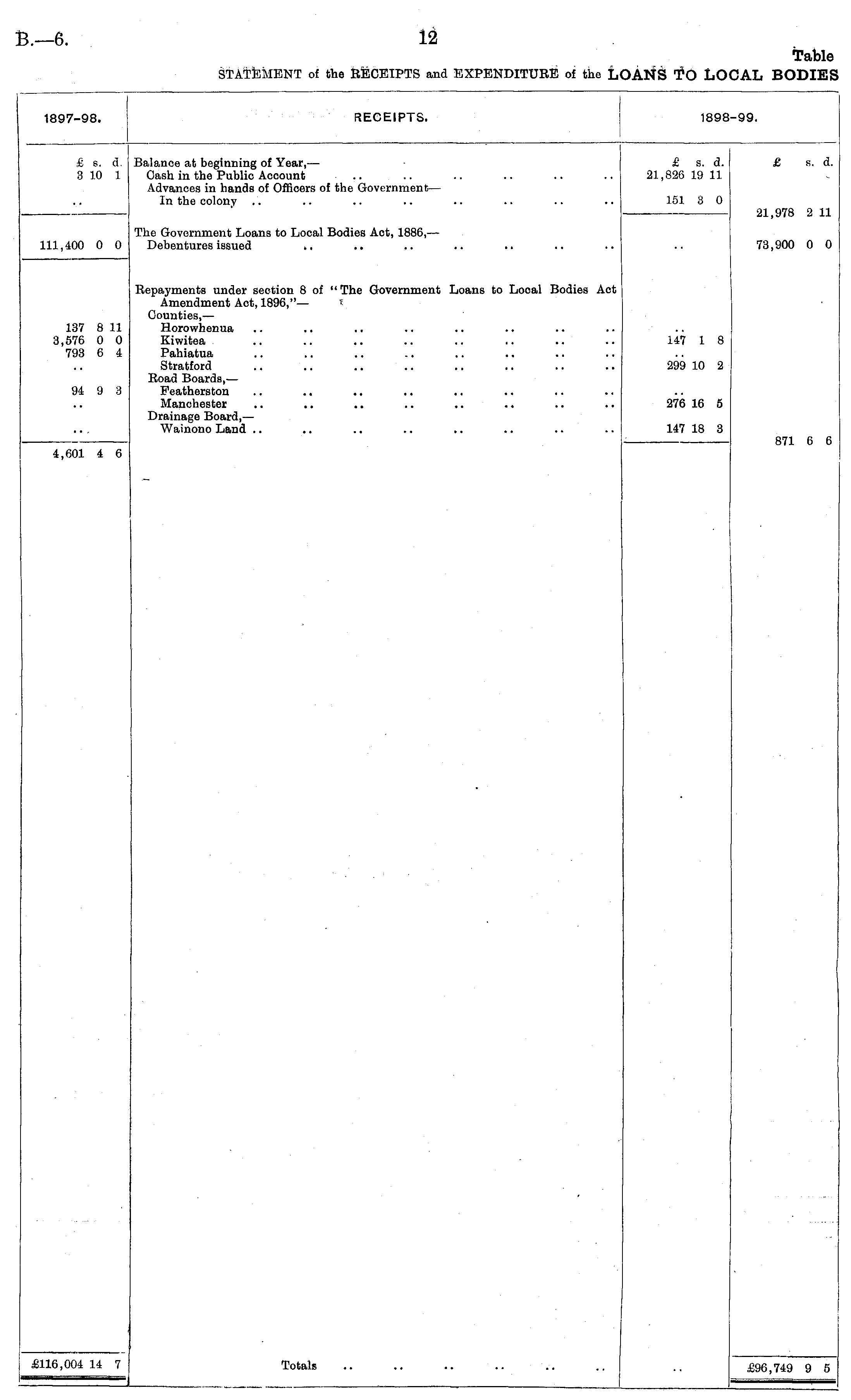 1897-98. RECEIPTS. 1898-99. £ s. d. 3 10 1 Balance at beginning of Year, — Cash in the Public Account Advances in hands of Officers of the Government— In the colony £ s. d. 21,826 19 11 £ s. d. 151 3 0 21,978 2 11 111,400 0 0 The Government Loans to Local Bodies Act, 1886, — Debentures issued .. 73,900 0 0 137 8 11 3,576 0 0 793 6 4 Repayments under section 8 of "The Government Loans to Local Bodies Act Amendment Act, 1896," — « Counties, — Horowhenua Kiwitea Pahiatua Stratford Road Boards, — Featherston Manchester Drainage Board, — Wainono Land 147 1 8 299 10 2 94 9 3 276 16 5 147 18 3 4,601 4 6 871 6 6 £116,004 14 7 Totals £96,749 9 5
