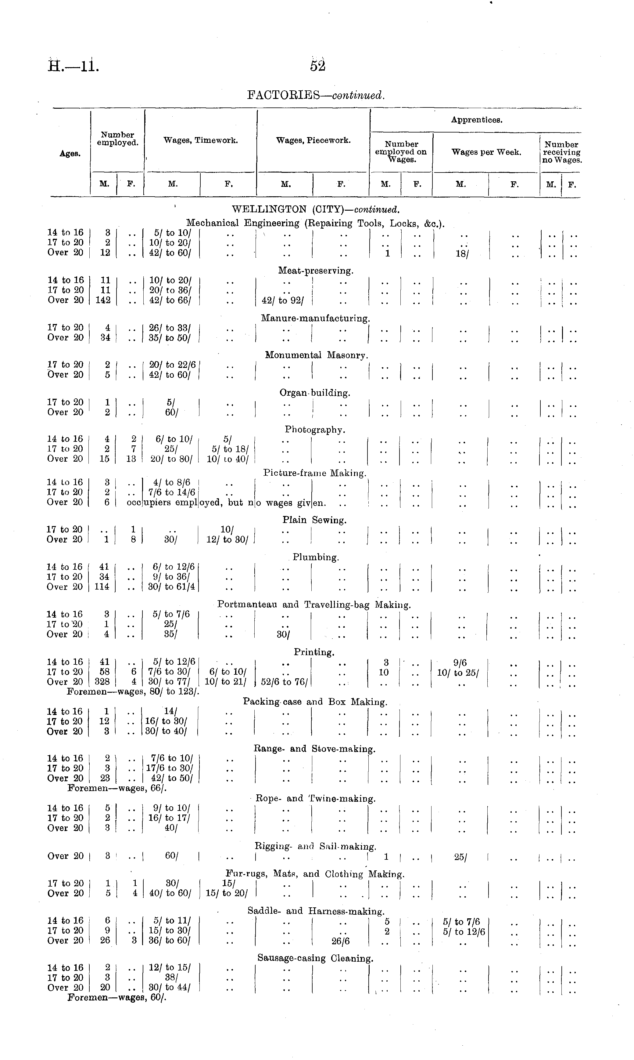 ippreni ;ioes. Number employed. Wages, Timework. Wages, Piecework. Wages per Week. Number receiving no Wages. Ages. Number employed on Wages. M. P. M. F. M. F. M. F. M. P. M. P. WELLINGTON (CITY)— continued. Mechanical Engineering (Repairing Tools, Locks, &c). 14 to 16 I 3 .. 5/to 10/ .. i .. .. .. .. .. I 17 to 20 I 2 .. 10/ to 20/ Over 20 I 12 .. 42/ to 60/ .. | .. .. 1 .. 18/ Meat-preserving. 14 to 16 11 .. 10/ to 20/ .. .. I 1Y to 20 11 .. 20/ to 36/ Over 20 142 .. 42/ to 66/ .. 42/ to 92/ i Manure-manufacturing. 17 to 20 4 j .. 26/ to 33/ Over 20 84 '.. 85/ to 50/ Monumental Masonry. 17 to 20 2 1 .. 20/ to 22/6 I Over 20 5 | .. 42/ to 60/ | Organ building. 17 to 20 1 5/ I .. I .. i .. .. I .. Over 20 2 60/1 Photography. 14 to 16 4 2 6/ to 10/ 5/ I .. .. .. .. .. | 17 to 20 2 7 25/ 5/ to 18/ Over 20 15 13 20/ to 80/ 10/ u> 40/ Picture-fraoie Making. 14 to 16 3 j .. 4/ to 8/6 ! .. .. .. I .. 17 to 20 2 j .. 7/6 to 14/6, .. .. .. .. .. Over 20 6 j occupiers employed, but no wages given. .. .. Plain Sewing. 17 to 20 .. 1 .. 10/ I Over 20 1 8 30/ 12/ to 30/ I i :■: I:: Plumbing. 14 to 16 41 .. 6/ to 12/6 .. .. [ 17 to 20 34 .. 9/ to 36/ Over 20 114 .. 30/ to 61/4 Portmanteau and Travelling-bag Making. 14 to 1C 3 .. 5/ to 7/6 17 to 20 1 25/ Over 20 4 35/ .. 30/ Printing. 14 to 16 1 41 .. 5/ to 12/6 .. .. .. 8 1'.. 9/6 | 17 to 20 j 58 6 7/6 to 30/ 6/ to 10/ .. .. 10 .. 10/ to 25/ Over 20 I 328 4 30/to 77/ 10/to 21/ 52/6 to 76/ .. .. .. Foremen —wages, 80/ to 123/. Packing case and Box Making. 14 to 16 1 .. 14/ .. I 17 to 20 12 .. 16/ to 30/ Over 20 3 .. 30/ to 40/ Range- and Stove-making. 14 to 16 2 7/6 to 10/ .. .. I .. .. .. .. j 17 to 20 3 .. 17/6 to 30/ Over 20 23 .. 42/ to 50/ Foremen—wages, 66/. i :; •• Rope- and Twine-making. 14 to 16 5 .. 9/ to 10/ .. .. .. .. I .. 17 to 20 2 .. 16/ to 17/ Over 20 3 40/ Rigging- and Sail making. Over 20 I 3 .. 1 60/ | .. | .. .. | 1 | .. | 25/ I Fur-rugs, Mats, and Clothing Making. 17 to 20 j 1 1 30/ 15/ .. . Over 20 : 5 4 40/ to 60/ 15/ to 20/ .. Saddle- and Harness-making. 14 to 16 ' 6 .. 5/ to 11/ .. .. .. 5 1.. 5/to 7/6 17 to 20 ! 9 .. 15/ to 30/ .. .. .. 2 ; .. 5/ to 12/6 Over 20 ! 26 3 36/ to 60/ .. .. 26/6 .. \ .. Sausage-casing Cleaning. 14 to 16 2 .. 12/to 15/ .. .. .. .. 17 to 20 8 .. 38/ Over 20 20 .. 30/ to 44/ .. .. .. . . Foremen —wages, 60/. !