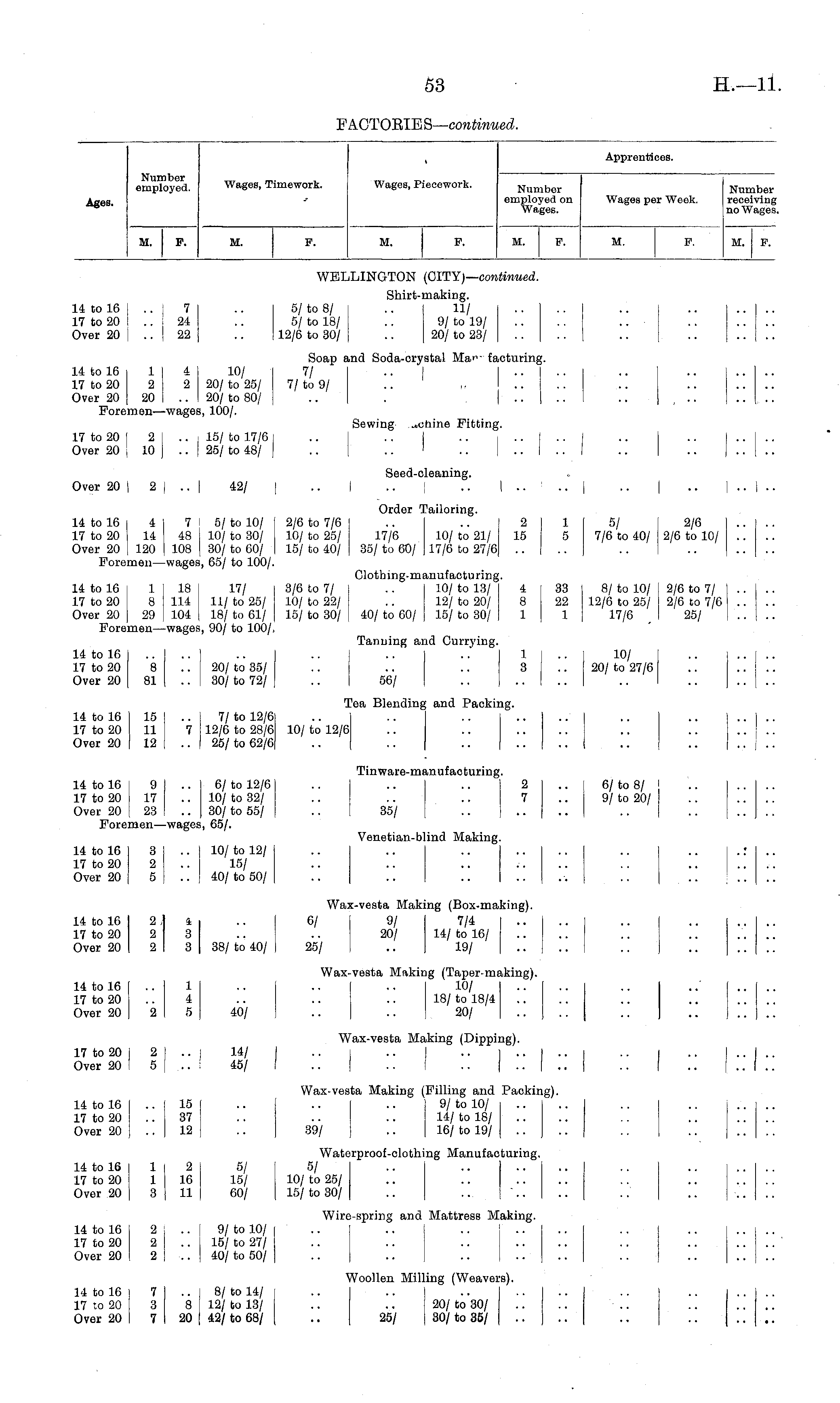Lpprem ices. Number employed. Wages, Timework. Wages, Piecework. Wages per Week. Number receiving no Wages Ages. Number employed on Wages. M. F. M. P. M. F. M. F. M. F. M. F. WELLINGTON (CITY)— continued. Shirt-making. 14 to 16 .. ! 7 .. 3/ to 8/ I .. 11/ .. .. .. 17 to 20 .. 24 .. 5/ to 18/ .. 9/ to 19/ .. .. .. .. .... Over 20 I .. I 22 .. 12/6 to 30/ .. 20/ to 23/ .. .. .. .. .... Soap and Soda-oryatal Ma"- facturing. 14 to 16 1 4 10/ 7/ [ I .. .. .. .. .... 17 to 20 2 2 20/ to 25/ 7/ to 9/ .. ' .. .. .. .. .... Over 20 20 .. 20/ to 80/ .. . , |- .. .. .. ... .... Foremen—wages, 100/. Sewing ...chine Fitting. 17 to 20 2 .. 15/ to 17/6 J .. .. .. .. .. .. Over 20 10 .. 25/ to 48/ I .. .. .. | .. .. .. .. .... Seed-cleaning. Over 20 I 2 I .. I 42/ | .. I .. | .. I .. I .. | .. | .. | ., | .. Order Tailoring. 14 to 16 4 7 1 5/ to 10/ 2/6 to 7/6 .. .. 2 1 5/ 2/6 .... 17 to 20 14 48 10/ to 30/ 10/ to 25/ 17/6 10/ to 21/ 15 5 7/6 to 40/ 2/6 to 10/ .. Over 20 120 108 30/to 60/ 15/to 40/ 35/to 60/ 17/6 to 27/6 .. .. .. .. .. .. Foremen—wages, 65/ to 100/. Cloth ing-manufactu ring. 14 to 16 1 18 17/ 3/6 to 7/ .. | 10/ to 13/ 4 33 8/ to 10/ 2/6 to 7/ .. I .. 17 to 20 8 114 11/ to 25/ 10/ to 22/ .. 12/ to 20/ 8 22 12/6 to 25/ 2/6 to 7/6 .. Over 20 29 104 18/ to 61/ 15/ to 30/ 40/ to 60/ 15/ to 30/ 1 1 17/6 25/ .. Foremen —wages, 90/ to 100/, Tanning and Currying. 14 to 16 .... .. .. .. .. 1 .. ] 10/ .. .. .. 17 to 20 8 .. 20/ to 35/ .. .. .. 3 .. 20/ to 27/6 Over 20 81 .. 30/ to 72/ .. 56/ .. .. .. .. .. .. .. Tea Blending and Packing. 14 to 16 15 .. 7/ to 12/6 .. .. .. .. .. .. .. .. I .. 17 to 20 11 7 12/6 to 28/6 10/ to 12/6 .. .. .. .. .. .. .. .. Over 20 12 .. 25/ to 62/6 .. .. .. .. .. .. .. ... | . . Tinware-manufaoturing. 14 to 16 9 .. 6/ to 12/6 .. .. .. 2 .. I 6/'"tp 8/ | .. .... 17 to 20 17 .. 10/ to 32/ .. .. .. 7 .. 9/to 20/ .. .... Over 20 23 .. 30/ to 55/ .. I 35/ .. .. .. .. Foremen —wages, 65/. Venetian-blind Making. 14 to 16 3 .. 10/ to 12/ .. .. .. .. .. .. .. .: .. 17 to 20 2 15/ .. .. .. .. .. .. .. .. .. Over 20 5 .. 40/to 50/ .. .. .. .. .. .. .. .. .. Wax-vesta Making (Box-making). 14 to 16 2 , 4 .. 6/ 9/ 7/4 .. .. .. 17 to 20 2 3 .. .. 20/ 14/ to 16/ .. .. .. .. .'. . Over 20 2 3 38/ to 40/ 25/ .. 19/ .... Wax-vesta Making (Taper-making). 14 to 16 .. 1 .. .. .. 10/ .. .. .. .." .. .. 17 to 20 4 .. .. .. 18/ to 18/4 .. .. .. Over 20 2 5 40/ .. .. 20/ .. .. .. Wax-vesta Making (Dipping). 17 to 20 2 .. I 14/ I .. .. .. ) .. .. I .. I .. .. I .. Over 20 5 .. I 45/ ! .. .. .. .. .. | .. | .. .. I .. Wax-vesta Making (Filling and Packing). 14 to 16 .. 15 .. .. .. 9/ to 10/ .. .. .. 17 to 20 .. 37 .. .. .. 14/ to 18/ .. .. .. Over 20 .. 12 .. 39/ .. 16/ to 19/ .. .. .. Waterproof-clothing Manufacturing. 14 to 16 1 2 5/ 5/ .. .. .. .. .. 17 to 20 1 16 15/ 10/ to 25/ .. .. .. .. .. Over 20 3 11 60/ 15/ to 30/ .. .. ".. .. .. .. .... Wire-spring and Mattress Making. 14 to 16 2 I .. i 9/ to 10/ .. .. .. .. .. .. .. .... 17 to 20 2 .. 15/ to 27/ .. .. .. .. .. .. .. .... Over 20 2 .. 40/ to 50/ .. .. .. .. .. .. Woollen Milling (Weavers). 14 to 16 7 .. 8/ to 14/ .. .. I .. .. .. .. 17 to 20 3 8 12/to 13/ .. .. | 20/ to 30/ .. .. .. .. .. .. Over 20 7 20 42/ to 68/ .. 25/ | 30/ to 36/ .. .. ..