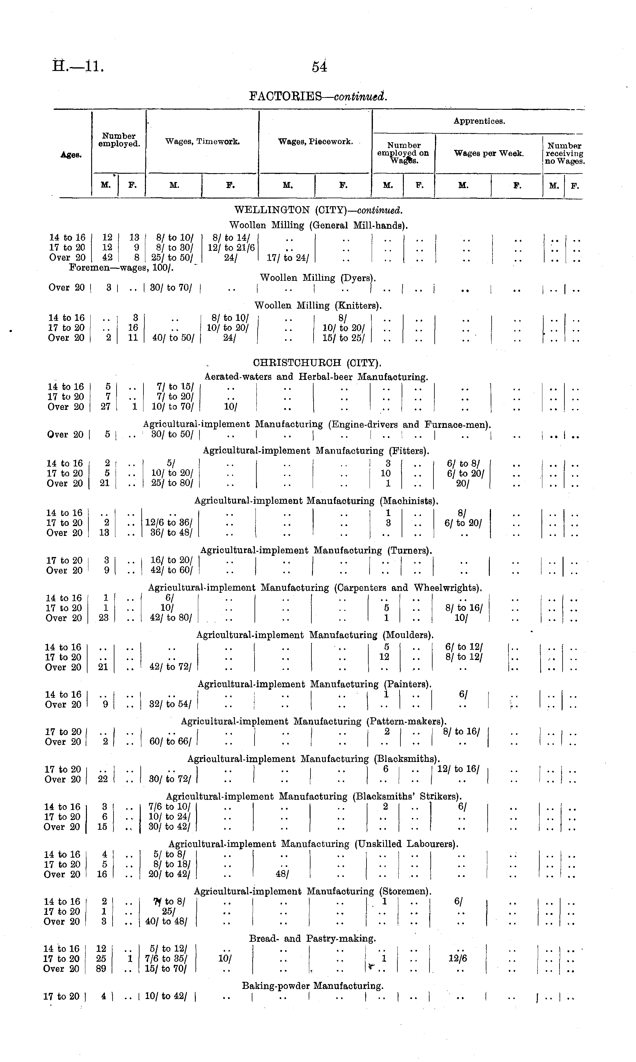 Lpprem ;ices. Number employed. Wages, Timowork. Wages, Piecework. Wages per Week. Number receiving noWages, Ages. Number employed on Waglte. M. F. M. F. M. F. M. F. M. F. M. F. WELLINGTON (CITY)— continued. Woollen Milling (General Mill-hands). 14 to 16 12 13 8/ to 10/ 8/ to 14/ 17 to 20 12 9 8/ to 30/ 12/ to 21/6 Over 20 42 I 8 25/ to 50/ 24/ 17/ to 24/ Foremen—-wages, 100/. Woollen Milling (Dyers). Over 20 1 8 | .. | 30/to 70/ | .. | .. | .. | .. | .. ] .. | I .. I .. Woollen Milling (Knitters). 14 to 16 .. i 3 .. 8/ to 10/ .. 8/ 17 to 20 .. 16 .. 10/ to 20/ .. 10/ to 20/ Over 20 2 11 40/ to 50/ 24/ .. 15/ to 25/ [::l;: CHBISTCHURCH (CITY). Aerated-waters and Herbal-beer Manufaoturing. 14 to 16 5 .. 7/ to 13/ 17 to 20 7 .. 7/ to 20/ Over 20 27 1 10/ to 70/ 10/ Agricultural-implement Manufacturing (Engine-drivers and Furnaoe-men). Over 20 I 5 | .. 30/ to 50/ | ' .. I .. | .. | .. .. j .. | i .. i .. Agricultural-implement Manufacturing (Fitters). 14 to 16 2 [ .. 5/ .. .. .. 13 .. 6/ to 8/ 17 to 20 5 i .. 10/ to 20/ .. .. .. 10 .. 6/ to 20/ Over 20 21 !.. 25/ to 80/ .. .. .. 1 .. 20/ Agricultural-implement Manufacturing (Machinists). 14 to 16 .... .. .. .. .. 1 .. 8/ 17 to 20 2 .. 12/6 to 36/ .. .. .. 3 .. 6/ to 20/ Over 20 13 .. 36/ to 48/ Agricultural-implement Manufaoturing (Turners). 17 to 20 : 3 .. 16/to 20/ .. I Over 20 ! 9 .. 42/ to 60/ .. | Agricultural-implement Manufacturing (Carpenters and Wheelwrights). 14 to 16 1 6/ .. .. .. .. .. I 17 to 20 1 .. 10/ .. .. .. 5 .. 8/ to 16/ Over 20 23 .. 42/ to 80/ .. .. .. 1 .. 10/ Agricultural-implement Manufacturing (Moulders). 14 to 16 .... .. .. .. .. 5 .. 6/ to 12/ 17 to 20 .... .. .. .. .. 12 .. 8/ to 12/ Over 20 21 .. 42/ to 72/ Agricultural-implement Manufaoturing (Painters). 14 to 16 I .... .. .. .. .. 1 .. 6/ Over 20 I 9 .. 32/ to 54/ .. \ Agricultural-implement Manufacturing (Pattern-makers). 17 to 20 .. I .. .. .. .. .. 2 .. 8/ to 16/ Over 20 2 | .. 60/ to 66/ Agricultural-implement Manufacturing (Blaoksmiths). 17 to 20 .. I .. .. I .. .. .. 6 .. 12/ to 16/ I Over 20 22 I .. 30/ to 72/ I .. i.. Agricultural-implement Manufacturing (Blacksmiths' Strikers). 14 to 16 3 .. 7/6 to 10/ .. .. .. 2 .. 6/ 17 to 20 6 .. 10/ to 24/ Over 20 15 .. 30/ to 42/ Agricultural-implement Manufacturing (Unskilled Labourers). 14 to 16 4 .. 5/ to 8/ .. .. .. .. .. .. j 17 to 20 5 .. 8/ to 18/ Over 20 16 .. 20/ to 42/ .. 48/ Agrioultural-implement Manufaoturing (Storemen). 14 to 16 2 .. 7f to 8/ .. .. .. 1 .. 6/ 17 to 20 1 .. 25/ Over 20 3 .. 40/ to 48/ .. .. | Bread- and Pastry.maki«g. 14 to 16 12 .. 5/ to 12/ .. .. I 17 to 20 25 1 7/6 to 35/ 10/ .. .. 1 .. 12/6 Over 20 89 .. 15/ to 70/ .. *".. Baking-powder Manufacturing. 17 to 20 I i I .. I 10/to 42/ I .. I .. I .. I .. I .. I .. I i .. i ..