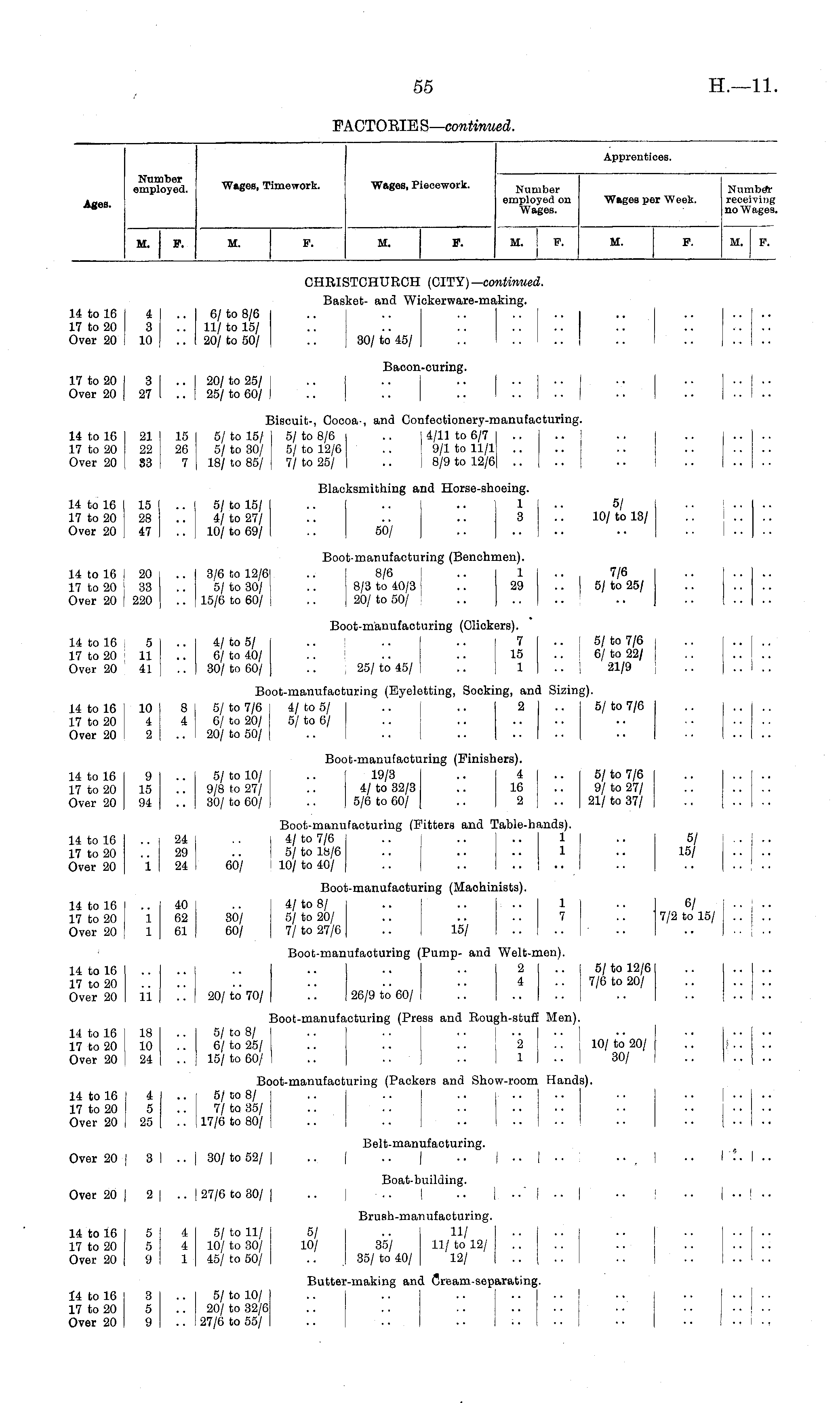 .pprem jices. Number employed. Wages, Timework. Wages, Piecework. Ages. Number employed on Wages. Wages per Week. Numb* receiving no Wages, M. P. M. F. M. F. M. ! F. M. F. M. F. CHRISTCHURCH (CITY) — continued. Basket- and Wickerware-making. 14 to 16 4 .. 6/ to 8/6 .. .. .. .. I .. I .. .. .... 17 to 20 3 .. 11/to 15/ .. .. .. .. .. .. Over 20 10 .. 20/ to 50/ .. 30/ to 45/ .. .. .. ! .. Bacon-curing. 17 to 20 3 I .. 20/ to 25/ .. .. .. .. •• ■• • • .. I .. Over 20 27 I .. 25/ to 60/ .. .. .. .. • • .. •. .. I ., Biscuit-, Cocoa-, and Confectionery-manufacturing. 14 to 16 21 15 5/ to 15/ 5/ to 8/6 • • I i l u to 6 / 7 • • • • • • I 17 to 20 22 26 5/ to 30/ 5/ to 12/6 .. ! 9/1 to 11/1 .. .. .. .. .. .. Over 20 i 33 7 18/ to 85/ 7/ to 25/ | 8/9 to 12/6 .. .. .. I .. .... Blacksmithing and Horse-shoeing. 14 to 16 15 .. 5/to 15/ .. .. .. 1 • • 5/ 17 to 20 28 .. 4/ to 27/ .. .. .. .3 .. 10/ to 13/ .. .. .. Over 20 47 .. 10/ to 69/ .. 50/ .. .. .. .. .. .. .. Boot-manufacturing (Benchmen). 14 to 16 I 20 .. 3/6 to 12/6 .. 8/6 .. 1 7/6 .. .... 17 to 20 i 33 .. 5/ to 30/ .. 8/3 to 40/3 .. 29 .. 5/ to 25/ .. .... Over 20 j 220 .. 15/6 to 60/ .. 20/ to 50/ .. .. .. .. Boot-manufacturing (Oliokers). 14 to 16 5 .. 4/ to 5/ .. ! .. .. I 7 .. ! 5/ to 7/6 17 to 20 11 .. 6/ to 40/ .. .. .. ! 15 .. 6/ to 22/ , Over 20 41 .. 30/to 60/ .. 25/to 45/ .. 1 .. | 21/9 Boot-manufacturing (Eyeletting, Socking, and Sizing). 14 to 16 10 8 5/ to 7/6 I 4/ to 5/ .. | .. 2 .. 5/ to 7/6 17 to 20 4 4 6/ to 20/ 5/ to 6/ .. .. .. .. .. .. .... Over 20 i 2 .. 20/ to 50/ .. .. .. .. • • • • • • .... Boot-manufacturing (Finishers). 14 to 16 9 .. 5/ to 10/ .. 19/3 .. 4 .. 5/ to 7/6 17 to 20 15 .. 9/8 to 27/ .. 4/ to 32/3 .. 16 .. 9/ to 27/ Over 20 94 .. 30/ to 60/ .. 5/6 to 60/ .. 2 .. 21/ to 37/ Boot-manufacturing (Fitters and Table-hands). 14 to 16 .. I 24 .. I 4/ to 7/6 .. | .. .. 1 .. 5/ .. I .. 17 to 20 .. 29 .. |5/ to 18/6 .. .. .. 1 .. 15/ .... Over 20 1 24 60/ 10/ to 40/ .. .. .. .. .. .. .... Boot-manufacturing (Maohinists). 14 to 16 .. 40 .. 4/ to 8/ .. .. .. 1 .. 6/ .. j .. 17 to 20 1 62 30/ 5/ to 20/ .. .. .. 7 .. 7/2 to 15/ Over 20 1 61 60/ 7/ to 27/6 .. 15/ .. .. .. .. ...[.. Boot-manufaoturing (Pump- and Welt-men). 14 to 16 .. •• ■• 2 .. 5/to 12/6 17 to 20 .... .. .. • • • • 4 .. 7/6 to 20/ Over 20 11 .. 20/ to 70/ .. 26/9 to 60/ .. .. .. .. .. .. .. Boot-manufacturing (Press and Rough-stuff Men). 14 to 16 18 5/ to 8/ .. .. .. .. .. .. •. .. .. 17 to 20 10 6/ to 25/ .. .. .. 2 .. 10/ to 20/ .. .. .. Over 20 I 24 .. 15/ to 60/ .. .. .. 1 ■ • 30/ .. .... Boot-manufacturing (Packers and Show-room Hands). 14 to 16 4 5/to 8/ .. .. .. .. •• .. •. J .. .. 17 to 20 5 7/to 35/ .. .. .. .. .. • • • • .... Over 20 25 .. ! 17/6 to 80/ .. .. .. i .. • • .. .. .. .. Belt-manufacturing. Over 20 I 3 I .. I 30/ to 52/ I .. | .. | .. | .. | .. • • . I • • I".. I .. Boat-building. Over 20 I 2 | .. 127/6 to 30/ | .. ) .. I .. | .-." | .. | .. .. | .. I .. Brush-man ufaeturing. 14 to 16 5 4 5/ to 11/ 5/ .. 11/ .. .. j .. I .. ] .. .. 17 to 20 5 4 10/ to 30/ 10/ 35/ 11/ to 12/ .. .. .. .. .. Over 20 9 1 45/ to 50/ .. 35/ to 40/ 12/ .. .. .. | .. | .. .. Butter-making and Cream-separating. 14 to 16 3 .. 5/ to 10/ .. .. .. .. . ■ ! •. .. • • j • • 17 to 20 5 .. 20/ to 32/6 .. .. .. .. .. .. •. • • | •• Over 20 9 .. 27/6 to 55/ .. ... .. I • ■ • • i • ■ ■ • I • • i • >