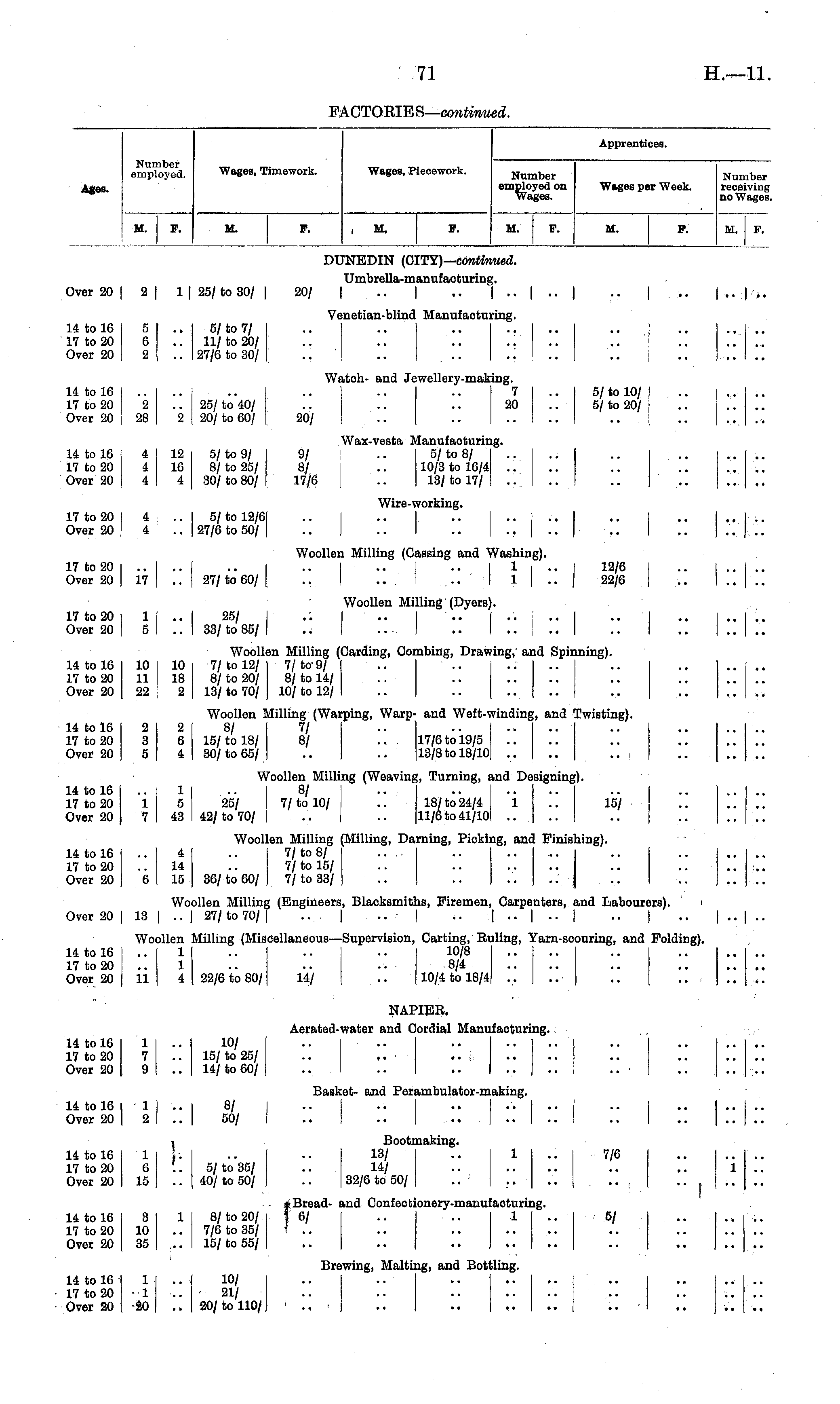 tppreni sices. Number employed. Wages, Timework. Wages, Piecework. Number employed on Wages. Number receiving no Wages Ages. Wages per Week. M. F. H. F. i M. F. M. F. M. F. M. F. DUNEDIN (CITY)— continued. Umbrella-manufacturing. )ver 20 | 2| 1 | 25/to 30/ | 20/ | | | .. | .. | .. | ,. | .. | ». Venetian-blind Manufacturing. L4 to 16 5 .. 5/to7/ .. .. .. .. .. .. ., .. .. L7 to 20 6 .. 11/ to 20/ .. .. .. .. .. .. .. .... Dver 20 2 .. 27/6 to 30/ .. .. .. .. .. .. Watoh- and Jewellery-making. .4 to 16 .. .. .. .. .. 7 .. 5/ to 10/ .7 to 20 2 .. 25/to 40/ .. .. .. 20 .. 5/to 20/ >er 20 28 2 20/ to 60/ 20/ .. .. .. .. .. Wax-vesta Manufacturing. .4 to 16 4 12 5/ to 9/ 9/ | .. 5/ to 8/ .. .. .. .. .... .1 to 20 4 16 8/ to 25/ 8/ .. 10/3 to 16/4 .. .. .. .. .... )ver 20 4 4 30/ to 80/ 17/6 .. 13/ to 17/ .. .. .. Wire-working. .7 to 20 4 .. 5/to 12/6 .. .. .. .. .. .. .. .. .. )ver 20 4 .. 27/6 to 50/ .. .. .. .. .... .. .. .. Woollen Milling (Cassing and Washing). .7 to 20 I .. .. .. .. .. .. I 1 .. I 12/6 )ver 20 I 17 .. 27/ to 60/ .. .. .... 11 1 • - | 22/6 Woollen Milling (Dyers). .7 to20 I 1 .. 25/ .; .. ■>. I .;• j ... .. I )ver 20 | 5 .. 33/to 85/ .. .. .. I .. .. .. I Woollen Milling (Carding, Combing, Drawing, and Spinning). L4tol6 10 10 7/to 12/ 7/to9/ .. .. .. .. .. L7 to 20 11 18 8/ to 20/ 8/ to 14/ .. .. .. .. .. )ver 20 22 2 13/to 70/ 10/to 12/ .. .. .. .. .. .. .. .. Woollen Milling (Warping, Warp- and Weft-winding, and Twisting). .4 to 16 2 2 8/ 7/ .. .. .. .. .. .7 to 20 3 6 15/to 18/ 8/ .. 17/6tol9/5 .. .. .. )ver 20 5 4 30/to 65/ .. .. 13/8tol8/10 .. .. .. Woollen Milling (Weaving, Turning, and Designing). A to 16 1 .. ! 8/ .. .. .. .. .. .7 to 20 15 25/ j 7/to 10/ .. 18/to24/4 1 .. 15/ )ver 20 7 43 42/to 70/ J .. .. Il/6to41/10 .. .. .. Woollen Milling (Milling, Darning, Picking, and Finishing). A to 16 4 .. 7/ to 8/ ... .. .. .. .. .. .... i7 to 20 .. 14 .. 7/ to 15/ .. .. .. .. .. .. .... )ver 20 6 15 36/ to 60/ 7/to 33/ .. .. .. .. .. Woollen Milling (Engineers, Blacksmiths, Firemen, Carpenters, and Labourers). i )ver 20 | 13 | .. | 27/ to 70/ | | .. | .. | .. | .. | .. | .. | .. | .. Woollen Milling (Miscellaneous—Supervision, Carting, Euling, Yarn-scouring, and Folding). .4 to 16 1 .. .. .. 10/8 .. .. .. L7 to 20 .. 1 .. .. .. 8/4 .. .. .. Jver 20 11 4 22/6 to 80/ 14/ .. 10/4 to 18/4 .. .. .. .. .... NAPIEB. Aerated-water and Cordial Manufacturing. 14 tol6 1 .. 10/ .. .. .. .. .. .. .7to20 7 .. 15/to25/ .. .. .. .. .. .. )ver 20 9 .. 14/ to 60/ .. .. .. .. .. .. ■ Basket- and Perambulator-making. .4 to 16 I 1 .. 8/ .. .. .. .. .. .. iver 20 I 2 .. 50/ .. .. .. .. .. .. . Bootmaking. .4 to 16 1 . .. .. 13/ .. 1 .. 7/6 17 to 20 6 .. 5/ to 35/ .. 14/ .. .. .. .. .. 1 .. Dver 20 15 .. 40/ to 50/ .. 32/6 to 50/ .. .. .. ...... .. f .... * Bread- and Confectionery-manufacturing. .4 to 16 3 1 8/ to 20/ I 6/ .. .. 1 .. 5/ .. .... .7 to 20 10 .. 7/6 to 35/ 1 .. .. .. .. .. .. >er 20 35 .. 15/to 55/ .. .. .. .. .. .. Brewing, Malting, and Bottling. A tol6 I 1 .. i 10/ .. .. .. .. .. .. 17 to 20 - 1 .. • 21/ .. .. .. .. .. .. )ver 20 | -20 .. 20/to 110/ ., .. .. .. .. .. .. .. .,