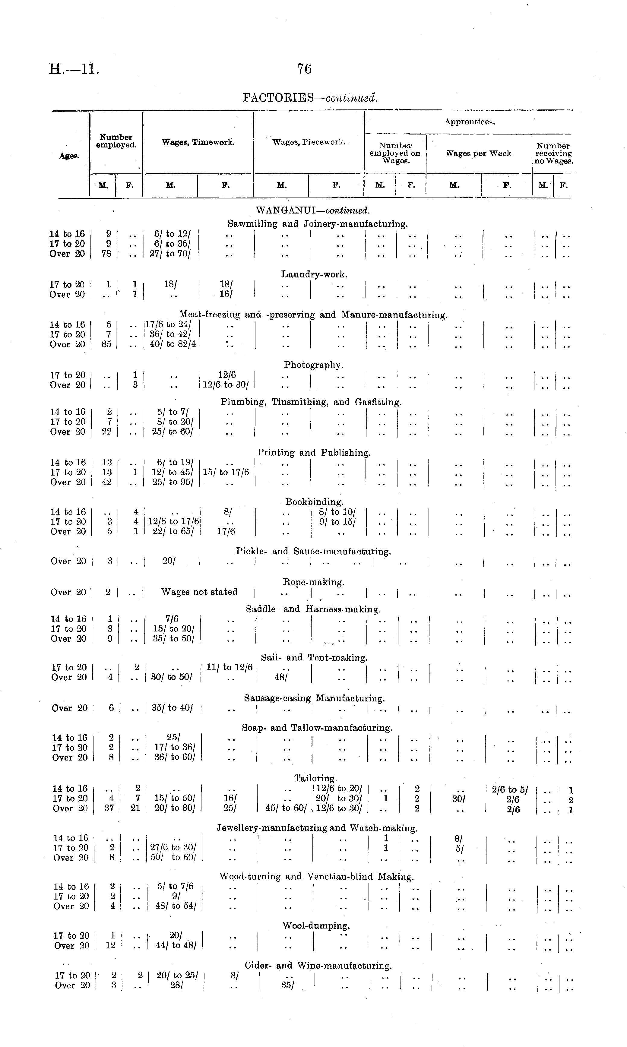 .ppreni ;ices. Number employed. Wages, Timework. Wages, Piecework. Number | employed on Wages. Wages per Week Number receiving no Wages. Aees. M. F. M. F. M. f F. I M. P. M. p. M. i P. WANGANUI— continued. Sawmilling and Joinery-manufacturing. 14 to 16 9 .. : 6/ to 12/ .. .. .. I .. .. j 17 to 20 9 .. 6/ to 35/ .. .. .. .. .. ... Over 20 78 .. 27/ to 70/ I Laundry-work. 17 to 20 1 1 18/ 18/ Over 20 .. " 1 .. I 16/ . . .. Meat-freezing and -preserving and Manure-manufacturing. 14 to 16 5 .. 17/6 to 24/ 17 to 20 7 .. 36/ to 42/ Over 20 85 .. 40/ to 82/4 I Photography. 17 to 20 I .. 1 .. 12/6 .. .. Over 20 I .. 3 .. 12/6 to 30/ Plumbing, Tinsmithing, and Gasfitting. 14 to 16 [ 2 5/ to 7/ .. .. I 17 to 20 7 .. 8/ to 20/ Over 20 22 .. 25/ to 60/ Printing and Publishing. 14 to 16 13 .. 6/ to 19/ 17 to 20 13 1 12/ to 45/ 15/ to 17/6 Over 20 I 42 .. 25/ to 95/ Bookbinding. 14 to 16 .. I 4 .. 8/ .. , 8/ to 10/ 17 to 20 3 4 J 12/6 to 17/6 .. .. 9/ to 15/ Over 20 5| 1 22/to 65/ 17/6 Pickle- and Sauce-manufaoturing. Over 20 I 3 [ .. I 20/ | .. | .. ] .. .. | .. j Rope-making. Over 20 J 2 j .. | Wages not stated | .. | .. | .. | .. | I •■ I •• I •• Saddle- and Harness-making. 14 to 16 1 I .. 7/6 .. .. .. .. .. I 17 to 20 3 j .. 15/ to 20/ Over 20 9 j .. 35/ to 50/ Sail- and Tent-making. 17 to 20 .. 2 .. I 11/ to 12/6 .. .. .... Over 20 4 .. 30/ to 50/ .. 48/ Sausage-casing Manufacturing. Over 20 i 6 [ .. j 35/ to 40/ .. .. | .. ' | .. .. | Soap- and Tallow-manufacturing. 14 to 16 2 .. I 25/ 17 to 20 2 .. 17/ to 36/ Over 20 8 .. 36/ to 60/ Tailoring. 14 to 16 i .. : 2 .. .. .. j 12/6 to 20/ .. 2 17 to 20 ! 4 ! 7 15/ to 50/ 16/ .. 20/ to 30/ 1 2 30/ Over 20 ; 37 ' 21 20/ to 80/ 25/ 45/ to 60/ 12/6 to 30/ | .. 2 2/6 to 5/ .. 1 2/6 .. 2 I 2/6 .. 1 Jewellery-manufacturing and Watch-making. 14 to 16 I .... .. .. .. .. 1 .. 8/ 17 to 20 2 .. 27/6 to 30/ .. .. .. 1 5/ Over 20 8 • .. 50/ to 60/ I .. Wood-turning and Venetian-blind Making. 14 to 16 2 .. I 5/ to 7/6 , 17 to 20 2 9/ .. .. Over 20 4 .. 48/ to 54/ [ Wool-dumping. 17 to 20 1 i .. 20/ .. .. ■ • .. I .. Over 20 12 I .. 44/ to 48/ .. .. .. Cider- and Wine-manufacturing. 17 to 20 ' 2 2 i 20/to 25/ 8/ .. I Over 20 : 3 28/ .. 35/ >