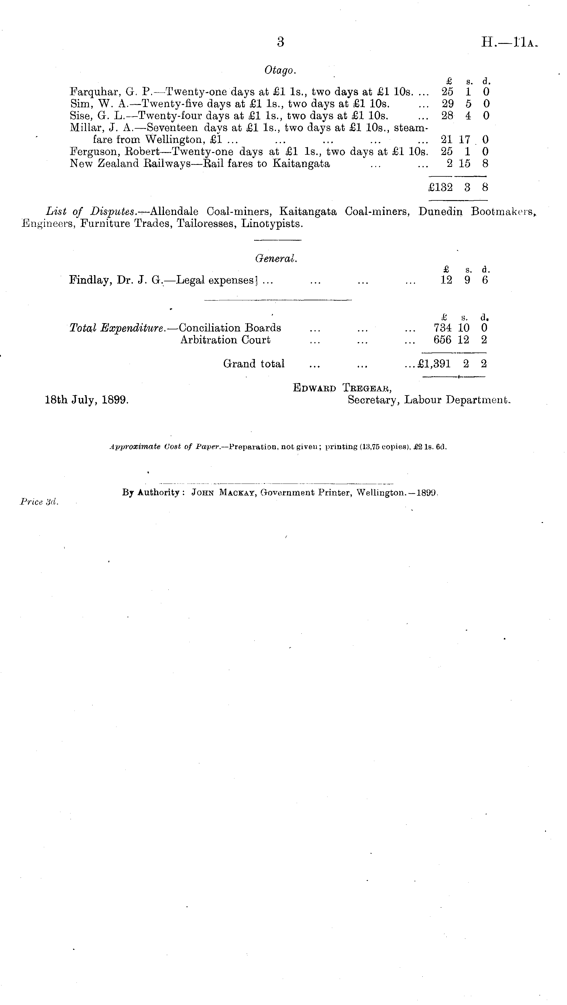 Otago. £ s. d. Farquhar, G. P.—Twenty-one days at £1 Is., two days at £1 10s. ... 25 1 0 Sim, W. A.—Twenty-five days at £1 Is., two days at £1 10s. ... 29 5 0 Sise, G. L.—Twenty-four days at £1 Is., two days at £1 10s. ... 28 4 0 Millar, J. A.—Seventeen days at £1 Is., two days at £1 10s., steamfare from Wellington, £1 ... ... ... ... ... 21 17 0 Ferguson, Bobert —Twenty-one days at £1 Is., two days at £1 10s. 25 1 0 New Zealand Bailways—Bail fares to Kaitangata ... ... 215 8 £132 3 8 List of Disputes. —Allendale Coal-miners, Kaitangata Coal-miners, Dunedin Bootmakers, Engineers, Furniture Trades, Tailoresses, Linotypists. General. £ s. d. Findlay, Dr. J. G.—Legal expenses] ... ... ... ... 12 9 6 £ s. d. Total Expenditure. —Conciliation Boards ... ... ... 734 10 0 Arbitration Court ... ... ... 656 12 2 Grand total ... ... ...£1,391 2 2 Edward Tregeak, 18th July, 1899. Secretary, Labour Department. App)-oximate Cost of Paper. —Preparation, not given ; printing (13,75 copies), £2 Is. 6d.