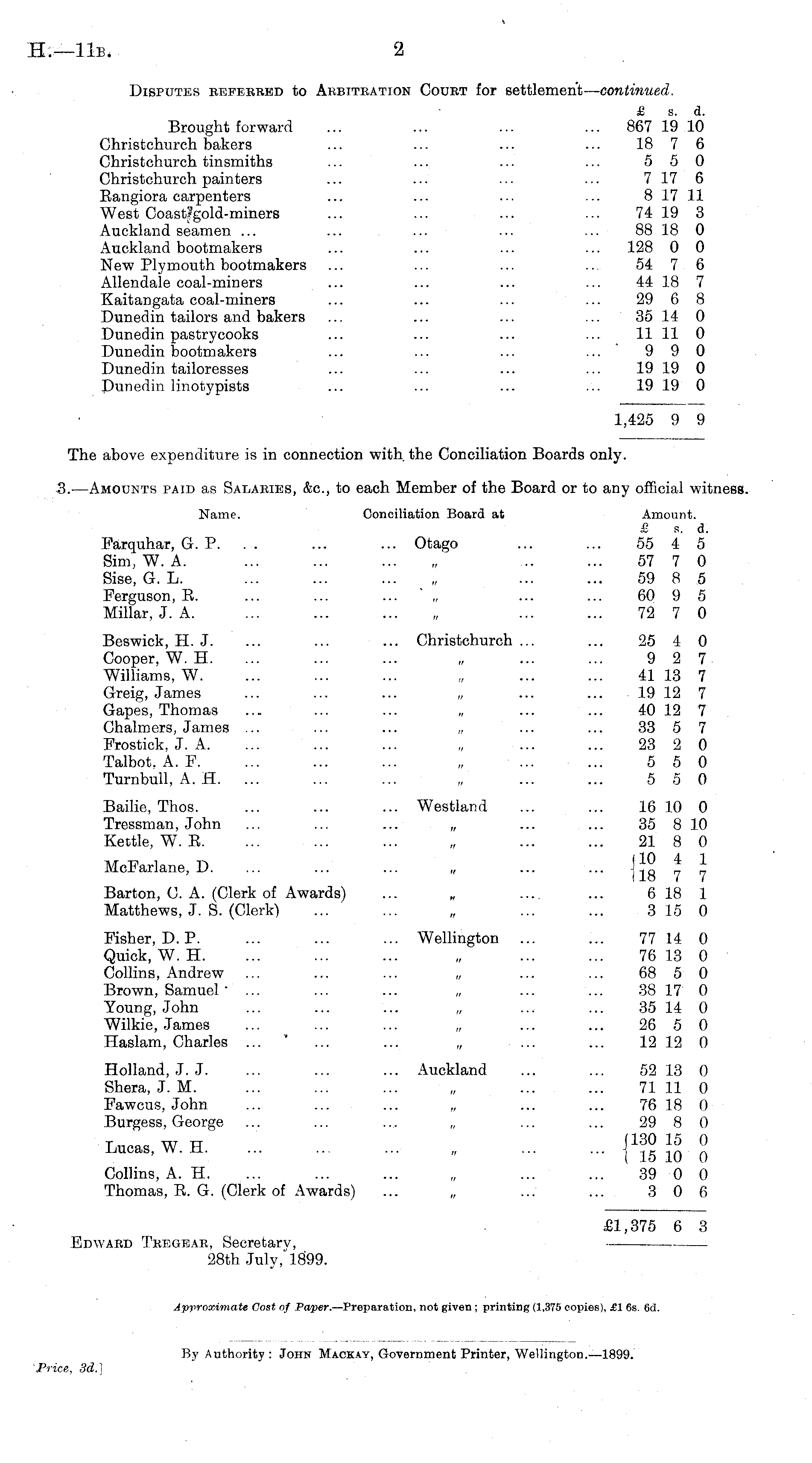 Disputes referred to Arbitration Court for settlement— continued. £ s. d. Brought forward ... ... ... ... 867 19 10 Christchurch bakers ... ... ... ... 18 7 6 Christchurch tinsmiths ... ... ... ... 550 Christchurch painters ... ... ... ... 7 17 6 Eangiora carpenters ... ... ... ... 8 17 11 West Coastjgold-miners ... ... ... ... 74 19 3 Auckland seamen ... ... ... ... ... 88 18 0 Auckland bootmakers ... ... ... ... 128 0 0 New Plymouth bootmakers ... ... ... ... 54 7 6 Allendale coal-miners ... ... ... ... 44 18 7 Kaitangata coal-miners ... ... ... ... 29 6 8 Dunedin tailors and bakers ... ... ... ... 35 14 0 Dunedin pastrycooks ... ... ... ... 11 11 0 Dunedin bootmakers ... ... ... ... 990 Dunedin tailoresses ... ... ... ... 19 19 0 Dunedin linotypists ... ... ... ... 19 19 0 1,425 9 9 The above expenditure is in connection with, the Conciliation Boards only. 3.—Amounts paid as Salaries, &c, to each Member of the Board or to any official witness. Name. Conciliation Board at Amount. £ s. d. Farquhar, G. P. . . ... ... Otago ... ... 55 4 5 Sim, W. A. ... ... ... „ ... ... 57 7 0 Sise, G. L. ... ... ... „ ... ... 59 8 5 Ferguson, E. ... ... ... " „ ... ... 60 9 5 Millar, J. A. ... ... ... „ ... ... 72 7 0 Beswick, H. J. ... ... ... Christchurch ... ... 25 4 0 Cooper, W. H. ... ... ... „ ... ... 9 2 7 Williams, W. ... ... ... „ ... ... 4113 7 Greig, James ... ... ... „ ... ... 19 12 7 Gapes, Thomas ... ... ... „ ... ... 40 12 7 Chalmers, James ... ... ... „ ... ... 33 5 7 Frostick, J. A. ... ... ... „ ... ... 23 2 0 Talbot. A. F. ... ... ... „ ... ... 5 5 0 Turnbull, A. H. ... ... ... „ ... ... 5 5 0 Bailie, Thos. ... ... ... Westland ... ... .16 10 0 Tressman, John ... ... ... „ ... ... 35 810 Kettle, W. E. ... ... ... „ ... ... 21 8 0 McFarlane, D „ \]9. * 1 Barton, 0. A. (Clerk of Awards) ... „ .... ... 6 18 1 Matthews, J. S. (Clerk) ... ... „ ... ... 3 15 0 Fisher, D. P. ... ... ... Wellington ... ... 77 14 0 Quick, W. H. ... ... ... „ ... ... 76 13 0 Collins, Andrew ... ... ... „ ... ... 68 5 0 Brown, Samuel • ... ... ... „ ... ... 38 17 0 Young, John ... ... ... „ ... ... 35 14 0 Wilkie, James ... ... ... „ ... ... 26 5 0 Haslam, Charles ... ... ... „ ... ... 12 12 0 Holland, J. J. ... ... ... Auckland ... ... 52 13 0 Shera, J. M. ... ... ... „ ... ... 71 11 0 Fawcus, John ... ... ... „ ... ... 76 18 0 Burgess, George ... ... ... „ ... ... 29 8 0 l»-.w.h. juoij.o Collins, A. H. ... ... ... „ ... ... 39 0 0 Thomas, E. G. (Clerk of Awards) ... „ ... ... 3 0 6 £1,375 6 3 Edward Tregear, Secretary, 28th July," 18"99. Approximate Cost of Pa/per. —Preparation, not given ; printing (1,375 copies), £1 6s. 6d.