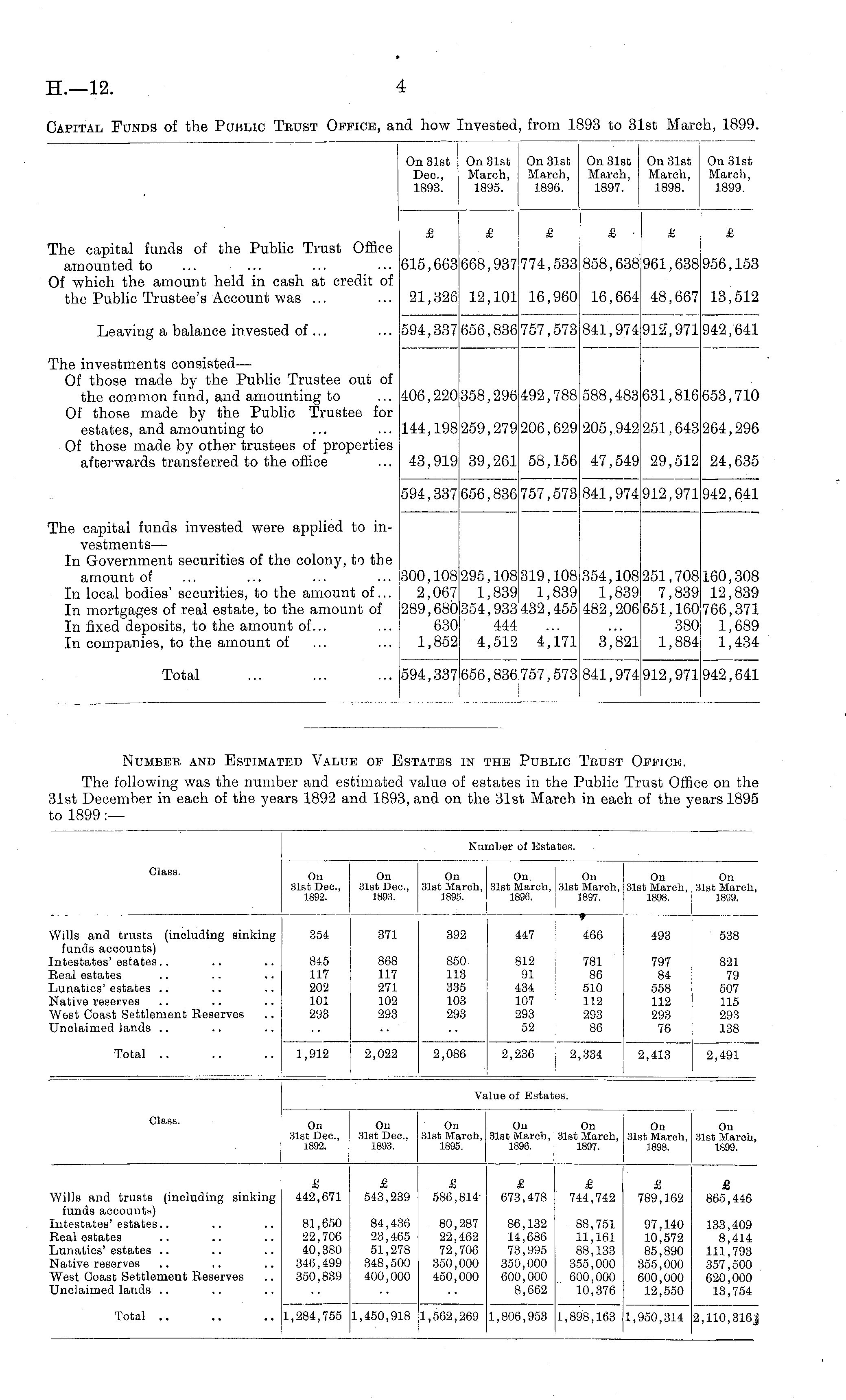 Number and Estimated Value of Estates in the Public Trust Office. The following was the number and estimated value of estates in the Public Trust Office on the 31st December in each of the years 1892 and 1893, and on the 31st March in each of the years 1895 to 1899:—
