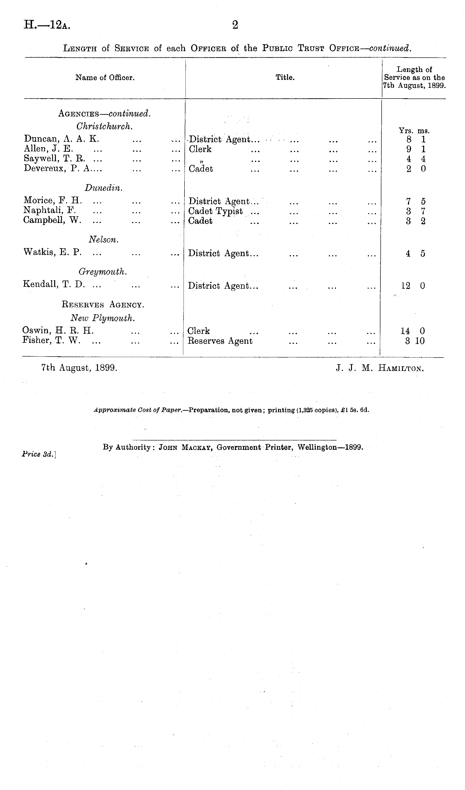 Name of Officer. Title. Length of Service as on the 7th August, 1899. Agencies— continued. Chris tchurch. Duncan, A. A. K. Allen, J. B. Say well, T. E. ... Devereux, P. A.... District Agent... Clerk Yrs. ma. 8 1 9 1 4 4 2 0 Cadet Dunedin. District Agent... Cadet Typist ... Cadet 7 5 3 7 3 2 Morice, F. H. ... Naphtali, F. Campbell, W. ... Nelson. District Agent... 4 5 Watkis, E. P. ... Greymouth. 12 0 Kendall, T. D. ... District Agent... Reseeves Agency. New Plymouth. Oswin, H. E. H. Fisher, T. W. ... Clerk Beserves Agent 14 0 3 10