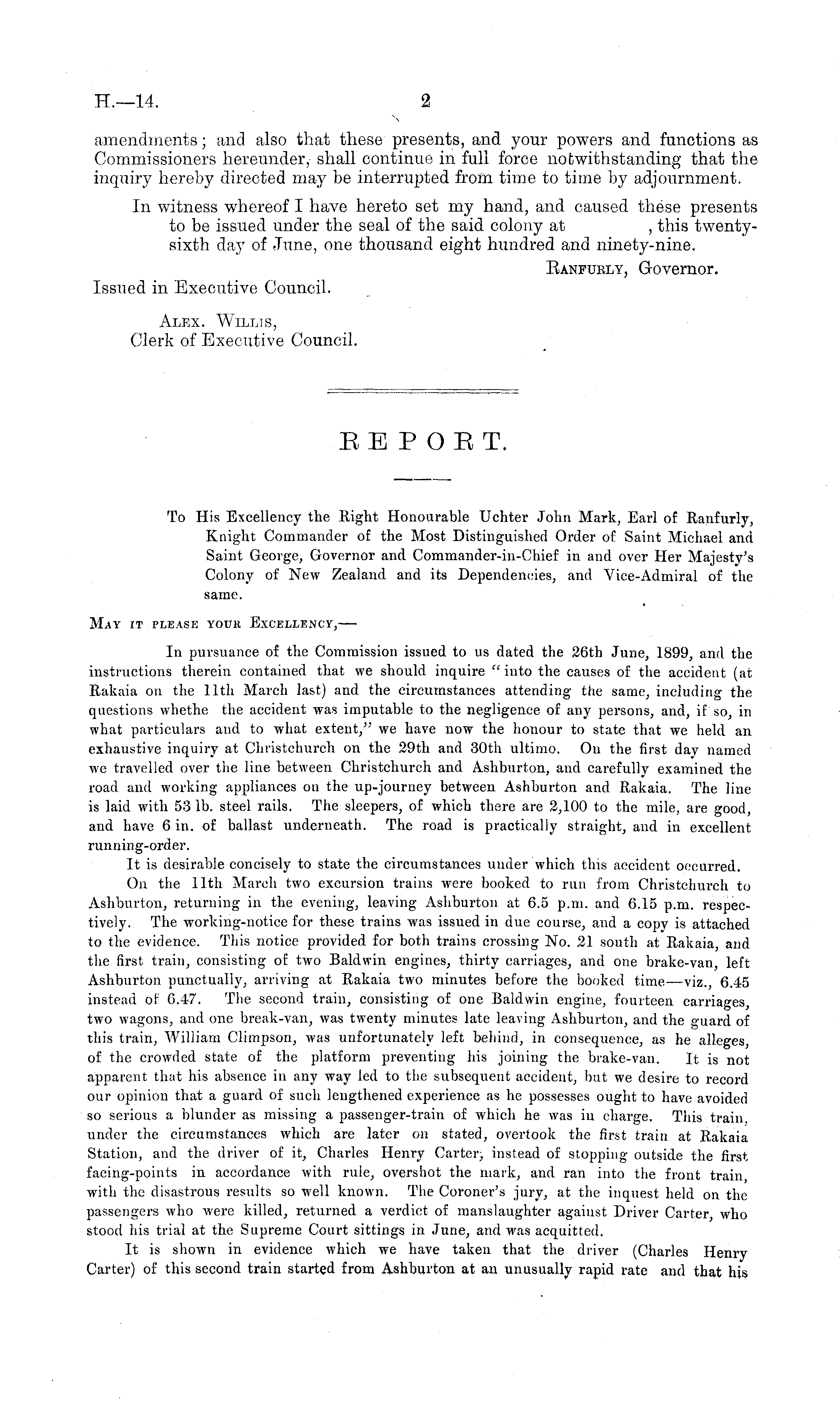 To His Excellency the Right Honourable Uchter John Mark, Earl of Ranfurly, Knight Commander of the Most Distinguished Order of Saint Michael and Saint George, Governor and Commander-in-Chief in and over Her Majesty's Colony of New Zealand and its Dependencies, and Vice-Admiral of the same. May it please youk Excellency,— In pursuance of the Commission issued to us dated the 26th June, 1899, and the instructions therein contained that we should inquire "into the causes of the accident (at Rakaia on the 11th March last) and the circumstances attending the same, including the questions whethe the accident was imputable to the negligence of any persons, and, if so, in what particulars and to what extent," we have now the honour to state that we held an exhaustive inquiry at Christchurch on the 29th and 30th ultimo. On the first day named we travelled over the line between Christchurch and Ashburton, and carefully examined the road and working appliances on the up-journey between Ashburton and Rakaia. The line is laid with 53 lb. steel rails. The sleepers, of which there are 2,100 to the mile, are good, and have 6 in. of ballast underneath. The road is practically straight, and in excellent running-order. It is desirable concisely to state the circumstances under which this accident occurred. On the 11th March two excursion trains were booked to run from Christchurch to Ashburton, returning in the evening, leaving Ashburton at 6.5 p.m. and 6.15 p.m. respectively. The working-notice for these trains was issued in due course, and a copy is attached to the evidence. This notice provided for both trains crossing No. 21 south at Rakaia, and the first train, consisting of two Baldwin engines, thirty carriages, and one brake-van, left Ashburton punctually, arriving at Rakaia two minutes before the booked time —viz., 6.45 instead of 6.47. The second train, consisting of one Baldwin engine, fourteen carriages, two wagons, and one break-van, was twenty minutes late leaving Ashburton, and the guard of this train, William Climpson, was unfortunately left behind, in consequence, as he alleges, of the crowded state of the platform preventing his joining the brake-van. It is not apparent that his absence in any way led to the subsequent accident, but we desire to record our opinion that a guard of such lengthened experience as he possesses ought to have avoided so serious a blunder as missing a passenger-train of which he was in charge. This train under the circumstances which are later on stated, overtook the first train at Rakaia Station, and the driver of it, Charles Henry Carter, instead of stopping outside the first facing-points in accordance with rule, overshot the mark, and ran into the front train, with the disastrous results so well known. The Coroner's jury, at the inquest held on the passengers who were killed, returned a verdict of manslaughter against Driver Carter, who stood his trial at the Supreme Court sittings in June, and was acquitted. It is shown in evidence which we have taken that the driver (Charles Henry Carter) of this second train started from Ashburton at an unusually rapid rate and that his