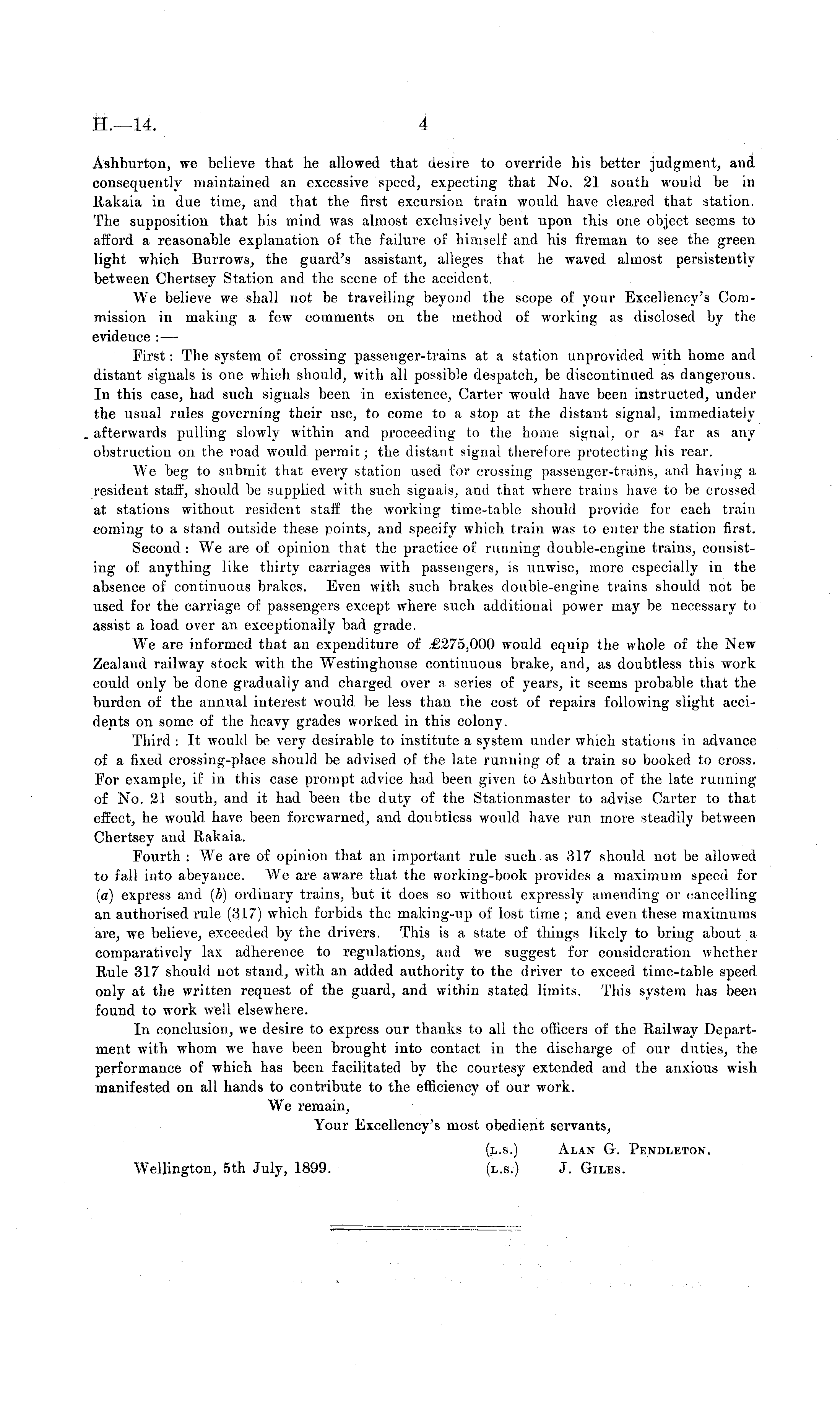 Ashburton, we believe that he allowed that desire to override his better judgment, and consequently maintained an excessive speed, expecting that No. 21 south would be in Rakaia in due time, and that the first excursion train would have cleared that station. The supposition that his mind was almost exclusively bent upon this one object seems to afford a reasonable explanation of the failure of himself and his fireman to see the green light which Burrows, the guard's assistant, alleges that he waved almost persistently between Chertsey Station and the scene of the accident. We believe we shall not be travelling beyond the scope of your Excellency's Commission in making a few comments on the method of working as disclosed by the evidence :— First: The system of crossing passenger-trains at a station unprovided with home and distant signals is one which should, with all possible despatch, be discontinued as dangerous. In this case, had such signals been in existence, Carter would have been instructed, under the usual rules governing their use, to come to a stop at the distant signal, immediately afterwards pulling slowly within and proceeding to the home signal, or as far as any obstruction on the road would permit; the distant signal therefore protecting his rear. We beg to submit that every station used for crossing passenger-trains, and having a resident staff, should be supplied with such signals, and that where trains have to be crossed at stations without resident staff the working time-table should provide for each train coming to a stand outside these points, and specify which train was to enter the station first. Second : We are of opinion that the practice of running double-engine trains, consisting of anything like thirty carriages with passengers, is unwise, more especially in the absence of continuous brakes. Even with such brakes double-engine trains should not be used for the carriage of passengers except where such additional power may be necessary to assist a load over an exceptionally bad grade. We are informed that an expenditure of £275,000 would equip the whole of the New Zealand railway stock with the Westinghouse continuous brake, and, as doubtless this work could only be done gradually and charged over a series of years, it seems probable that the burden of the annual interest would be less than the cost of repairs following slight accidents on some of the heavy grades worked in this colony. Third : It would be very desirable to institute a system under which stations in advance of a fixed crossing-place should be advised of the late running of a train so booked to cross. For example, if in this case prompt advice had been given to Ashburton of the late running of No. 21 south, and it had been the duty of the Stationmaster to advise Carter to that effect, he would have been forewarned, and doubtless would have run more steadily between Chertsey and Rakaia. Fourth : We are of opinion that an important rule such as 317 should not be allowed to fall into abeyance. We are aware that the working-book provides a maximum speed for (a) express and (h) ordinary trains, but it does so without expressly amending or cancelling an authorised rule (317) which forbids the making-up of lost time ; and even these maximums are, we believe, exceeded by the drivers. This is a state of things likely to bring about a comparatively lax adherence to regulations, and we suggest for consideration whether Rule 317 should not stand, with an added authority to the driver to exceed time-table speed only at the written request of the guard, and within stated limits. This system has been found to work well elsewhere. In conclusion, we desire to express our thanks to all the officers of the Railway Department with whom we have been brought into contact in the discharge of our duties, the performance of which has been facilitated by the courtesy extended and the anxious wish manifested on all hands to contribute to the efficiency of our work. We remain, Your Excellency's most obedient servants, (1.5.) Alan G. Pe.ndleton. Wellington, sth July, 1899. (1.5.) J. Giles.