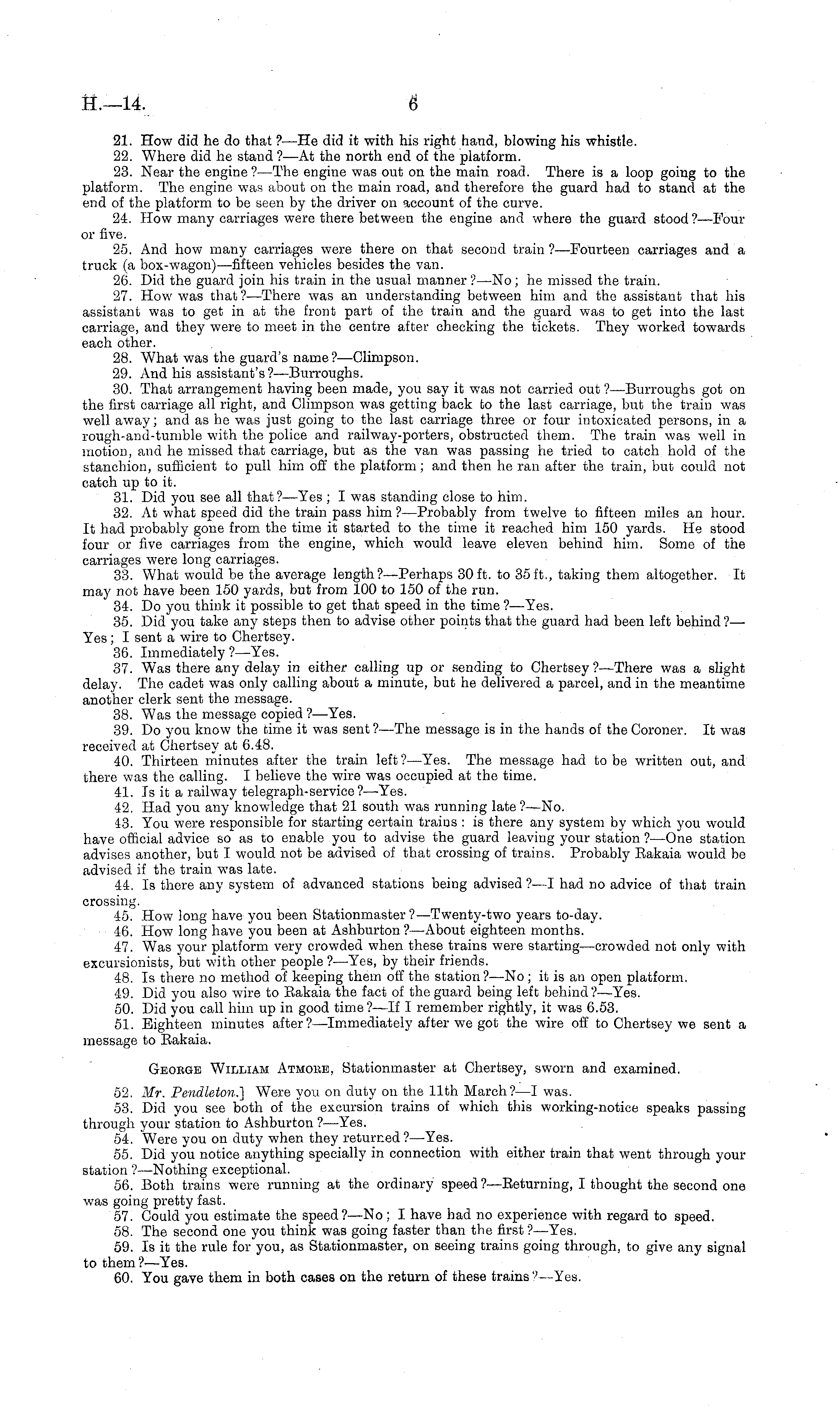 21. How did he do that ?—He did it with his right hand, blowing his whistle. 22. Where did he stand ?—At the north end of the platform. 23. Near the engine ?—The engine was out on the main road. There is a loop going to the platform. The engine was about on the main road, and therefore the guard had to stand at the end of the platform to be seen by the driver on account of the curve. 24. How many carriages were there between the engine and where the guard stood ?—Four or five. 25. And how many carriages were there on that second train ?—Fourteen carriages and a truck (a box-wagon) —fifteen vehicles besides the van. 26. Did the guard join his train in the usual manner ? —No ; he missed the train. 27. How was that?— There was an understanding between him and the assistant that his assistant was to get in at the front part of the train and the guard was to get into the last carriage, and they were to meet in the centre after checking the tickets. They worked towards each other. 28. What was the guard's name? —Climpson. 29. And his assistant's? —Burroughs. 30. That arrangement having been made, you say it was not carried out ?—Burroughs got on the first carriage all right, and Climpson was getting back to the last carriage, but the train was well away; and as he was just going to the last carriage three or four intoxicated persons, in a rough-and-tumble with the police and railway-porters, obstructed them. The train was well in motion, and he missed that carriage, but as the van was passing he tried to catch hold of the stanchion, sufficient to pull him off the platform; and then he ran after the train, but could not catch up to it. 31. Did you see all that?— Yes; I was standing close to him. 32. At what speed did the train pass him? —Probably from twelve to fifteen miles an hour. It had probably gone from the time it started to the time it reached him 150 yards. He stood four or five carriages from the engine, which would leave eleven behind him. Some of the carriages were long carriages. 33. What would be the average length?— Perhaps 30ft. to 35ft., taking them altogether. It may not have been 150 yards, but from 100 to 150 of the run. 34. Do you think it possible to get that speed in the time ? —Yes. 35. Did you take any steps then to advise other points that the guard had been left behind ?— Yes; I sent a wire to Chertsey. 36. Immediately ? —Yes. 37. Was there any delay in either calling up or sending to Chertsey ?—There was a slight delay. The cadet was only calling about a minute, but he delivered a parcel, and in the meantime another clerk sent the message. 38. Was the message copied ?—Yes. 39. Do you know the time it was sent?— The message is in the hands of the Coroner. It was received at Chertsey at 6.48. 40. Thirteen minutes after the train left ?—Yes. The message had to be written out, and there was the calling. I believe the wire was occupied at the time. 41. Is it a railway telegraph-service?— Yes. 42. Had you any knowledge that 21 south was running late ?—No. 43. You were responsible for starting certain trains : is there any system by which you would have official advice so as to enable you to advise the guard leaving your station ?—One station advises another, but I would not be advised of that crossing of trains. Probably Eakaia would be advised if the train was late. 44. Is there any system of advanced stations being advised ?—I bad no advice of that train crossing. 45. How long have you been Stationmaster ?—Twenty-two years to-day. 46. How long have you been at Ashburton ? —About eighteen months. 47. Was your platform very crowded when these trains were starting—crowded not only with excursionists, but with other people ?—Yes, by their friends. 48. Is there no method of keeping them off the station? —No; it is an open platform. 49. Did you also wire to Bakaia the fact of the guard being left behind?— Yes. 50. Did you call him up in good time ?—lf I remember rightly, it was 6.53. 51. Eighteen minutes after?—lmmediately after we got the wire off to Chertsey we sent a message to Eakaia. Geoegb William Atmoke, Stationmaster at Chertsey, sworn and examined. 52. Mr. Pendleton.] Were you on duty on the 11th March? —I was. 53. Did you see both of the excursion trains of which this working-notice speaks passing through your station to Ashburton ?—Yes. 54. Were you on duty when they returned ?—Yes. 55. Did you notice anything specially in connection with either train that went through your station ?—Nothing exceptional. 56. Both trains were running at the ordinary speed?—Eeturning, I thought the second one was going pretty fast. 57. Could you estimate the speed?—No; I have had no experience with regard to speed. 58. The second one you think was going faster than the first ?—Yes. 59. Is it the rule for you, as Stationmaster, on seeing trains going through, to give any signal to them?— Yes. 60. You gave them in both cases on the return of these trains-I—Yes.1 —Yes.
