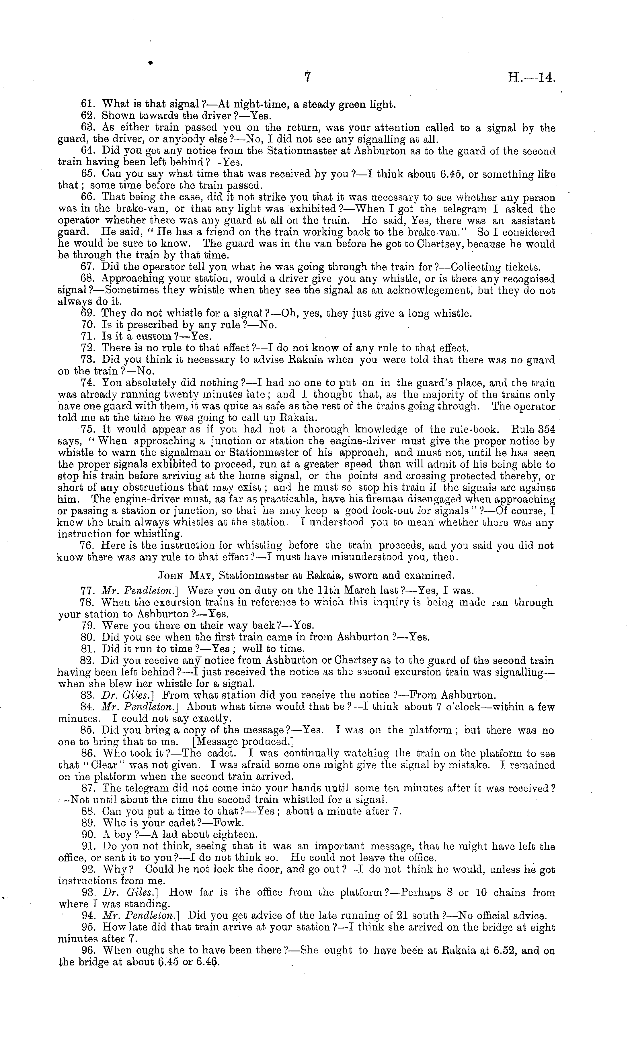 61. What is that signal?—At night-time, a steady green light. 62. Shown towards the driver ? —Yes. 63. As either train passed you on the return, was your attention called to a signal by the guard, the driver, or anybody else? —No, I did not see any signalling at all. 64. Did you get any notice from the Stationmaster at Ashburton as to the guard of the second train having been left behind ? —Yes. 65. Can you say what time that was received by you ?—I think about 6.45, or something like that; some time before the train passed. 66. That being the case, did it not strike you that it was necessary to see whether any person was in the brake-van, or that any light was exhibited ? —When I got the telegram I asked the operator whether there was any guard at all on the train. He said, Yes, there was an assistant guard. He said, "He has a friend on the train working back to the brake-van." So I considered he would be sure to know. The guard was in the van before he got to Chertsey, because he would be through the train by that time. 67. Did the operator tell you what he was going through the train for?— Collecting tickets. 68. Approaching your station, would a driver give you any whistle, or is there any recognised signal?— Sometimes they whistle when they see the signal as an acknowlegement, but they do not always do it. 69. They do not whistle for a signal ?—Oh, yes, they just give a long whistle. 70. Is it prescribed by any rule ?—No. 71. Is it a custom ?—Yes. 72. There is no rule to that effect ?—I do not know of any rule to that effect. 73. Did you think it necessary to advise Eakaia when you were told that there was no guard on the train ?—No. 74. You absolutely did nothing?—l had no one to put on in the guard's place, and the train was already running twenty minutes late ; and I thought that, as the majority of the trains only have one guard with them, it was quite as safe as the rest of the trains going through. The operator told me at the time he was going to call up Eakaia. 75. It would appear as if you had not a thorough knowledge of the rule-book. Eule 354 says, "When approaching a junction or station the engine-driver must give the proper notice by whistle to warn the signalman or Stationmaster of his approach, and must not, until he has seen the proper signals exhibited to proceed, run at a greater speed than will admit of his being able to stop his train before arriving at the home signal, or the points and crossing protected thereby, or short of any obstructions that may exist; and he must so stop his train if the signals are against him. The engine-driver must, as far as practicable, have his fireman disengaged when approaching or passing a station or junction, so that he may keep a good look-out for signals " ?—Of course, I knew the train always whistles at the station. I understood you to mean whether there was any instruction for whistling. 76. Here is the instruction for whistling before the train proceeds, and you said you did not know there was any rule to that effect? —I must have misunderstood you, then. John May, Stationmaster at Eakaia, sworn and examined. 77. Mr. Pendleion.] Were you on duty on the 11th March last ? —Yes, I was. 78. When the excursion trains in reference to which this inquiry is being made ran through your station to Ashburton ?—Yes. 79. Were you there on their way back?— Yes. 80. Did you see when the first train came in from Ashburton ?—Yes. 81. Did it run to time ?—Yes ; well to time. 82. Did you receive any notice from Ashburton or Chertsey as to the guard of the second train having been left behind?—l just received the notice as the second excursion train was signalling— when she blew her whistle for a signal. 83. Dr. Giles.] From what station did you receive the notice ?—From Ashburton. 84. Mr. Pendleton.] About what time would that be ? —I think about 7 o'clock—within a few minutes. I could not say exactly. 85. Did you bring a copy of the message?—Ye3. I was on the platform ; but there was no one to bring that to me. [Message produced.] 86. Who took it ? —The cadet. I was continually watching the train on the platform to see that "Clear" was not given. I was afraid some one might give the signal by mistake. I remained on the platform when the second train arrived. 87. The telegram did not come into your hands until some ten minutes after it was received? ' —Not until about the time the second train whistled for a signal. 88. Can you put a time to that ?—Yes ; about a minute after 7. 89. Who is your cadet ?—Fowk. 90. A boy ? —A lad about eighteen. 91. Do you not think, seeing that it was an important message, that he might have left the office, or sent it to you?—l do not think so. He could not leave the office. 92. Why ? Could he not lock the door, and go out ?—I do "not think he would, unless he got instructions from me. 93. Dr. Giles.] How far is the office from the platform?— Perhaps 8 or 10 chains from where I was standing. 94. Mr. Did you get advice of the late running of 21 south ? —No official advice. 95. How late did that train arrive at your station?—l think she arrived on the bridge at eight minutes after 7. 96. When ought she to have been there ?—She ought to have been at Eakaia at 6.52, and on the bridge at about 6.45 or 6.46.