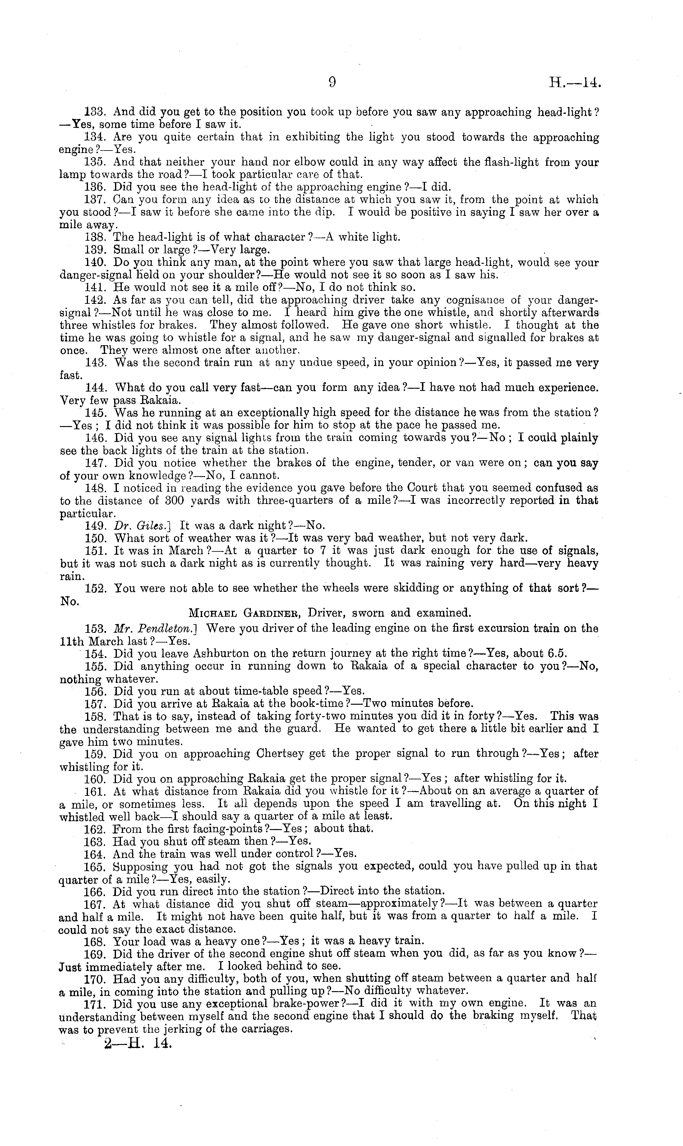 133. And did you get to the position you took up before you saw any approaching head-light? —Yes, some time before I saw it. 134. Are you quite certain that in exhibiting the light you stood towards the approaching engine?— Yes. 135. And that neither your hand nor elbow could in any way affect the flash-light from your lamp towards the road?—l took particular cai'e of that. 136. Did you see the head-light of the approaching engine ?—I did. 137. Can you form any idea as to the distance at which you saw it, from the point at which you stood ? —I saw it before she came into the dip. I would be positive in saying I saw her over a mile away. 138. The head-light is of what character ? —A white light. 139. Small or large ?—Very large. 140. Do you think any man, at the point where you saw that large head-light, would see your danger-signal held on your shoulder?—He would not see it so soon as I saw his. 141. He would not see it a mile off? —No, I do not think so. 142. As far as you can tell, did the approaching driver take any cognisance of your dangersignal ? —Not until he was close to me. I heard him give the one whistle, and shortly afterwards three whistles for brakes. They almost followed. He gave one short whistle. I thought at the time he was going to whistle for a signal, and he saw my danger-signal and signalled for brakes at once. They were almost one after another. 143. Was the second train run at any undue speed, in your opinion ?—Yes, it passed me very fast. 144. What do you call very fast—can you form any idea ?—I have not had much experience. Very few pass Eakaia. 145. Was he running at an exceptionally high speed for the distance he was from the station? —Yes ; I did not think it was possible for him to stop at the pace he passed me. 146. Did you see any signal lights from the train coming towards you?—No ; I could plainly see the back lights of the train at the station. 147. Did you notice whether the brakes of the engine, tender, or van were on; can you say of your own knowledge? —No, I cannot. 148. I noticed in reading the evidence you gave before the Court that you seemed confused as to the distance of 300 yards with three-quarters of a mile ?—I was incorrectly reported in that particular. 149. Dr. Giles.] It was a dark night ?—No. 150. What sort of weather was it ? —lt was very bad weather, but not very dark. 151. It was in March ? —At a quarter to 7 it was just dark enough for the use of signals, but it was not such a dark night as is currently thought. It was raining very hard—very heavy rain. 152. You were not able to see whether the wheels were skidding or anything of that sort ?— No. Michael Gakdineb, Driver, sworn and examined. 153. Mr. Pendleton.] Were you driver of the leading engine on the first excursion train on the 11th March last ?—Yes. 154. Did you leave Ashburton on the return journey at the right time?— Yes, about 6.5. 155. Did anything occur in running down to Eakaia of a special character to you?—No, nothing whatever. 156. Did you run at about time-table speed?— Yes. 157. Did you arrive at Bakaia at the book-time?— Two minutes before. 158. That is to say, instead of taking forty-two minutes you did it in forty?— Yes. This was the understanding between me and the guard. He wanted to get there a little bit earlier and I gave him two minutes. 159. Did you on approaching Chertsey get the proper signal to run through ?—Yes; after whistling for it. 160. Did you on approaching Bakaia get the proper signal?— Yes ; after whistling for it. 161. At what distance from Bakaia did you whistle for it ?—About on an average a quarter of a mile, or sometimes less. It all depends upon the speed I am travelling at. On this night I whistled well back —I should say a quarter of a mile at least. 162. From the first facing-points?— Yes; about that. 163. Had you shut off steam then ? —Yes. 164. And the train was well under control ? —Yes. 165. Supposing you had not got the signals you expected, could you have pulled up in that quarter of a mile ? —Yes, easily. 166. Did you run direct into the station ? —Direct into the station. 167. At what distance did you shut off steam —approximately? —It was between a quarter and half a mile. It might not have been quite half, but it was from a quarter to half a mile. I could not say the exact distance. 168. Your load was a heavy one ?—Yes ; it was a heavy train. 169. Did the driver of the second engine shut off steam when you did, as far as you know ?— Just immediately after me. I looked behind to see. 170. Had you any difficulty, both of you, when shutting off steam between a quarter and half a mile, in coming into the station and pulling up ? —No difficulty whatever. 171. Did you use any exceptional brake-power? —I did it with my own engine. It was an understanding between myself and the second engine that I should do the braking myself, That was to prevent the jerking of the carriages. 2—H. 14.